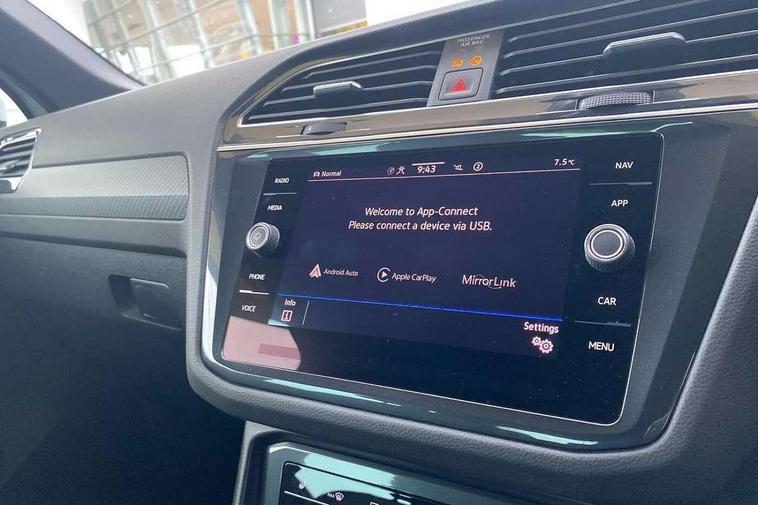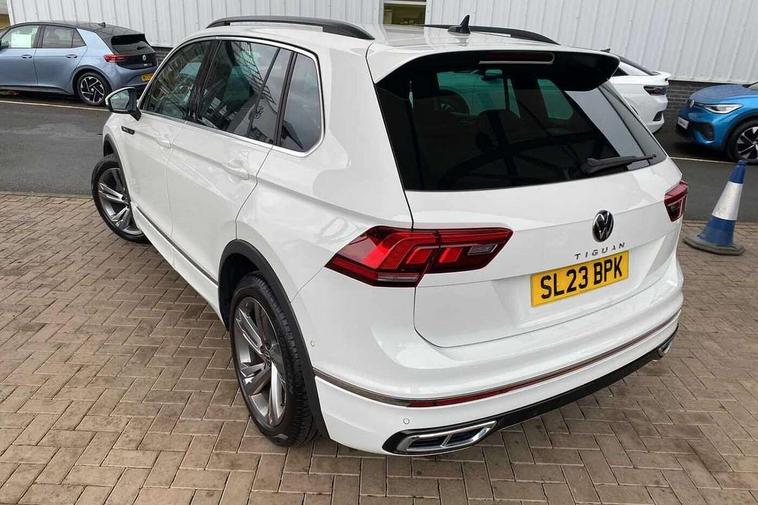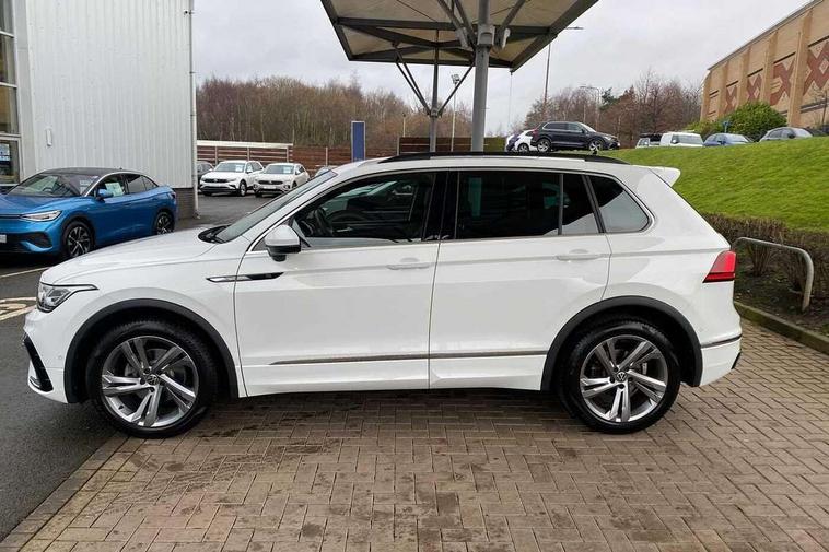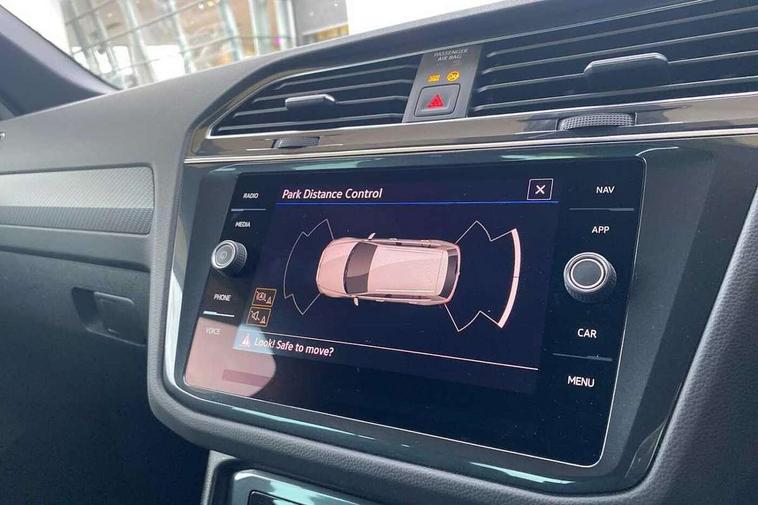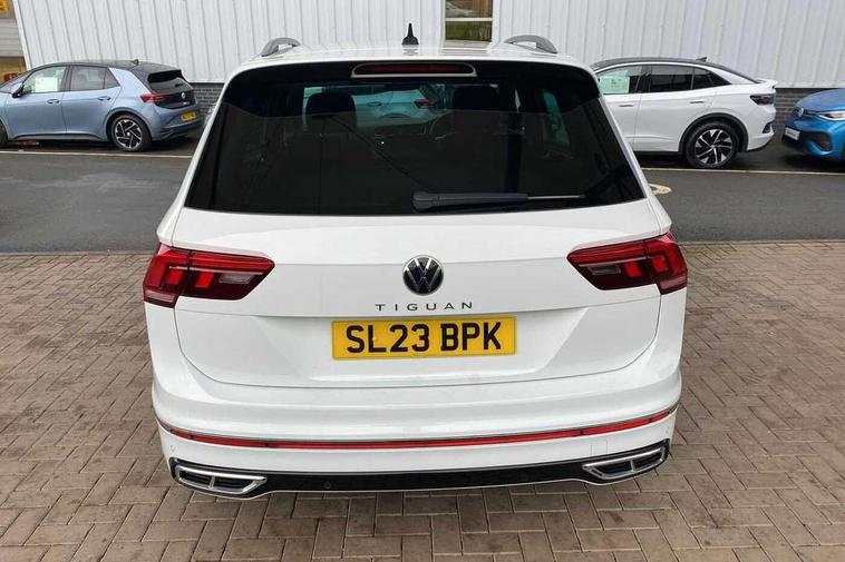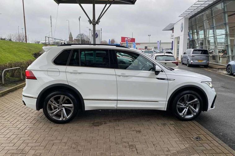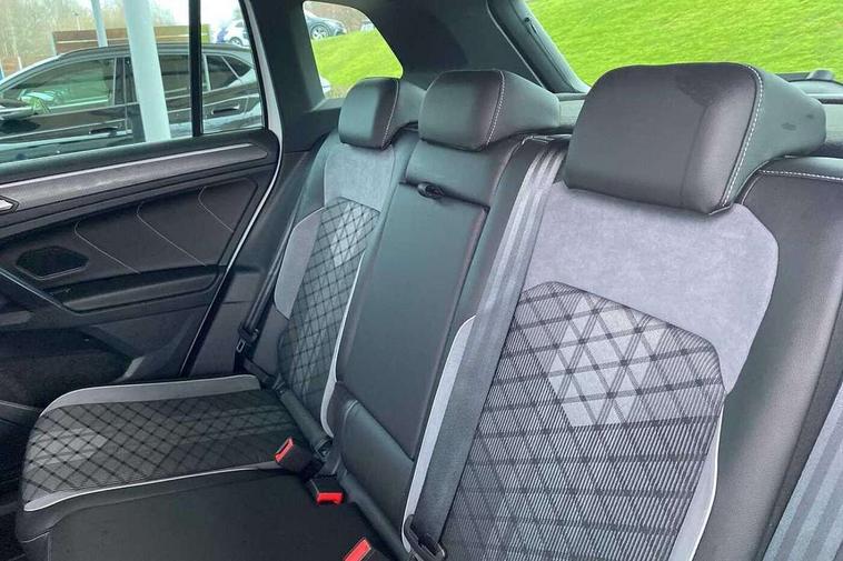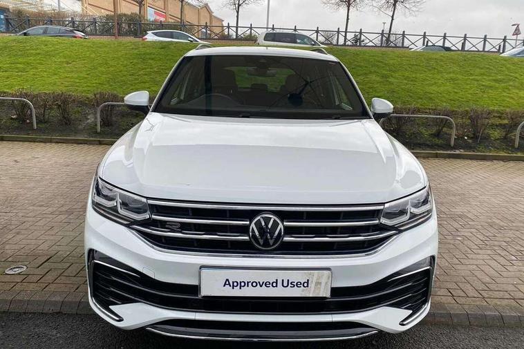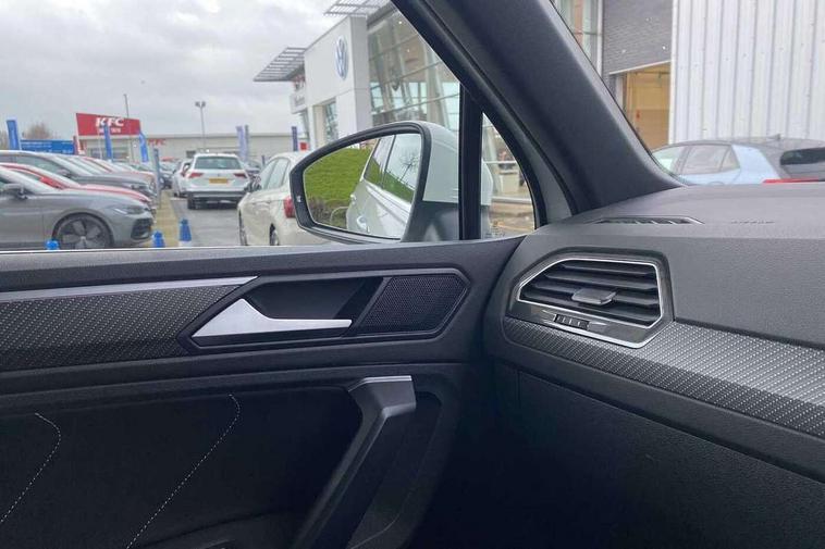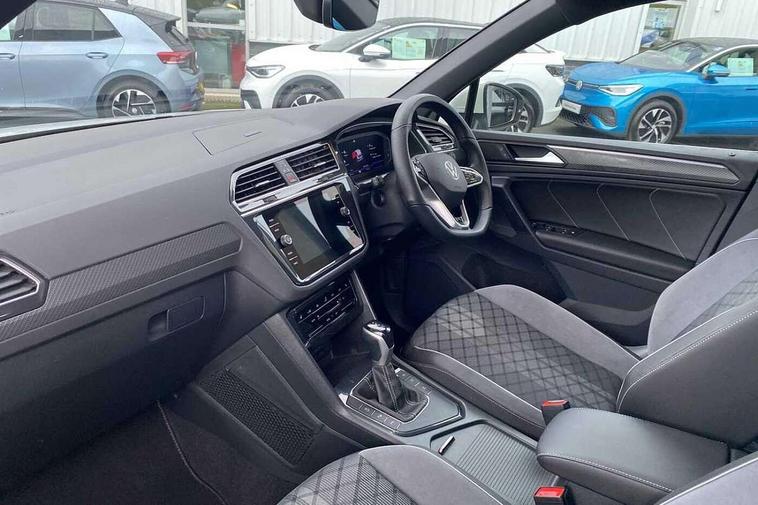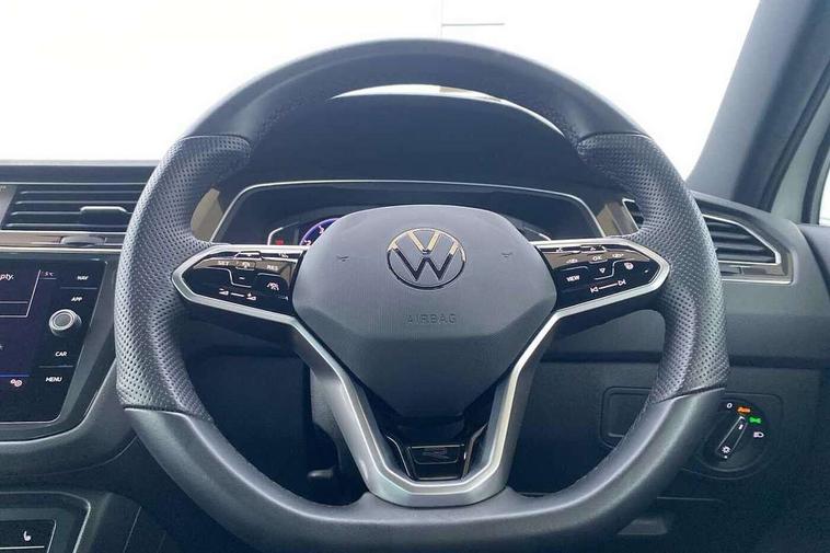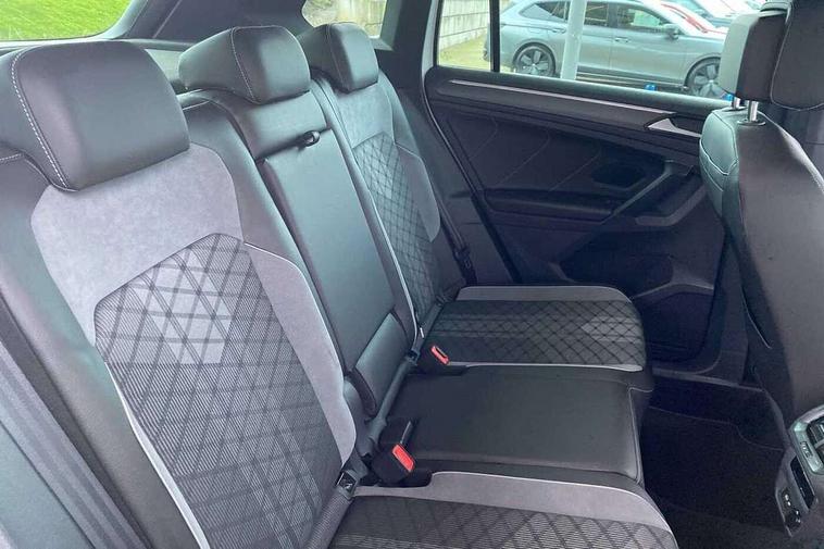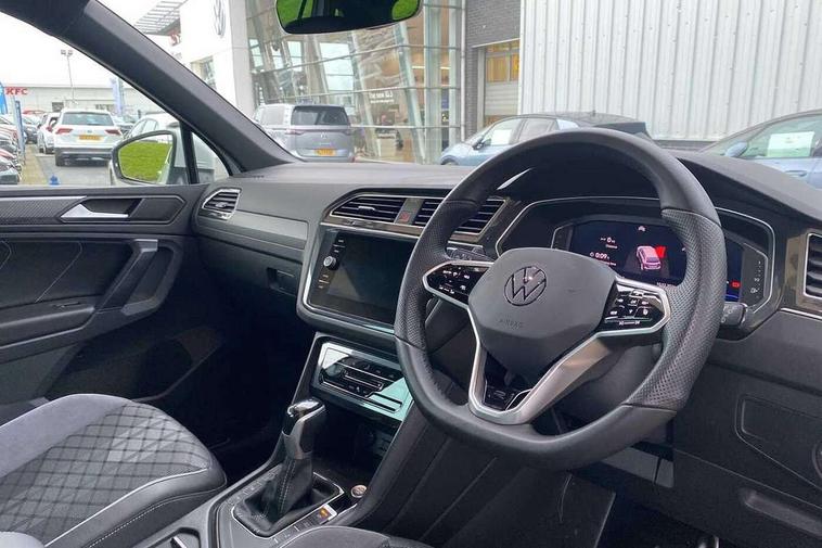 Adaptive cruise control ACC stop and go including speed limiter, App-Connect incl. App-Connect Wireless for Apple CarPlay and Android Auto, Bluetooth phone integration system, Comfort drive travel assist, Digital cockpit pro, Driver alert system, Driver profile selection, Dynamic road sign display, eCall emergency call system, Electromechanical speed sensitive power steering, Emergency assist, Front and rear parking distance sensors, Instrument cluster mph speedometer Great Britain, Lane keeping system Lane Assist, Lights on warning, Multifunction front facing camera, Outside temperature display, Premium multifunction display with multi colour display, Preparation for subsequent activation Navigation feature Discover Media includes Streaming and Internet, Remote control boot opening, Rev counter, Service interval indicator, Speed limit display, Start/stop system with regenerative braking, Tailgate/trunk lid unlocking from outside, Trip computer, Warning sound and light for doors and tailgate open, Battery regeneration during braking, Sports suspension, 8 Speakers, Digital radio reception DAB+, Diversity antenna for FM reception, Radio, Auto dimming interior rear view mirror, Automatic headlight control system, Body colored bumpers in R-Line style, Body colored exterior mirror housings, Body colour door handles, Chrome moldings on the side windows, Coming/leaving home lighting function, Dynamic headlight range control, Front and rear electric windows, Heated rear window, High level 3rd brake light, Laminated safety glass windshield, heat and sound insulating, LED headlamps with LED separate daytime running light and dynamic cornering light, LED rear combination lamps, LED rear number plate lights, License plate carrier in front and rear, Poor weather light and cornering light, Power adjustable, folding and heated door mirrors with surround lighting, front passenger exterior mirror lowering function, Privacy glass for rear side windows and rear window, R Line body kit, R Line side sills, Rain sensor, Rear exhaust tailpipe, Rear fog lamp, Rear side wing doors, Rear spoiler in R style, Rear windscreen washer and wiper with interval delay, Side and rear windows in heat insulating glass, Trailer Stability Programme, Unique R Line badging, Windscreen wipers/ intermittent wipe + 4 position delay, 12V outlet in center console rear and in luggage compartment, 12V outlet in front and tray, 2 LED front reading lights, 2 LED rear reading lights, 3 bench rear seats in 2nd row, 3 rear headrests, Air Care Climatronic 3 zone automatic climate control with enhanced air filter and controls in the rear, Art Velours greyson sports cloth upholstery, Backrest release for left front seat, Black headlining, Brushed stainless steel pedals and footrest, Carpet mats in front and rear with decorative stitching in Gray, Climate control unit rear with touch function, Door and side trim panel in foam film, insert in leatherette, Driver + front passenger lumbar support, Front footwell illumination, Front scuff plates in aluminum with R-Line logo, Front seats head restraints (x-adjustment), Height adjustable front seats, Height/reach adjust steering wheel, Isofix Preparation 2 Rear child seats, Leather gear knob, Rear bench seat asymetrically split folding, longitudinally movable and folding with load-through hatch and center armrest, Remote unlocking for rear seat backrest, Single front passenger seat, Sun visors with illuminated vanity mirrors, Top front comfort seats, Winter pack - Tiguan, 3 point seat belt for centre rear seats, 3 point seat belts with seat belt pretensioners for the outer rear seats, Curtain airbags for front and rear passengers, Driver/Front Passenger airbags, Drivers knee airbag, Electronic parking brake with auto hold, Electronic Stability Control with driver steering recommendation, ABS, ASR, EDL, EDTC and trailer stabilization, Front assist with autonomous emergency braking (for Adaptive Cruise Control ACC up to 130 mph), Front disc brakes, Front passenger airbag deactivation, Front side airbags, Height adjustable front 3 point seatbelts + pretensioners, Manual child proof rear door locks, Pedestrian monitoring system, Proactive passenger protection system in combination with front assist, Rear disc brakes, Two tone horn, Tyre pressure loss indicator, Warning sound and light for front seat belts if unfastened, Warning triangle, Anti theft alarm system with interior monitoring, backup horn and towing protection, Anti theft wheel bolts, Electronic engine immobiliser, Keyless locking and starting system keyless access with safelock, Chrome elements on the mirror switch power window switches and door pulls, Decorative inserts Carbon Gray for dashboard and front door trim panels, Interior door handle in matte chrome, 19" Valencia alloy wheels with AirStop tyres, Tool kit, Tyre mobility kit Includes 12V compressor and tyre sealant,
