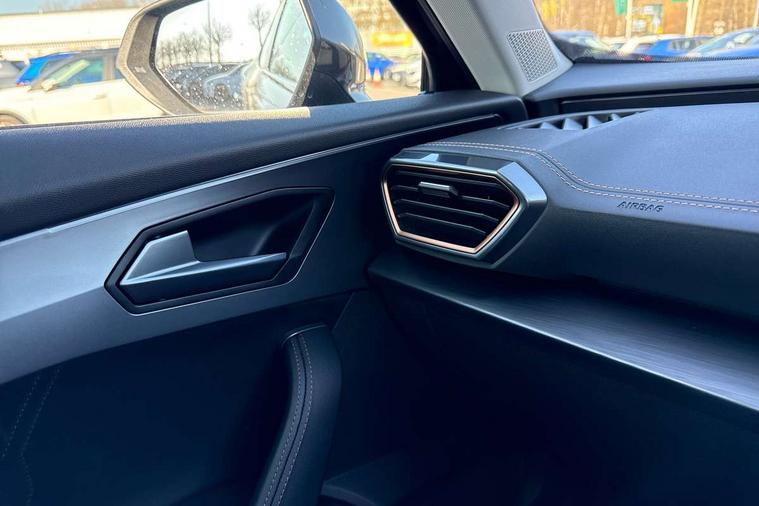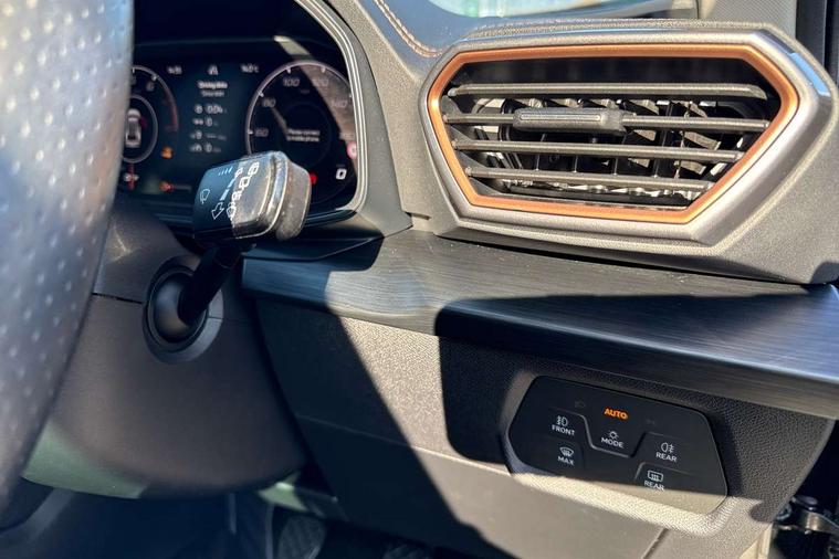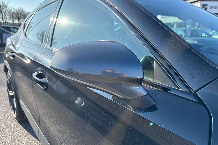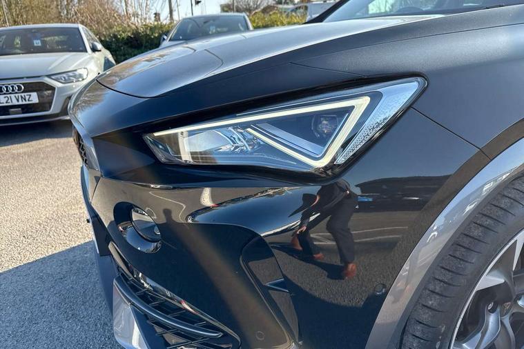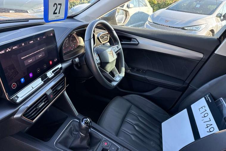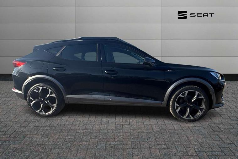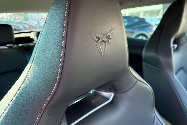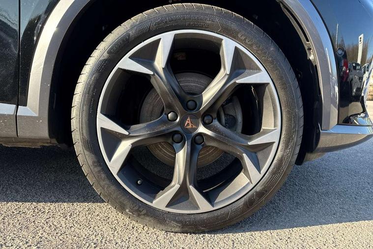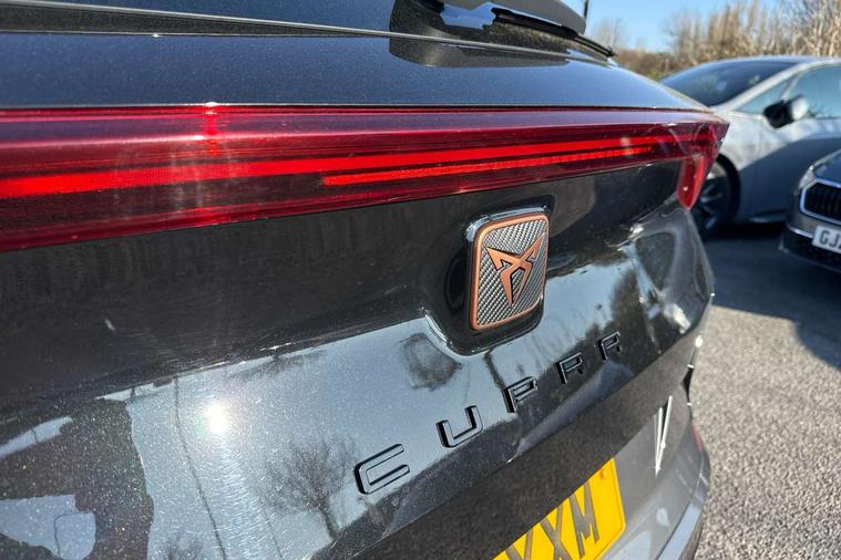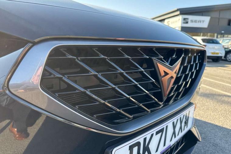 Digital cockpit and configurable dashboard, Driver alert system, Driving profile selection, E-call, Forward collision warning with automatic braking, Lane assist, Park assist (inc front/rear parking sensors), PAS, Predictive adaptive cruise control with speed limiter, Rear view camera, RPM, trip computer, outside temp gauge, instrument light brightness, low fuel warning light, lights on reminder, gearshift indicator, Service interval indicator, Start/stop system with regenerative braking, Wireless apple carplay, Wireless phone charger, Electronic locking differential and dynamic traction support, Standard suspension, 2 front and 2 rear USB type C sockets, Auxiliary input socket, DAB radio, Auto dimming rear view mirror, Body colour door handles, Body coloured bumpers, Dark grey wing mirror, Daytime running light with automatic headlight control and coming home feature, Dynamic headlight range control, Electric front/rear windows, Electrically adjustable heated and folding door mirrors with memory function, Front fog lamps with cornering function, Gloss black roof rails and window surrounds, LED Headlights, LED Taillights with dynamic indicator, Rain sensing wipers, Rear diffuser with black simulated exhaust pipes, Rear side wing doors, Rear wash/wipe, Third brake light, Tinted rear windows, Welcome lights, 12v power supply in centre console, 12V socket, 12v socket in loadspace, 2 front and 2 rear reading lights, 230V socket, 3 seat bench in 2nd row, 60/40 split rear bench seat with armrest and mechanical seat release, Dust/pollen filter, Front and rear head restraints, Front centre armrest, Height/reach adjust steering wheel, Illuminated interior front door sills, Illuminated sunvisor with mirror, Isofix, Leather multi function steering wheel, Luggage tie-down hooks, Single front passenger seat, Three zone climate control with control panel in rear, Variable luggage/load compartment floor, Wraparound lighting, Genuine Nappa leather Pack - Cupra, Navigation system pack with 10" navigation system - Formentor, Safety and driving pack (M) - Formentor, 3 point seatbelts on all rear seats, ABS, Brake control system - ESC and brake booster, Child proof door locks, Driver and front passenger airbags with front passenger airbag de-activation, Electronic parking brake, Front and rear disc brakes, Front side curtain airbags, Hill hold control, Seat belt reminder for front and rear seats, Tyre pressure monitoring system, Anti theft alarm system, Keyless entry and start system (KESSY), Locking wheel bolts, Copper and aluminium interior detailing, 19" 'Exclusive' machined sport matte black and silver alloy wheels,