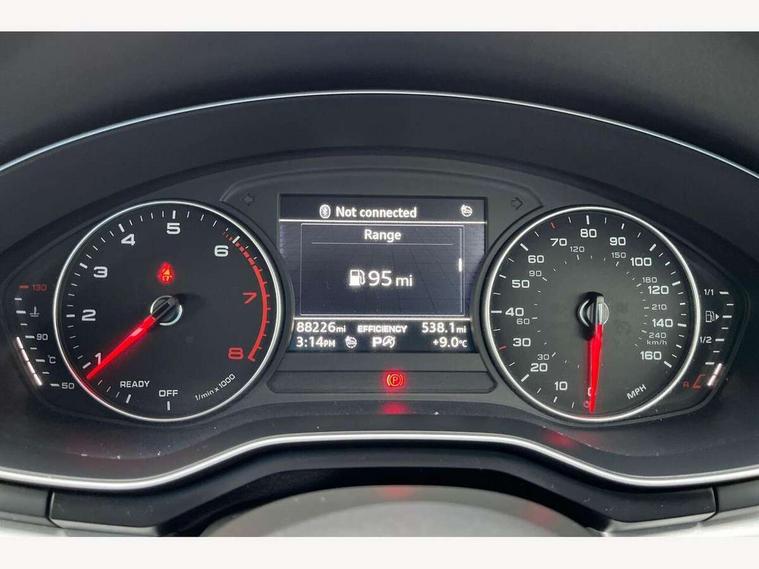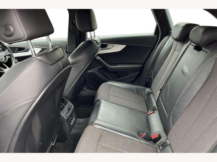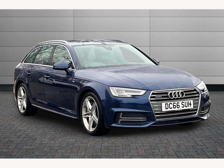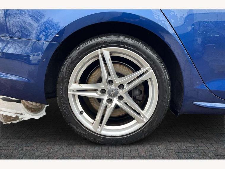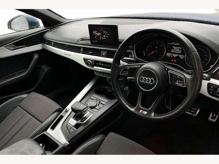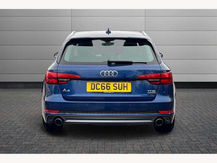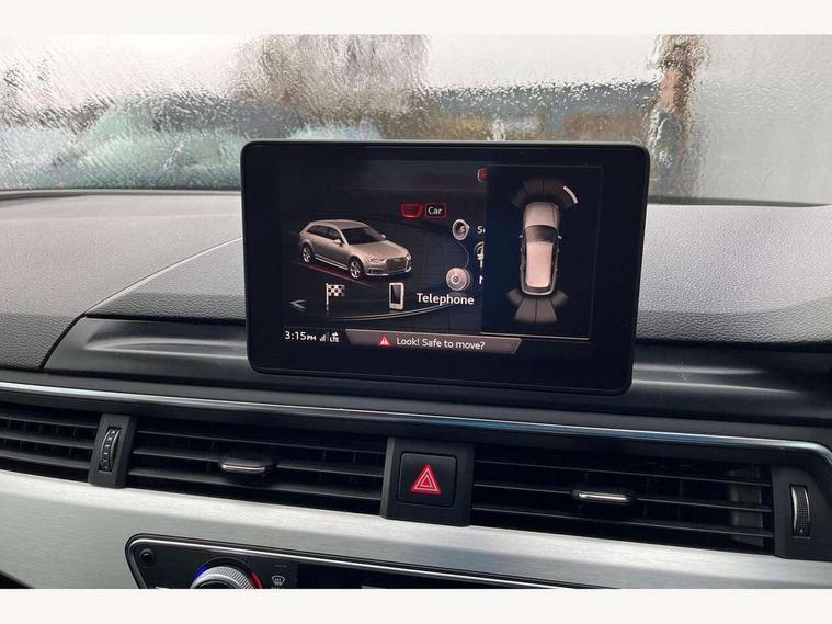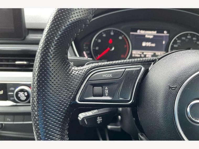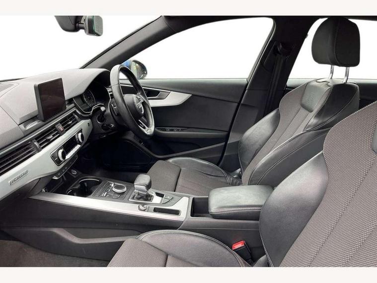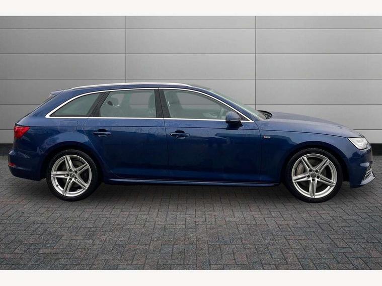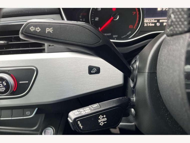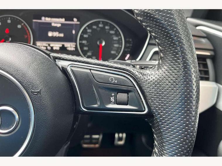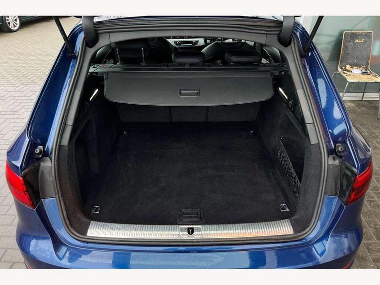 Audi drive select, Audi Pre sense collision avoidance, Audi smartphone interface, Electro-mechanical PAS, Power boot opening and closing, Service interval indicator, Stop/start button, Voice control system, 2 USB ports, Aux input, DAB digital radio module, MMI radio plus with CD player, Acoustic windscreen, Air inlets in titan black with two horizontal inlays in chrome, Auto dimming rear view mirror, Automatic headlights + automatic windscreen wipers, Body colour bumpers, Chrome door handles, Chrome rolled exhaust, Electric adjustable heated door mirrors, Electric front windows, Electric rear windows, Headlight range control, LED daytime running lights, LED indicators in door mirrors, Rear diffuser in Twilight grey matt, Rear wiper, Roof spoiler, 3 zone climate control, Black cloth headlining, Front centre armrest with 12v socket, Front sport seats, Front/rear floor mats, Gearshift paddles, Illuminated door sill finishers, Isofix child seat preparation for front passenger/outer rear seats inc passenger airbag deactivation, Jack and tool kit, Perforated leather gearknob, Reach + rake adjustable steering column, Rear headrests, Retractable load area cover, Split folding rear seats, Stainless steel foot rest, Stainless steel pedals, Sunvisors with vanity mirrors, Top tether anchor plate for isofix child seat, S line exterior styling pack - A4 Avant, 3 point seatbelts on all rear seats, ABS/EBD, Adaptive driver and front passenger airbags, Electromechanical parking brake, ESP, First aid kit, Front head airbags, Front seatbelt pretensioners + load limiters, Front side airbags, Multi-Collision braking, Seatbelt warning, Traction control, Tyre pressure monitoring system, Warning triangle, Keyless start, Locking wheel bolts, Remote central locking, Thatcham category 1 alarm + immobiliser,