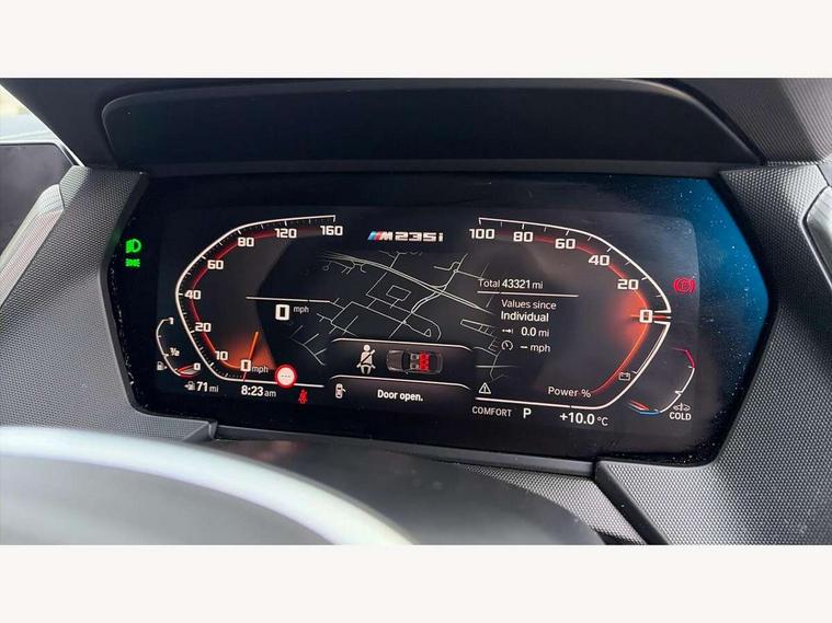 Active guard plus, Attentiveness assist, Auto start-stop, BMW ConnectedDrive online services, BMW Intelligent Personal Assistant, BMW Live Cockpit Professional with 10.25" high resolution instrument and control display, BMW Online services, BMW operating system with 7.0 mid interface, BMW Teleservices, Check Control warning system for monitoring of lights and door/luggage compartment open warning, Cruise control with braking function, Electro hydraulically controlled multi plate clutch in rear axle, Energy efficient operating strategy, iDrive controller with 7 short cut favourite buttons on centre console, Integrated navigation data with map data via USB +features such as 3D landmarks and micro city models, Integrated owners handbook, Intelligent voice assistant, Lane departure warning system, M Sport steering with M235i xDrive M performance specific settings, On board computer - average speed+fuel consumption, service interval, clock/date, odometer/trip meter, outside temperature display and ice warning, Optimum shift indicator, Personal Profile, Pull away assistant, Speed limiting function, 2 balance shafts, 8 speed sport automatic transmission with electronic selector lever, auto P function, coasting idle, race track, sport, gearchange display manual mode, Aluminium lightweight construction, BMW TwinPower twin-scroll Turbo four-cylinder petrol engine, Double VANOS, Drive performance control with ECO PRO comfort + sport mode, Electronic differential lock, Engine cover with M performance designation, High precision injection, Larger fuel tank capacity (50 litres), Launch control, M235i specific heavily de-throttled engine intake air guide, M235i specific high-performance cooling package, M235i specific larger turbocharger with integrated divert-air valve, Performance Control, Petrol Particulate Filter, Power transmission of front wheel drive on the rear axle via angle transmission on the front axle differential and two part cardan shaft, VALVETRONIC engine management, Variable, stepless and infinitely adjustable distribution of drive torque between the front and rear axles, xDrive intelligent all wheel drive with M235i specific reinforced components, 2x USB Type C ports (for charging and data transfer), 4G LTE Connectivity with hard wied 4G network sim card, DAB digital radio, MP3 players and RDS double tuner, Auto wipers, Automatically dimming rear view mirror, Body colour door handles, Direction indicator side lights integrated exterior mirrors, Electric windows - front and rear, with open/close fingertip control and trap release, Exterior mirrors - electrically folding with anti-dazzle, Fading support, Follow me home headlights, Front and rear bumper system with replaceable deformation elements, Front door sill finishers in black plastic with M235i designation, Heated, electrically adjustable exterior mirror aspheric on driver side, convex on passenger side, High gloss black B pillar finish, High gloss shadow line exterior trim, High level third brake light, LED daytime running lights, Lightweight engineering, M Performance exhaust system with valve control and minimised exhaust back pressure, M rear spoiler, Model designation on right side of tailgate includes xDrive designation onleft handside for M235i xDrive, Preparation for high beam assistant, Rain sensor with automatic headlight activation, Rear boot, Rear fog lights, Rear side wing doors, Reinforced crank drive, new pistons and adapted con rods, Reversing light in rear light cluster, Welcome lighting, 12V power socket in centre console, 2 cupholders in front centre console, 3 rear seat head restraints, 3 rear seats, 3 spoke M sports design leather steering wheel finished in nappa leather with specific M badge, Additional under floor storage in luggage compartment, Anthracite finished floor mats with contrasting surround, Anthracite headlining, Automatic two zone climate control air conditioning, Child seat ISOFIX attachment for two outer rear seats and front passenger seat with anchorage points, Conditioned based service, Driver and front passenger seat heating, Front and rear door pockets including bottle trays, Front and rear side armrests integrated into door trim, Front armrest foldable with integrated storage compartment, Front centre interior light over interior mirror and rear centre automatic interior light when door is opened/ignition switched off or via remote key, Front head restraints, Front M Sport seats, Front passenger seat, Glove compartment, Glovebox with light, Luggage compartment lighting, Manually adjustment steering wheel column, Multi-function controls for steering wheel, Shift-by-wire selector shift, Steering wheel paddles, Sun visors with vanity mirrors and insert tab, Through loading system with 40/20/40 split folding rear seat, Two lashing eyes, Additional interior lighting pack - 2 Series Gran Coupe, Connected pack professional - 2 Series Gran Coupe, Extended storage pack - 2 Series Gran Coupe, M Sport exterior styling aerodynamics pack - 2 Series Gran Coupe 235i, 2 tone horn, Airbag - Front driver and passenger, front and rear head, front side, curtain head protection, manual deactivation of front passenger airbag possible, Anti lock braking system (ABS) with cornering brake control, BMW emergency call, Brake drying, Braking readiness, City braking function, Crash sensor activating of airbags, Unlocking doors, hazard warning lights, interior light, safety battery terminal, Dynamic stability control + (DSC+), Dynamic Traction Control - DTC, Electrically operated hand brake, Integrated torsen mechanical limited slip differential on front axle, M Sport braking system in blue high gloss + blue painted brake calipers with M designation, M sport seatbelt, Rear brake discs, Rear child proof door locks, Seat belt security check for driver and front passenger, Seatbelt warning, Side impact protection, Three point seat belts on all seats including front belt stopper, pyrotechnic belt tensioners and belt forc