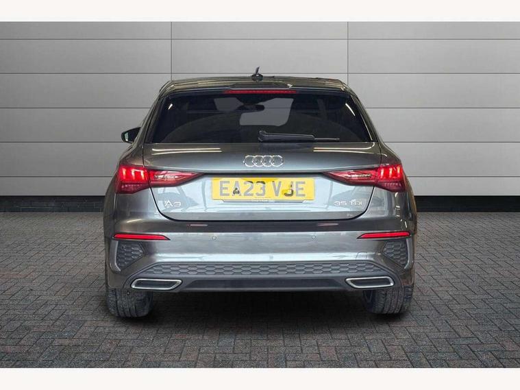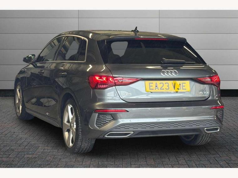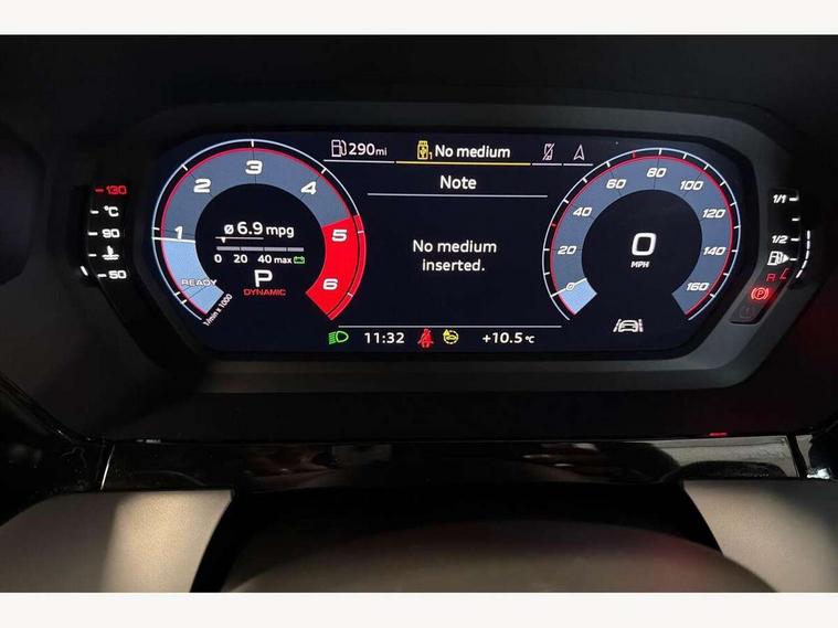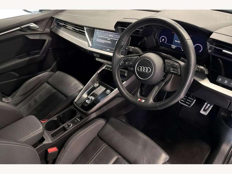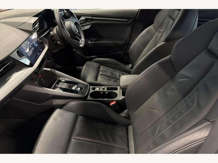Audi drive select (Auto, Comfort, Dynamic, Efficiency and Individual), Audi smartphone interface, Audi Virtual Cockpit - 10.25" digital and colour instrument cluster, Automatic start/stop system with recuperation, Bluetooth interface, Collision avoidance assistant, e-Call (emergency call), Electromechanical power speed sensitive steering, Lane departure warning system, MMI Navigation Plus with high resolution 10.1" colour touch screen display, Service indicator, Trip computer, Voice control system with natural language interaction, Sports suspension, 2xUSB-C connection with data and charging functions, 6 passive loudspeakers, DAB Digital radio, 3rd brake light, Acoustic glass windscreen, Aluminium window trim, Auto dimming frameless rear view mirror, Body colour exterior mirrors, Electrically adjustable/heated/folding/auto dimming door mirrors with integrated LED indications + kerb view function for passenger side, Front electric windows, Illuminated aluminium inserts front door sills with S logo, LED daytime running lights, LED headlights with LED rear lights and dynamic rear indicators, Light and rain sensors, Privacy glass - dark tinted rear window, rear door and side windows, Rear electric windows, Rear side air outlets in grained matt black, Rear side wing doors, Rear wiper, S line bumpers, S roof spoiler, 12V socket and storage compartment in front centre console, 3 seat bench in 2nd row, 3 spoke leather multifunction steering wheel with paddle shift, 4 way electrically adjustable lumbar support for driver and front passenger, 60/40 split folding rear seat bench, Black cloth headlining, Dual zone electronic climate control, Front and rear centre armrest in leather, Front and rear headrests, Front/rear floor mats, Height and reach adjustable steering wheel, Interior lighting - glove compartment light and right hand side, Luggage compartment floor covering, Manual boot compartment lid, Manually adjustable front seats, Seat side bolsters, Single front passenger seat, Stainless steel pedals and front footrest in black, Twin leather upholstery with front sports seats S embossed logo, Aluminium interior elements pack - A3 Sportback, LED interior lighting pack - A3 Sportback, S line styling pack - A3 Sportback, 3x3 point rear seat belts, Driver and front passenger airbag with passenger airbag deactivation, Electronic Stabilisation Control (ESC) including ABS, ASR and EDL, First aid kit with warning triangle and 2 safety vests, Front side airbags with head airbags and interaction airbag, Pre-sense front with pedestrian and cyclist detection, Seatbelt monitoring, Tyre pressure loss indicator, Anti theft alarm, Anti-theft wheel bolts, Electronically operated child lock, Immobiliser, Remote control central locking, Dark spectrum aluminium inlays, accent surfaces in the dashboard and centre console in platinum grey silk effect paint finish,