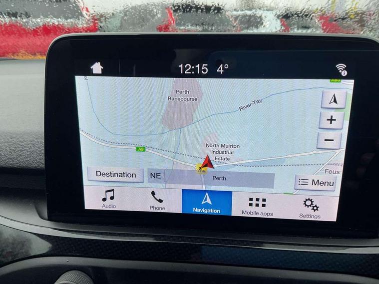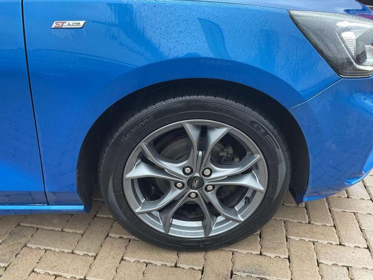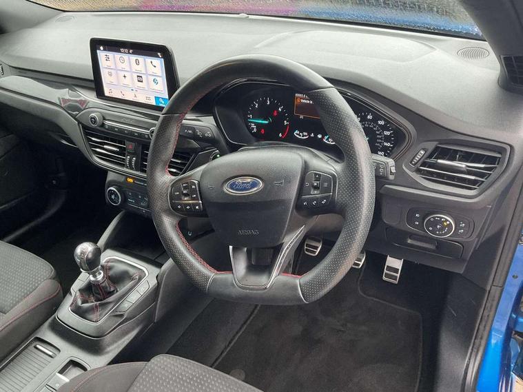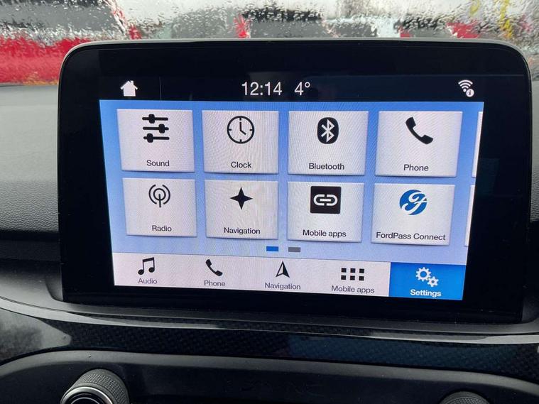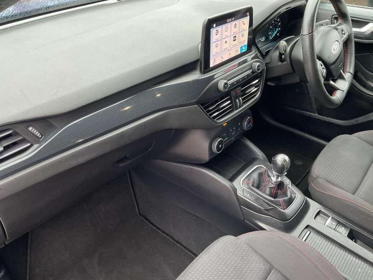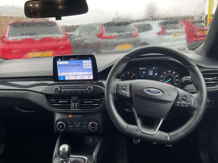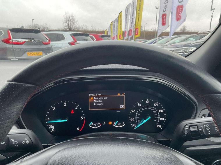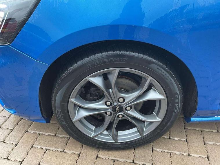 Bluetooth system, Digital clock, Easy fuel capless refuelling system, Eco mode, Ford SYNC 3 with 6.5" TFT touchscreen, DAB radio and app link Android auto/Apple carplay, Lane keeping aid with lane departure warning, PAS, Selectable drive mode, Trip computer, Diesel particulate filter, Sports tuned suspension, 6 speakers, Aux input, 'Quickclear' heated windscreen/heated washer jets, Auto headlamps (on/off), Body colour large rear spoiler, Body colour side skirt, Body coloured bumpers, Body coloured door handles, Body coloured electrically operated and heated door mirrors with side indicators, Electrically operated front and rear windows with one touch opening and closing, Front variable intermittent wipers with electric wash, Halogen reflector headlamps, Heated rear window, LED daytime running lamp, LED front fog lamps with cornering function, Polished twin tailpipe, ST-Line upper and lower grille with full body styling kit and wing badges, Tailgate wash/wipe, 3 spoke flat bottomed leather steering wheel with red stitching, 60/40 split back and cushion rear seats with 2 height adjustable headrests, Alloy finish pedals, Aluminium gear knob, Centre console with armrest, Cloth upholstery with red stitching, Dark headliner, Driver's lumbar support, Front floor mats, Height adjustable front headrests, Isofix child seat preparation, Manual air conditioning, Reach + rake adjustable steering column, Rear centre headrest, Red stitching on steering wheel, ABS+Electronic Brake force Distribution, Auto hold function, Driver airbag, Electronic parking brake, Electronic stability control, Front and rear seatbelt reminder, Front inertia reel height adjustable seatbelts with pre-tensioners, Front passenger airbag, Front side airbags, Hill start assist, Passenger airbag deactivate switch, Post collision braking, Pre collision assist with autonomous emergency braking and pedestrian/cyclist detection, Side curtain airbags, Three rear inertia reel lap/diagonal seatbelts, Tyre pressure monitoring system, Keyless start with 'Ford Power' starter button, MyKey system, Remote central locking & engine immobiliser, Thatcham category 1 alarm, Contrast stitching - Red, 17" 5x2 spoke alloy wheels with rock metallic finish, Mini steel spare wheel,