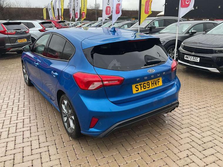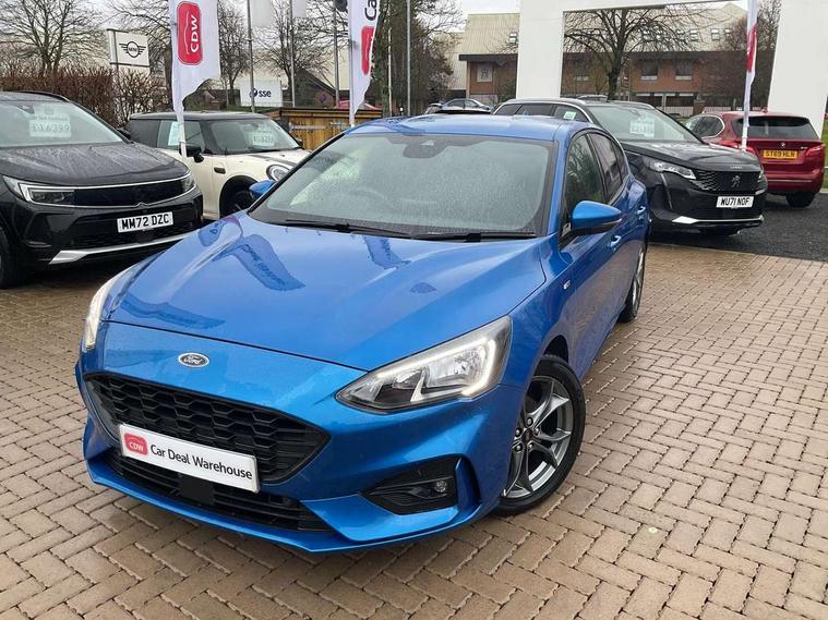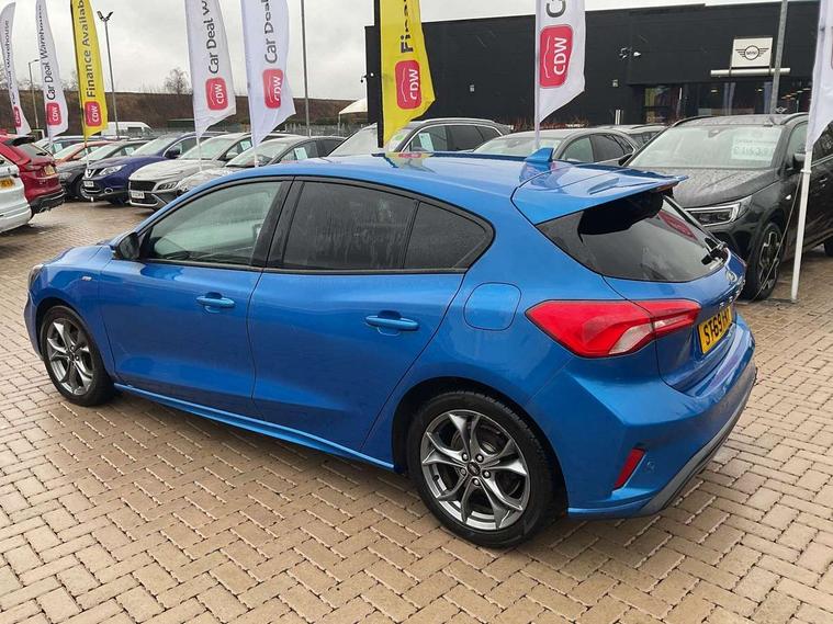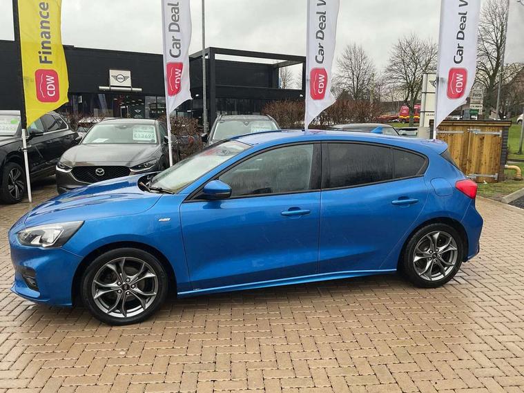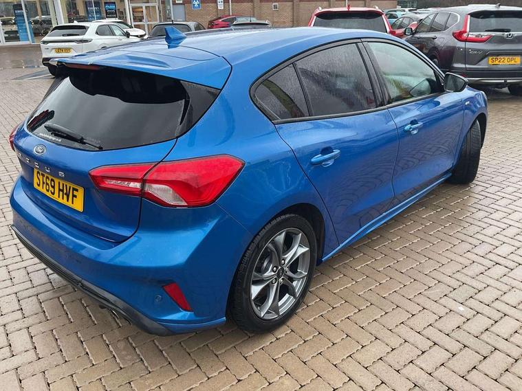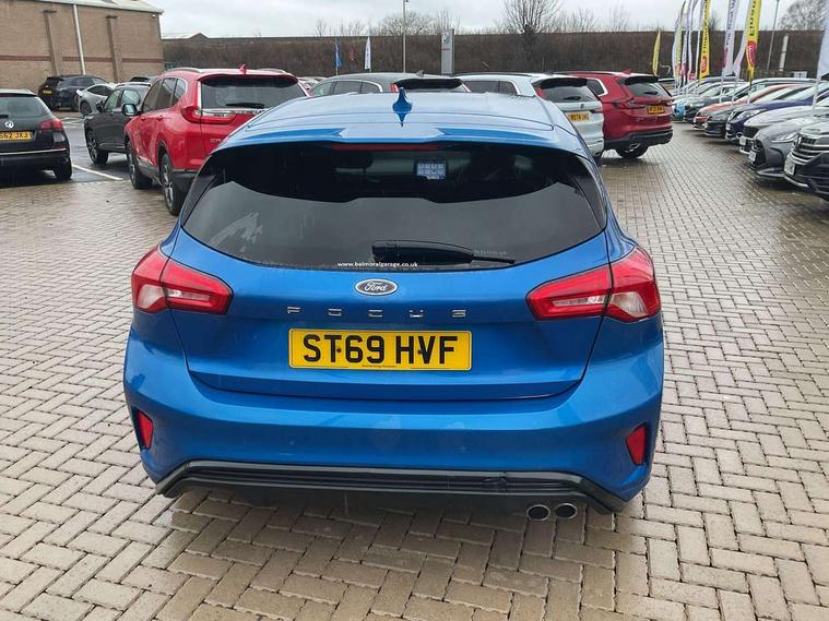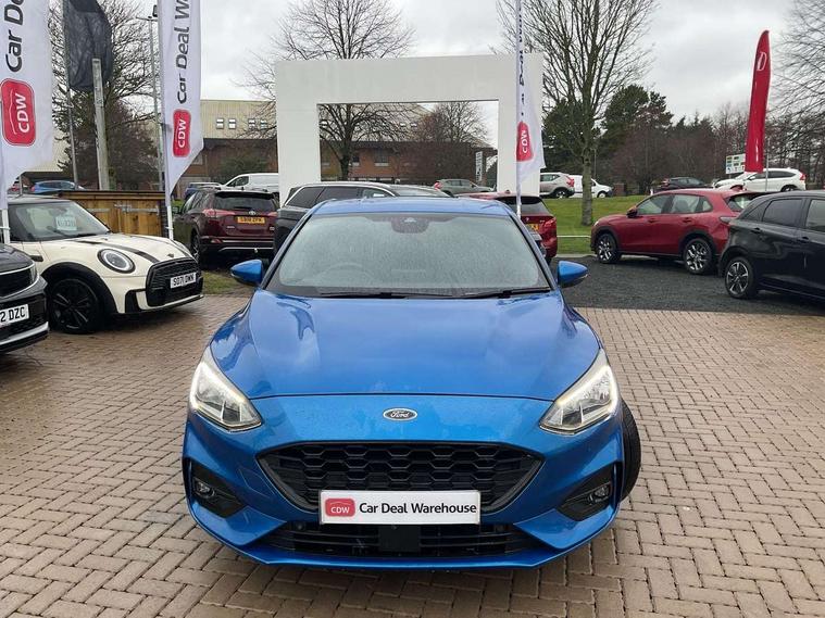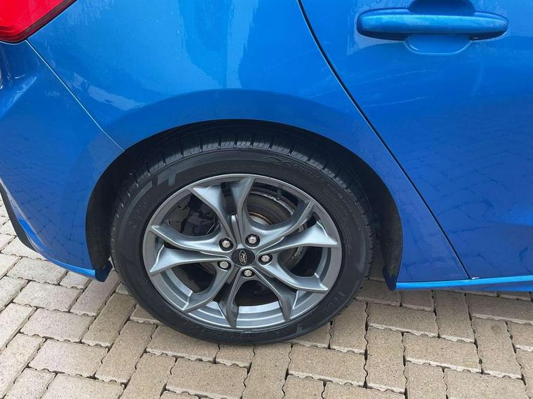 Bluetooth system, Digital clock, Easy fuel capless refuelling system, Eco mode, Ford SYNC 3 with 6.5" TFT touchscreen, DAB radio and app link Android auto/Apple carplay, Lane keeping aid with lane departure warning, PAS, Selectable drive mode, Trip computer, Diesel particulate filter, Sports tuned suspension, 6 speakers, Aux input, 'Quickclear' heated windscreen/heated washer jets, Auto headlamps (on/off), Body colour large rear spoiler, Body colour side skirt, Body coloured bumpers, Body coloured door handles, Body coloured electrically operated and heated door mirrors with side indicators, Electrically operated front and rear windows with one touch opening and closing, Front variable intermittent wipers with electric wash, Halogen reflector headlamps, Heated rear window, LED daytime running lamp, LED front fog lamps with cornering function, Polished twin tailpipe, ST-Line upper and lower grille with full body styling kit and wing badges, Tailgate wash/wipe, 3 spoke flat bottomed leather steering wheel with red stitching, 60/40 split back and cushion rear seats with 2 height adjustable headrests, Alloy finish pedals, Aluminium gear knob, Centre console with armrest, Cloth upholstery with red stitching, Dark headliner, Driver's lumbar support, Front floor mats, Height adjustable front headrests, Isofix child seat preparation, Manual air conditioning, Reach + rake adjustable steering column, Rear centre headrest, Red stitching on steering wheel, ABS+Electronic Brake force Distribution, Auto hold function, Driver airbag, Electronic parking brake, Electronic stability control, Front and rear seatbelt reminder, Front inertia reel height adjustable seatbelts with pre-tensioners, Front passenger airbag, Front side airbags, Hill start assist, Passenger airbag deactivate switch, Post collision braking, Pre collision assist with autonomous emergency braking and pedestrian/cyclist detection, Side curtain airbags, Three rear inertia reel lap/diagonal seatbelts, Tyre pressure monitoring system, Keyless start with 'Ford Power' starter button, MyKey system, Remote central locking & engine immobiliser, Thatcham category 1 alarm, Contrast stitching - Red, 17" 5x2 spoke alloy wheels with rock metallic finish, Mini steel spare wheel,