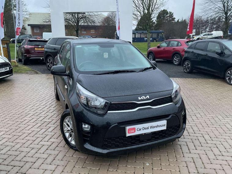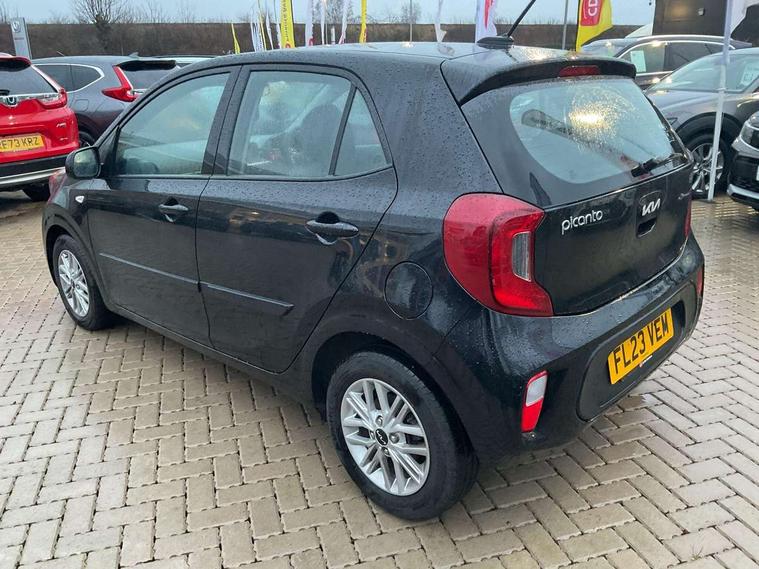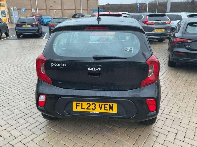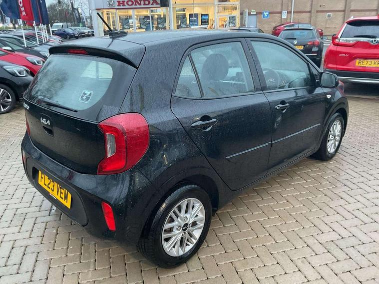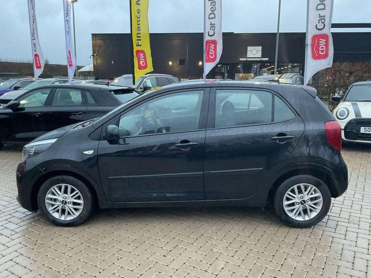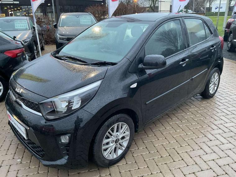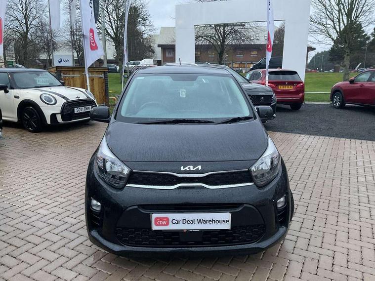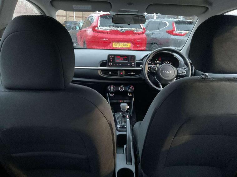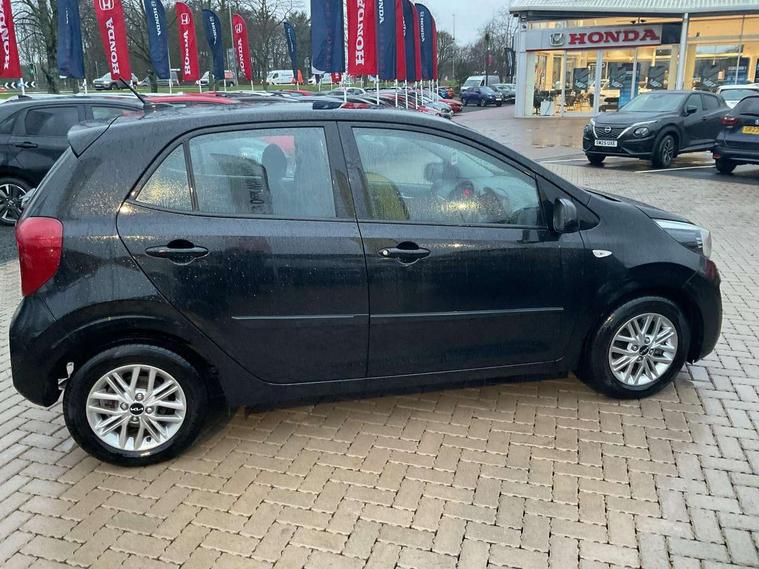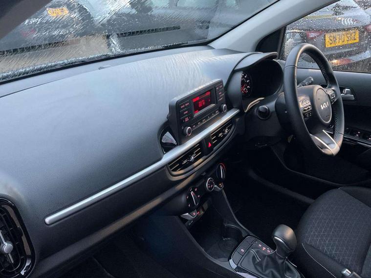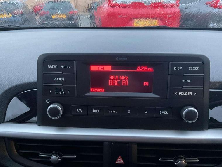 3.8" monochrome audio display with RDS and DAB, Emergency call service, Emergency stop signalling system, External temperature gauge, Motor driven power steering, Tachometer, Tailgate, Trip computer, 4 speaker audio system, Bluetooth with music streaming, Steering wheel mounted controls, USB ports for connection of a media device, Automatic headlight control system, Black radiator grille with chrome surround, Body colour bumpers, Body colour mirrors and door handles, Day/night rear view mirror, Daytime running lights, Electric adjustable heated door mirrors, Front and rear electric windows with drivers's auto up/down function, Headlamp levelling, Heated rear window, High mount brake light, MFR - Multi Focus Reflector halogen headlights with black bezel, Rain sensor, Rear fog lights, Rear side wing doors, Rear wash/wipe, Speed variable front wipers, Tinted glass, Visible VIN plate, Welcome and follow-me home light functionality, 1 x rear coat hook, 12V power point front, 2 seat bench in 2nd row, 3 x passenger assist grips, 60/40 split/folding 2nd row of seats, All round height adjustable headrests, Cupholders in centre console, Driver and front passenger sunvisor with vanity mirror, Driver seat height adjust, Front cabin lights, Glovebox, High gloss lower centre fascia trim, door armrest and air vents, ISOFIX Child seat top tethers and anchor fixings, Leather trimmed steering wheel and gearshift, Luggage area light, Luggage area parcel shelf, Manual air conditioning, Passenger front seatback pockets, Premium cloth upholstery, Silver paint finished interior door handles, Single front passenger seat, Slide/reclining front seats, Tilt adjustable steering wheel, Advanced Driver Assistance Pack - Picanto, 2 x 3-point rear seatbelts, ABS/EBD, Automatic unlocking of doors in case of impact, Dual front airbags, ESC + BAS + VSM + HAC, Front passenger airbag cut-off switch, Front seatbelt height adjusters, Front seatbelt pretensioners + load limiters, Hill hold control, Knee airbags, Rear child proof door locks, Seatbelt warning, Side impact protection, Torque vectoring brake based and straight line stability (SLS), Traction control, Twin curtain airbags, Twin front side airbags, Tyre pressure monitoring system, Anti theft alarm, Engine immobiliser, Folding key, Locking wheel nuts, Remote central door locking, 14" alloy wheels, Tyre mobility kit,