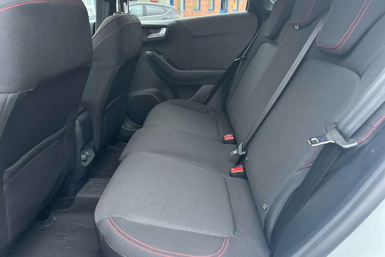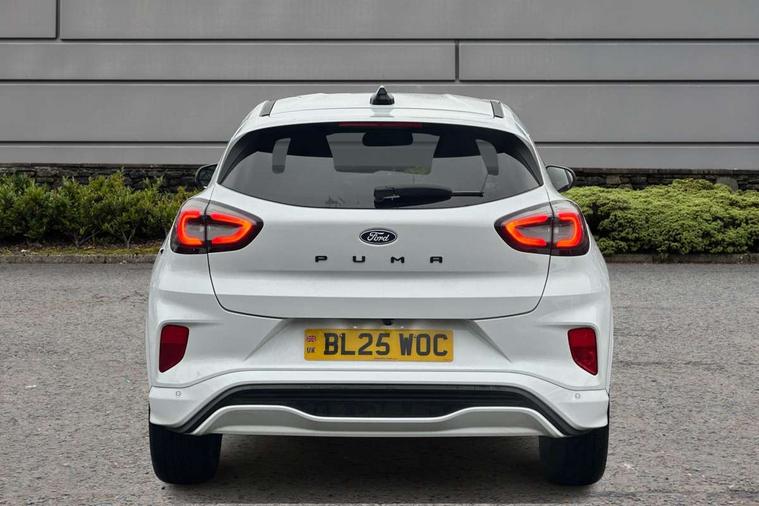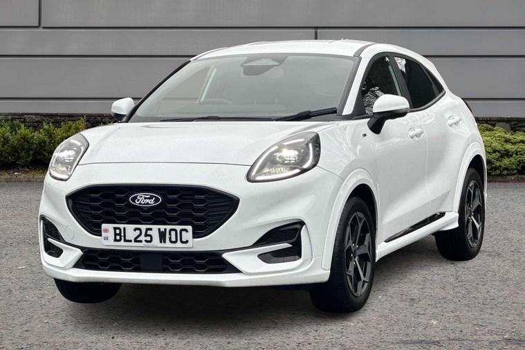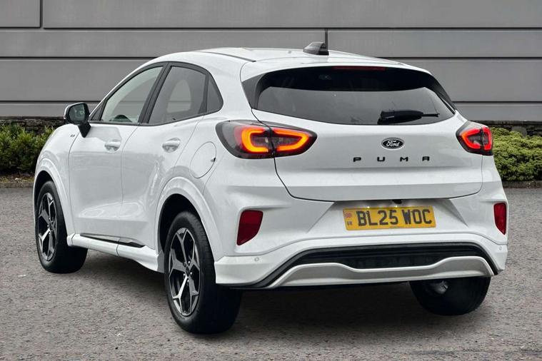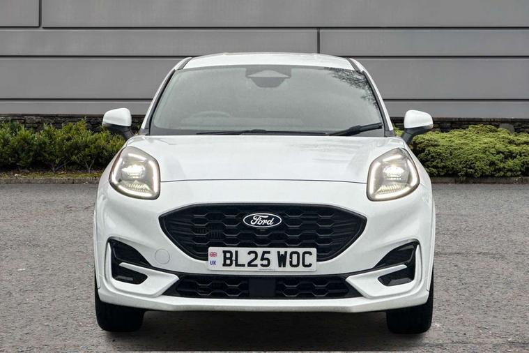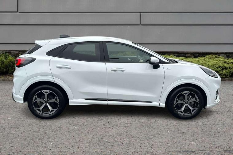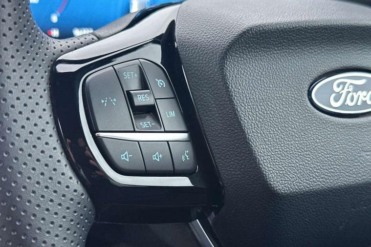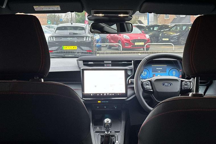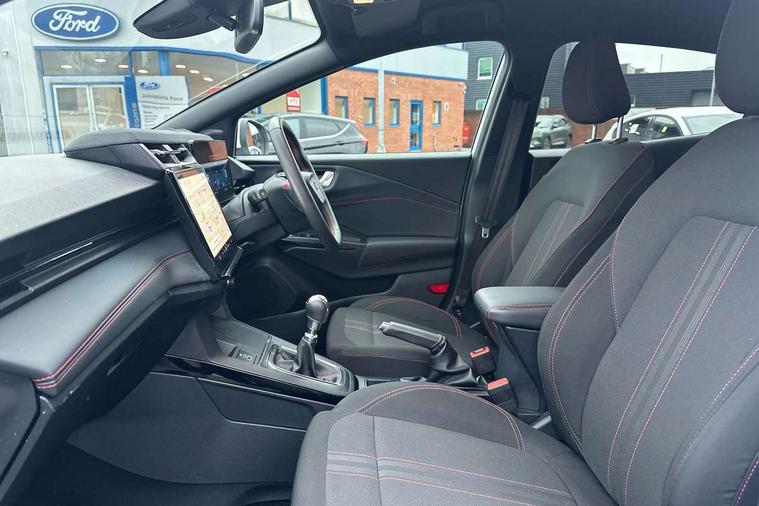 Driver impairment monitor, Emergency call service, Ford easy fuel, Full digital 12.8" instrument cluster, Lane keeping aid with lane departure warning, Power assist steering, Selectable drive modes(Normal, Eco, Sport, Slippery and Trail), Speed sign recognition, Sport suspension, 12" landscape touchscreen display with wireless apple car play and android auto 6 speaker audio system, Ford pass connect and emergency assistance, Ford SYNC4 with connected navigation, Automatic headlights with rain sensing wipers and auto high beam, Front fog lamps, LED daytime running lights, LED rear lamps, LED third brake light, Power foldable heated door mirrors with puddle lamps and puma logo protection, Quickclear heated windscreen, Rear privacy glass, Rear side wing doors, Rear wiper, ST-Line body styling kit with unique grille, 3 seat bench in 2nd row, Centre console with armrest and stowage, Electronic automatic temperature control (EATC), Ford megabox extended bootspace, Front and rear head restraints, Front floor mats, Manual 4 way driver seat adjust with lumbar adjustment, Single front passenger seat, ST- Line cloth trim with red stitching, 3 rear seatbelts, Child safety lock, Electronic stability control (ESC) and hill start assist, Pre-collision assist with autonomous emergency braking, pedestrian/cyclist detection & post-collision braking, Tyre pressure monitoring system (TPMS), Thatcham alarm,