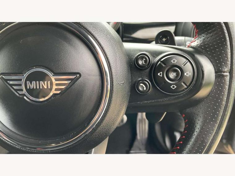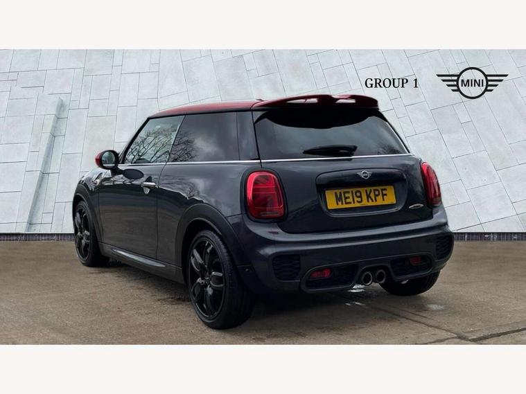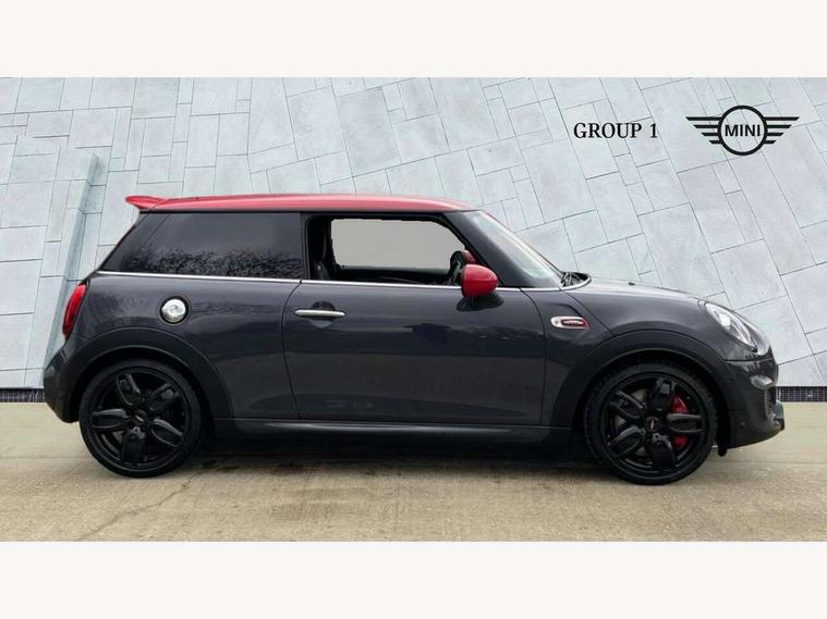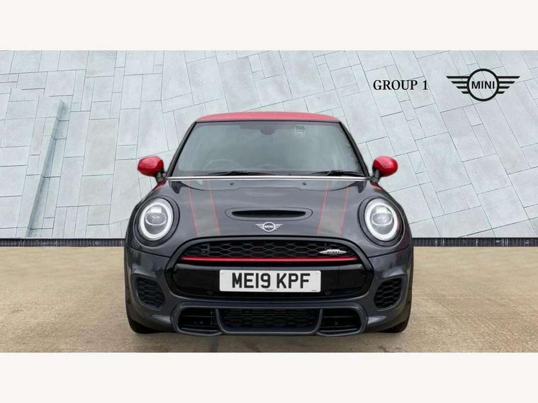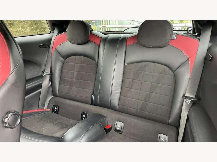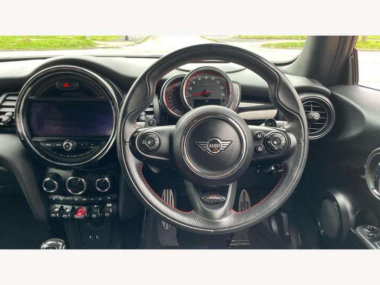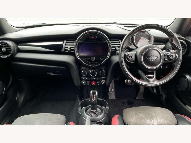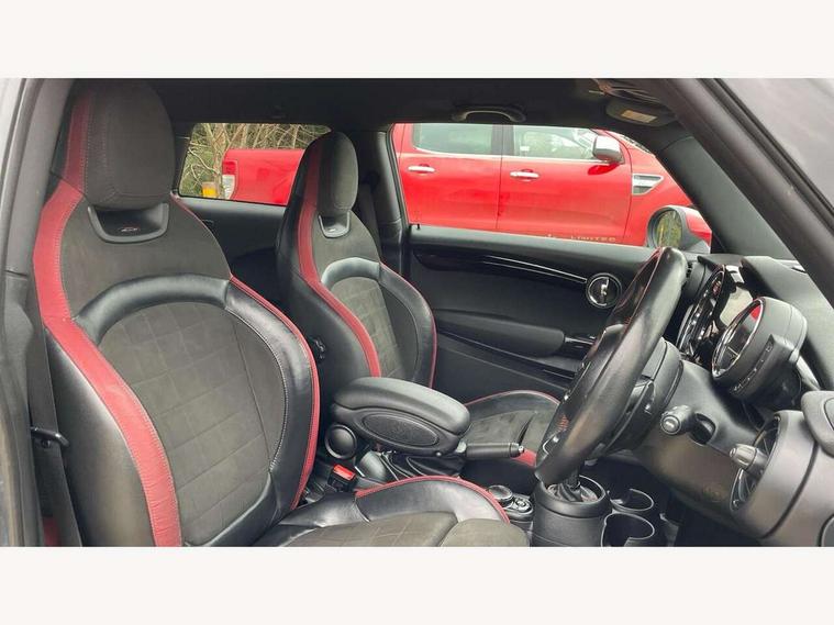 Compatible mobile phone bluetooth with audio streaming, Instrument cluster, MINI Driving Modes - centre toggle switch to control driving setting (sport, mid and green), Mini E-call, MINI TeleServices, On board computer, Service interval indicator, Eight speed steptronic sport transmission, with gearshift paddles, Performance Control, 6.5" touchscreen with LED ring, FM tuner and DAB digital radio, Automatic headlight activation switch, Bonnet scoop, Chrome door handles, Chrome plated fuel cap, Dynamic brake lights, Electric front+rear windows, Heated rear window, Heated windscreen washer jets, John Cooper Works - aerodynamic kit (front and rear apron, spoiler), front and rear sport bumpers and part-painted side sills with door sill finishers, John Cooper Works rear spoiler, LED headlight with closed ring and daytime driving lights, Metal look door sill finishers, Piano black border radiator grille with honeycomb structure in black matt and John Cooper Works logo with upper individual grille strut in chilli red, Piano black exterior, Rain sensor window wipers, Rear fog lights, Rear LED lights with union jack design, Rear window wiper, Side scuttle with MINI John Cooper Works logo in black high-gloss with red border, Sun/heat protection glass, Two central exhaust tailpipes with chrome finisher, White indicator lenses, 12V Accessory socket in centre console, 4 lashing eyes in luggage compartment, 60/40 split folding rear seat, Chrome interior highlights, Cupholders, Front and rear isofix with front passenger airbag deactivation, Glove compartment, Height and length steering column adjustment, Interior lighting with 12 basic colours selectable via toggle switch in roof, Internal chrome door handles, John Cooper Works Logo in seat, John Cooper Works sport leather steering wheel, Leather gearshift lever and handbrake gaiters, LED reading lights, vanity mirror lights, front foot well light and spotlight on front seats, Manual air conditioning, Mechanical seat adjustment, driver seat height adjust, forward/back and front seats backrest, Mini logo projection on floor from drivers exterior mirror, Multifunction steering wheel, Stainless steel pedals with rubber inserts, Storage compartments in doors, Sunvisors with vanity mirrors, Tool kit, 3 point seatbelts on all four seats, 6 Airbags - front, side, head and seat belt tensioners, Anti-lock braking system (ABS), DSC - Dynamic Stability Control, Front and rear disc brakes, Hill start assist, Red brake callipers with John Cooper Works logo, Two tone horn, Tyre pressure monitoring system, Alarm system with tilt sensor, monitoring doors, bonnet interior and tailgate, Electronic vehicle immobiliser, Start/stop toggle with keyless go, Piano black interior trim,