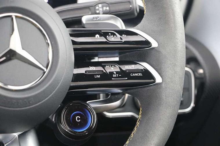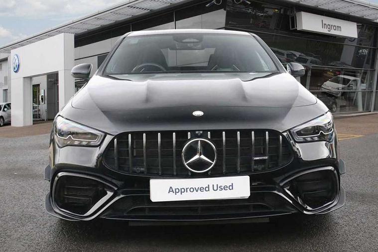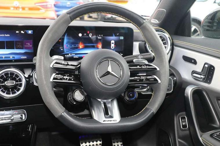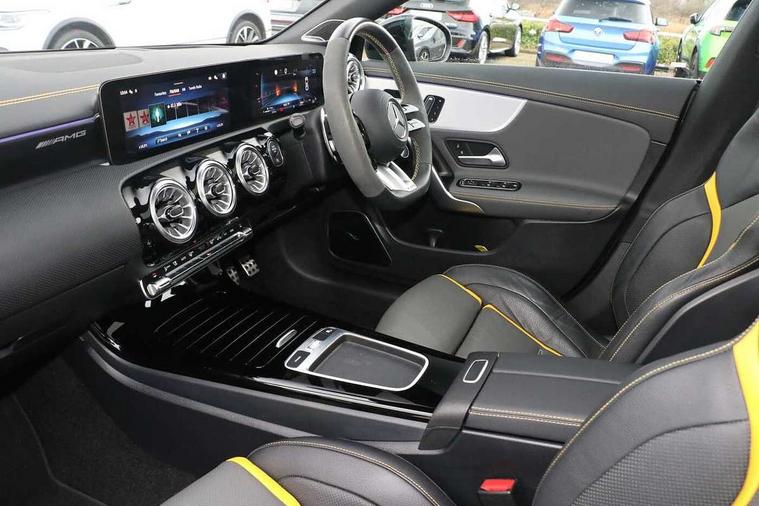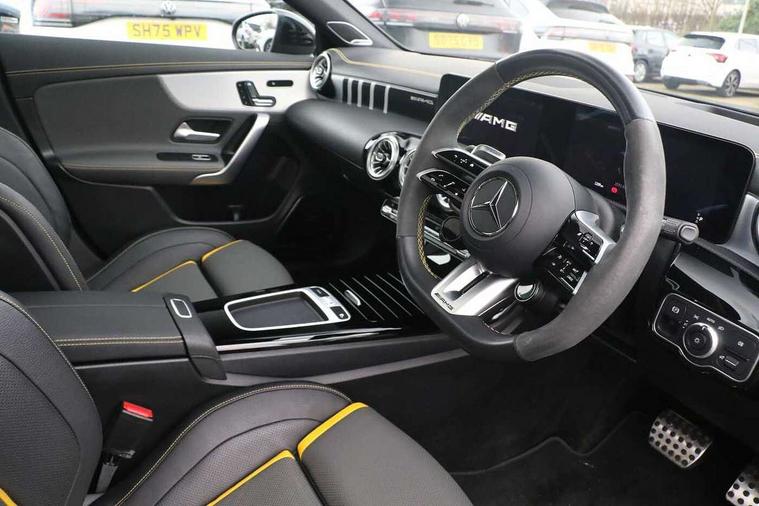 10.25 inch Instrument display with digital cockpit, 10.25 inch touchscreen central media display with AMG specific, AMG start up logo, visualisation of the AMG drive programs, vehicle and engine data, 360 degree parking camera, Active lane keeping assist, AMG DYNAMIC SELECT with drive modes(Slippery, Comfort, Sport, Sport+, Individual and Race) incl drift mode via steering wheel shift paddles+Race Start, AMG menu with sporty additional information - Gear indicator with yellow M symbol manual mode, Warm Up menu and Set Up menu, AMG speed sensitive power steering with two sets of steering characteristics, AMG track pace, Attention assist - Monitors steering behaviour and long journey fatigue, Bluetooth connection, Car wash mode, Cruise control with limiter, Direct steer system, ECO start/stop function, Fluid level warning indicator for fuel, oil, coolant and washer fluid, Hard-disk navigation, Head up Display, Hey Mercedes Voice activation, Lamp failure indicator, MBUX augmented reality for navigation, MBUX Interior assistant, Mercedes me connect including emergency call system, accident recovery, breakdown and maintenance management, Mercedes me remote services, Outside temperature gauge, Owners manual in English, Pre-installation of private car share, Radio aerial integrated into front and rear windshields, Service indicator (ASSYST), Smartphone integration with Apple CarPlay and Android auto, Traffic sign assist, Trip computer in multifunction display with current consumption indicator, Wireless charging in the front centre console, 4MATIC permanent four wheel drive, AMG performance 4MATIC+ with torque control distribution, AMG Ride Control suspension, Rear axle multi-link, Burmester lettering on the speakers, Burmester surround sound system (710W) with dolby atmos, speakers - 1 central, 1 woofer, 1 tweeter, 1 subwoofer with 60W, 2 in C pillar, DAB digital radio tuner, MBUX multimedia system, Pre installation for Mercedes Benz Link, USB (type C) ports (2) in stowage compartment and 1 in front of centre console, Adaptive brake lights, AMG body styling specific front apron, AMG side sill panels, AMG rear apron, AMG roof spoiler lip, Specific S labelling boot lid + front apron CLA 45, AMG emblem on the front instead of the "Mercedes-Benz" laurel wreath badge, AMG Front apron with flics as air deflector elements on the outer air intakes, AMG fuel filler cap in silver chrome with AMG lettering, AMG illuminated door sills with AMG lettering and with exchangeable cover, AMG specific radiator grille with vertical struts in high gloss chrome and AMG logo, AMG Sports exhaust system with two round tailpipes measuring 90 mm in diameter attached in rear apron, AMG lettering plus ribbing on the inside of the, Body colour bumpers, Body colour door handles, Electric panoramic sunroof with automatic tilt and convenience closing fuinctions, rain sensor auto closing and electronic roller sunblind, Electric windows, Electrically adjustable and heated door mirrors with integrated LED indicators, Exhaust system with AMG Real Performance Sound (Balanced or Powerful settings), Front splitter and trim elements on the louvres in the outer air inlets in silver chrome, Front wings with TURBO 4MATIC lettering, Hand free access, Headlamp assist automatic headlamp activation, Heated glass rear windscreen + timer control, High gloss beltline strips, High level LED third brake light, Integrated LED daytime running lights, Interior mirror with black reading lamps and frameless, LED tail lamp, Multibeam LED headlamps with adaptive highbeam assist plus, Privacy glass with dark tinting on rear side windows and rear window, Rain sensing windscreen wipers with two sensitivity settings, Rear boot, Rear fog lamp, Rear side wing doors, Surround lighting with projection of brand logo, Two round twin tailpipe trim elements each measuring 90 mm in diameter and AMG lettering plus ribbing on the inside of the pipe, Valve control dependent on drive program, Variable front intermittent wipers, 3 seat bench in 2nd row, 40:20:40 split folding rear seat backrests, Air conditioning - Two zone thermotronic luxury automatic climate control with display, Air vents with surround in silver chrome, AMG brushed stainless steel sports pedals with rubber studs, AMG centre console finished with trim in silver chrome, AMG Performance sportily shaped seats with power adjustable front seats, special seat cushions + AMG badge backrests, AMG Performance steering wheel in nappa leather/microcut microfibre, AMG steering wheel buttons, Automatic child seat recognition sensor, Black roof lining, Floor mats with stitched AMG lettering, Fluorescent jacket, Front centre armrest with stowage, Front head restraints, Heated front seats, Interior lighting - 64 colour Ambient lighting, Manually height and reach adjustable steering column, Rear armrest with two integral cup holders for drinks, Rear head restraints, Silver coloured aluminium gear shift paddles on steering wheel, Single front passenger seat, Stowage compartment in centre console with retractable cover, Sunvisors with illuminated vanity mirrors, Twin front cupholders, Two outer rear seat isofix and top tether child seat fixing points, Aerodynamics pack - CLA, AMG driver's package - CLA, AMG Multi contour seat pack - CLA, AMG Night package - CLA 35/45, AMG performance seat pack (High End) - CLA 45 S 4Matic+ Plus, Keyless go comfort pack - CLA, Light and sight pack - CLA, Mirror pack with Self dimming rear view mirror - CLA, Seat comfort pack - CLA, Active bonnet pedestrain safety measure which detects an impact and raises bonnet by 65mm, Adaptive brake assist with hold function and hill start assist, AMG high performance brake system with red painted brake callipers and black AMG lettering at the front, ventilated and perforated brake discs, Anti lock braking system (ABS) with brake assist, Black seat belts, Brake pad wear warning indicator, Childproof locks manually operated for rear doors and electric