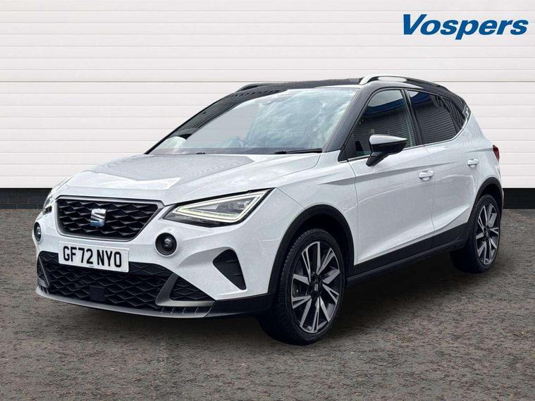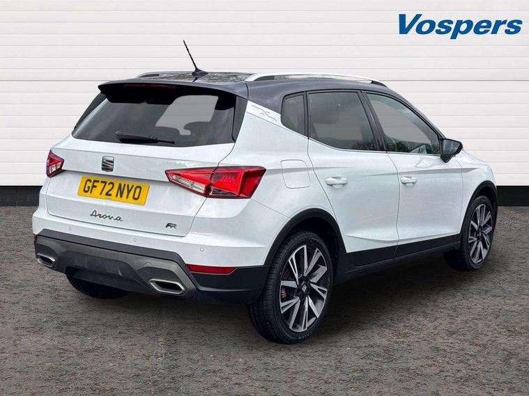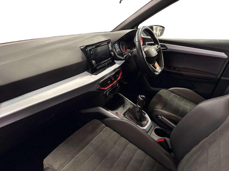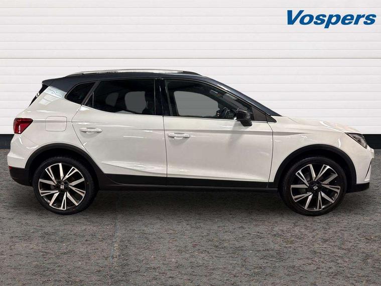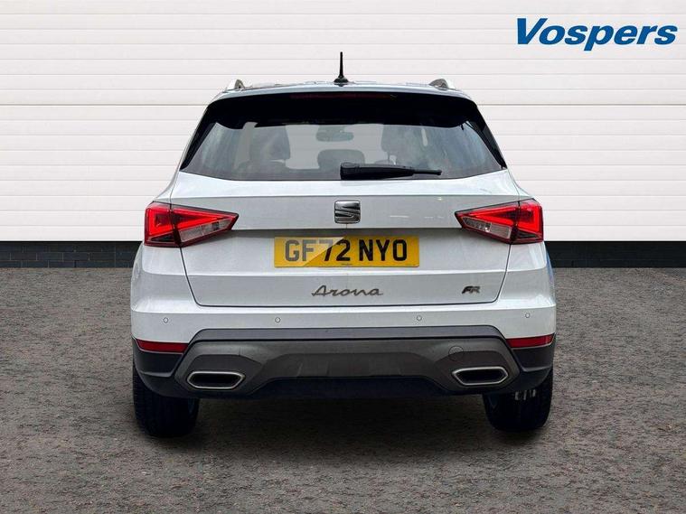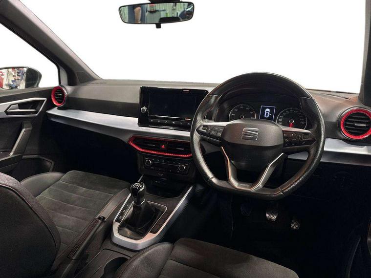 'Lights On' Reminder warning buzzer, Analogue cockpit with physical dials, Digital clock, E-call, Electric speed sensitive power steering, Full Link Smartphone Integration with Mirror Link, Apple Car Play, Google Android Auto with USB Type C cable for Apple and Android compatibility, Lane keeping system, Low fuel warning light, Outside temperature display, Rear parking sensor, RPM counter, Seat connect with safety, service and remote, SEAT Drive profile - Four different models normal-sport-eco-individual, steering response, throttle response, Trip computer, Wireless phone charger, Bluetooth interface for hands free and audio streaming, DAB digital radio and AM/FM radio, Media system with 8.25" colour touchscreen with USB port (type c), Steering wheel mounted audio controls, Anti theft roof antenna, Automatic activation of hazard warning lights, Body coloured bumpers, Body coloured door handle inserts, Chrome roof rails and window surrounds, Dark tinted rear windows, Dimming rear view mirror, Electric front/rear windows, Electrically adjustable and heated door mirrors, Front fog lights with cornering function and rear fog light, FULL LED automatic headlights with dynamic headlight range control, coming and leaving home, LED daytime running lights, LED rear tail lights and licence plate lights, Protective side mouldings, Rear side wing doors, Rear spoiler, Rear window wash/wipe, Roof colour door mirrors, Third brake light, Twin exhaust pipe styling hidden exhaust pipe, Visible VIN plate, Windshield wiper with intermittent control and potentiometer, 2 cupholders, 3 seat bench in 2nd row, 60/40 split folding rear seat, Aircare filter, Black interior roof, Double boot floor, Driver sunvisor with covered mirror + card holder, Dual zone climate control, Front comfort seats, Front courtesy light with 2x front and 2x rear reading lights, Gear shift indicator, Height adjustable front seats, Height/reach adjustable steering column, Illuminated boot, Instrument lighting with brightness control, Interior ambient lighting, Interior light in footwell, central console and door panel, ISOFIX points in outer rear seats with top tether anchorage points, Microsuede cloth upholstery, Passenger sunvisor with vanity mirror, Perforated flat bottomed leather steering wheel/gear knob/handbrake with red stitching and FR logo, Single front passenger seat, Two front and three rear height adjustable headrests, Interior chrome pack - Arona, 3 point seatbelts on all rear seats, ABS, Active front headrests, Child locks on rear doors, Driver and front passenger airbags with front passenger airbag de activation, front side and curtain airbags, Electronic stability control, Emergency Brake Assist (EBA) and front assist, Front and rear seatbelt reminder, Hill hold control, Multi-Collision braking, Tiredness recognition system, Traction control, Tyre pressure monitoring system, Alarm with back-up horn, Electronic engine immobiliser, KESSY Keyless entry and go, Locking wheel bolts, Remote central locking + deadlocks, Tow away protection, Titan black dashboard,