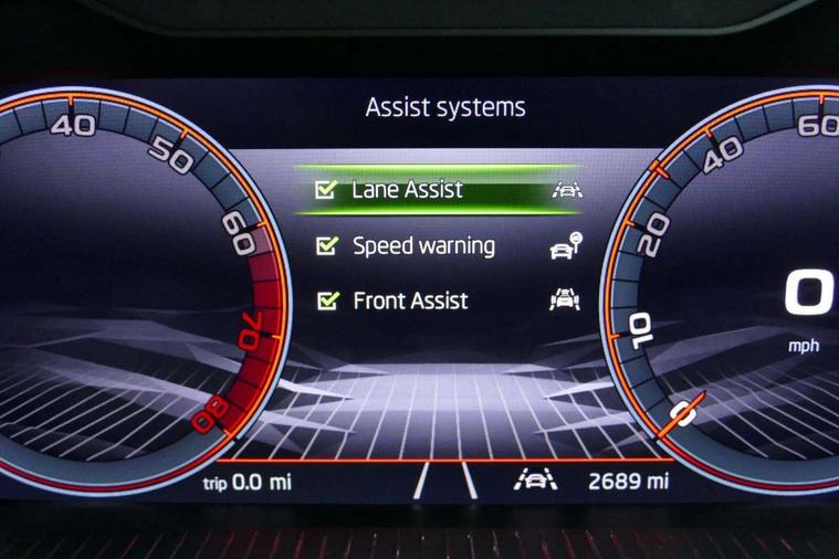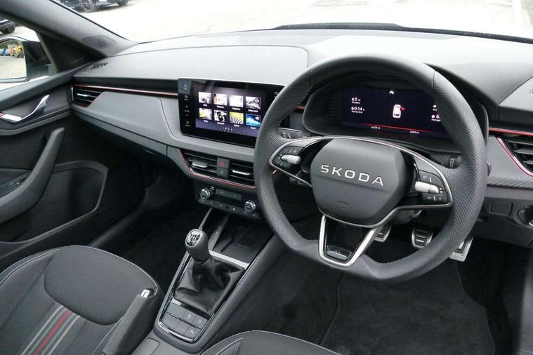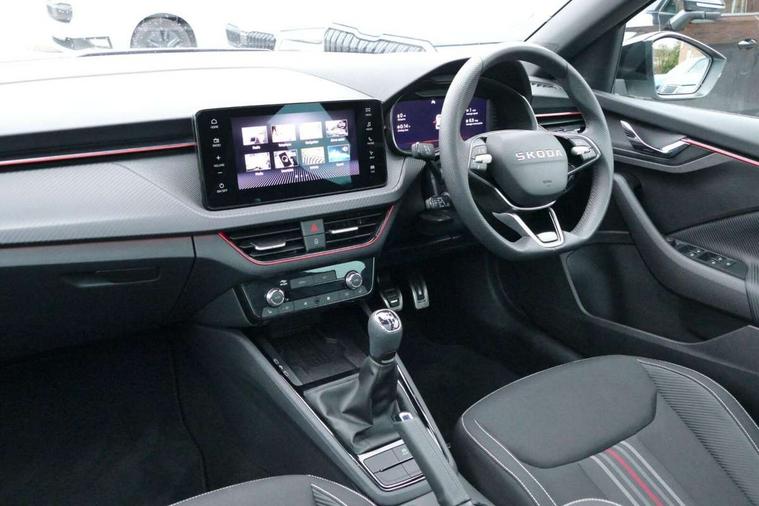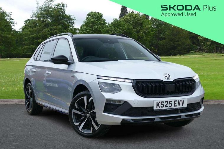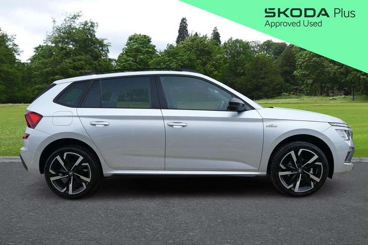 Advanced driver attention and drowsiness monitor, Bluetooth system, E-call, Front assist system, PAS, Rear parking sensors, Rear view camera, Service indicator, Speed limiter, Traffic sign recognition, Virtual cockpit with 10.25" display, Voice control system, Wireless smartlink, 4 USB C ports, 8 Speakers, 9.2" Skoda navigation display, DAB Digital radio, Auto dimming rear view mirror, Automatic headlight control with coming home and leaving home feature, Black door mirrors, Black radiator grille, Black rear diffuser, Black roof spoiler, Body colour bumpers, Body colour door handles, Boot lettering in black, Extended tailgate glass, Fixed panoramic sunroof with black roof rails, Front and rear electric windows, Heated rear window, LED daytime running lights, LED high beam, LED low beam, LED third brake light, Light sensors, Monte carlo plaque, Privacy glass, Rear side wing doors, Rear wiper, Ticket holder inside windscreen, 12V socket in luggage compartment, 3 seat bench in 2nd row, Aluminium pedals, Ambient lighting in white/red, Art leather carbon decor inserts, Art leather carbon door inserts, Black roof lining, Cargo elements, Chrome inner door handles, Driver and passenger sun visors with vanity mirror, Dual zone climate control, Front and rear roof lights, Front centre armrest, Front head restraints, Glove compartment with illumination, Height adjustable driver seat, Height adjustable front passenger seat, Ice scraper, Inner circulation control with pollen filter, ISOFIX on front passenger seat, Isofix preparation for back seats, Leather gearknob and handbrake lever, Manual lumbar support for front seats, Monte Carlo cloth upholstery, Net package and top tether hooks in boot space, Net under rear shelf, Pocket on the back of both front seats include mobile phone pockets, Rake/reach adjustable steering wheel, Reading lights, Rear centre armrests, Red hotstamping, Single front passenger seat, Sports seats, Textile floor mats, Third rear headrest, Top tether for front passenger seat, Umbrella in driver's door, Light and view plus package - Kamiq, 3x3 point rear seatbelts, Airbags - driver and front passenger, Disc brakes, ESP, Extended and predictive pedestrian/cyclist protection, Front passenger airbag deactivation switch, Front side airbags with curtain airbags, Hill hold control, Manual leather parking brake, Manual rear child locks, One tone horn, Seatbelt reminder for driver an co-driver, Traction control, Tyre pressure monitor, Anti-theft alarm system with interior monitoring, backup horn, towing protection and remote central locking with SAFE system, Anti-theft wheel bolts, Electronic engine immobilizer, 18" Ursa black diamond cut alloy wheels,