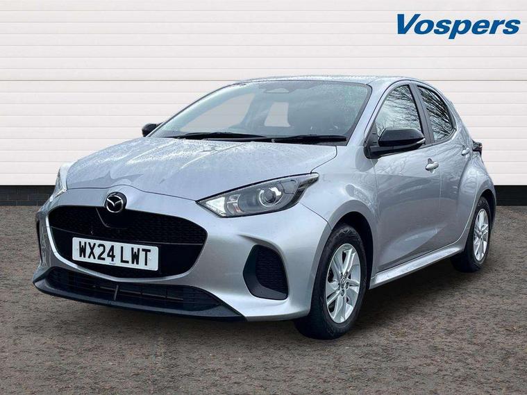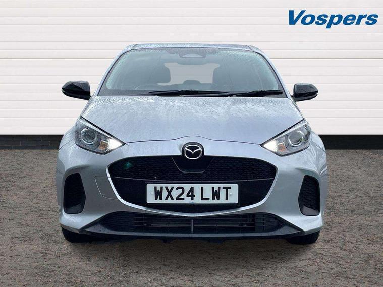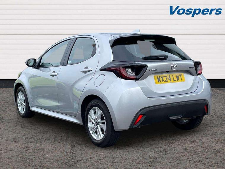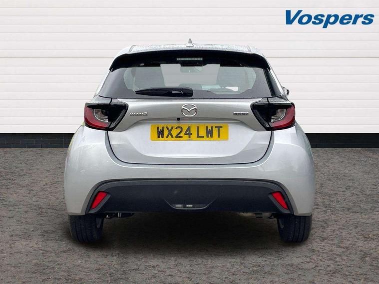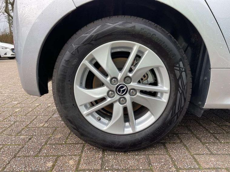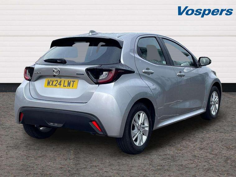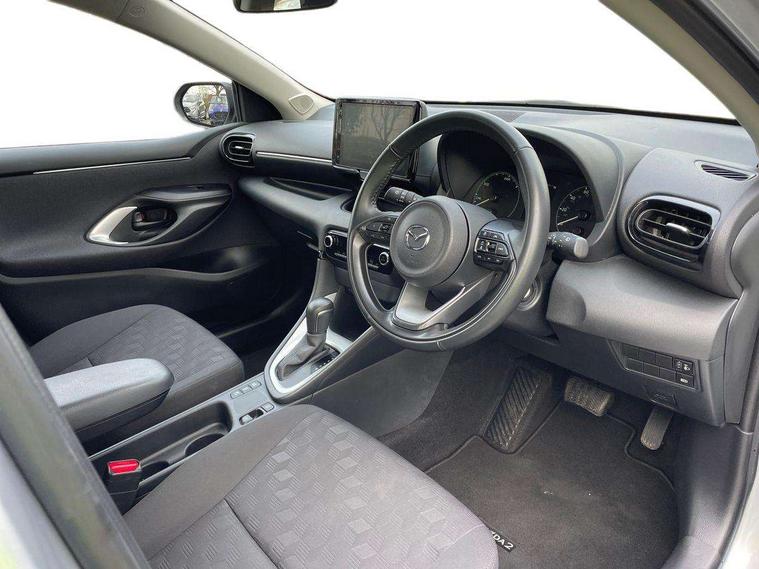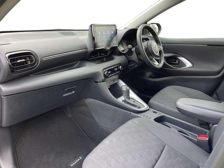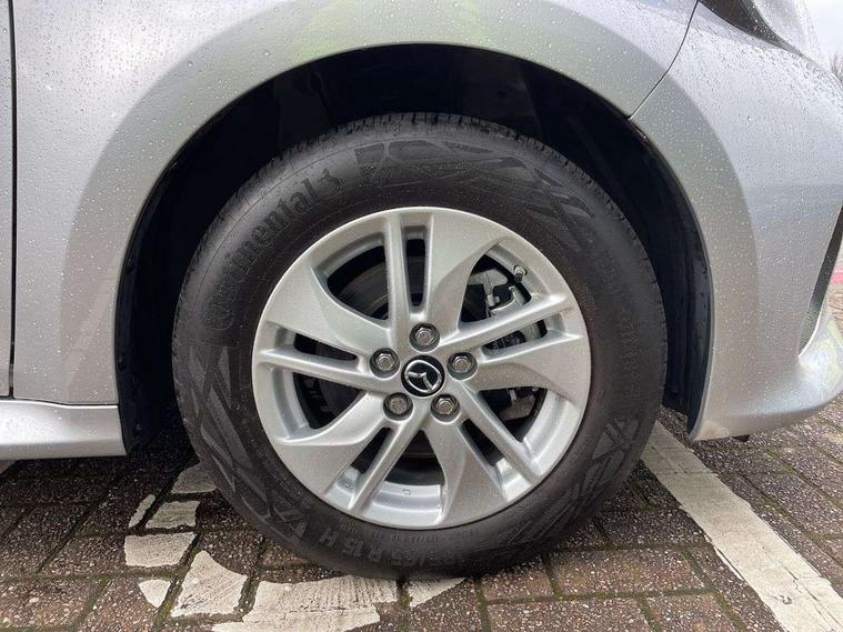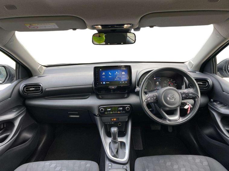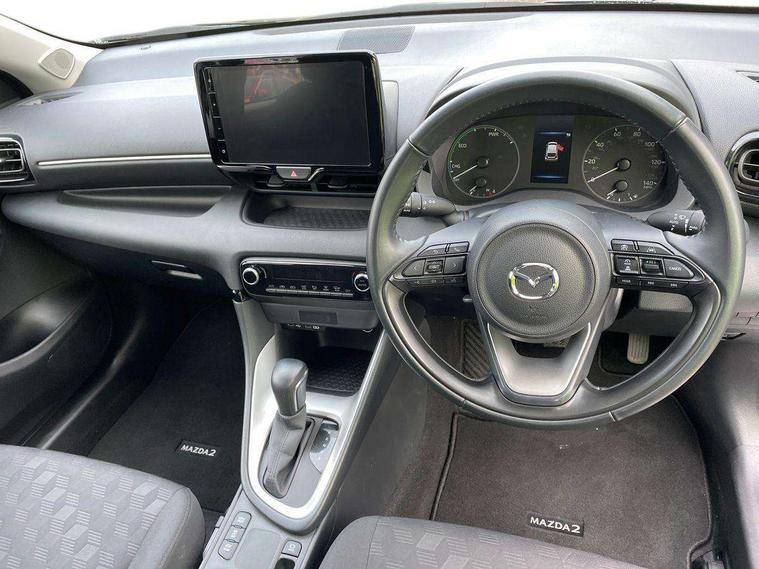 Adjustable speed limiter, Analogue instrument cluster with speedometer and hybrid system indicator, Drive mode selector (Eco, Normal and Power), Driver attention alert system, Dynamic radar cruise control, E-call with GPS, EV drive mode, Integrated bluetooth, Lane tracing assist includes Lane centering, Lane departure alert, Steering assist and Vehicle sway warning, Multi-information display, PAS, Reversing camera, Road sign assist - RSA, Service indicator, Tailgate, Trip computer, Wireless Apple CarPlay and wired Android Auto, i-stop, 6 speaker audio system and 9" colour screen centre display, DAB Digital radio, Steering wheel mounted audio/bluetooth controls, USB type C port, Automatic high beam - AHB, Black lower window garnish, Body coloured front bumper, Body coloured rear bumper with satin black lower mouldings, Coming home function, Dusk sensing headlights, Front and rear electric windows, Gloss black electric adjustable/heated door mirrors, Gloss black front grille, Gloss black rear roof spoiler, Halogen headlights with manual headlight levelling, Hybrid badge, LED daytime running lights, LED rear combination light with halogen turn signals, LED third brake light, Mazda unique tailgate garnish, Rain sensing front wipers with adjustable sensitivity and speed, Rear side wing doors, Rear wash wiper, Shark fin antenna, 12V power outlet, 3 seat bench in 2nd row, 60/40 split fold down rear seats, Climate control air conditioning, Cloth upholstery, Driver, front passenger and two rear door storage, Driver, Front passenger and two rear grab handles with coathooks, Drivers seat manual slide recline and height adjustment, Drivers/front passengers with covered vanity mirrors, Front centre armrest with console storage, Front head restraints, Glovebox, Grey roof lining in pillar and ceiling, Interior courtesy light, ISOFIX child seat anchorage points attached on outer rear seats, Leather handbrake, Leather wrapped gearshift, Leather wrapped steering wheel with telescopic and tilt adjustment, Luggage compartment light, Single front passenger seat, Three height adjustable rear head restraints, 2x3 point front seatbelts with pre-tensioners, 3 point seatbelts on all rear seats, Airbags - driver and front passenger, Anti-lock braking system (ABS), Collision mitigation braking system, Driver and passenger central airbags, Dynamic stability control + Traction control, Electronic parking brake with auto-hold and auto-disengage function, Emergency brake light signal (EBS), ESP, Front and rear curtain airbags, Front passenger airbag cut-off switch, Front side airbags, Hill start assist control (HAC), Manual child lock in rear doors, Pre-crash safety system - PCS, Regenerative braking system, Seatbelt reminder audible warning, Tyre pressure monitoring system, Deadlocking system, Remote central locking, Thatcham approved immobiliser and alarm, 15" Alloy wheels, Emergency tyre repair kit,