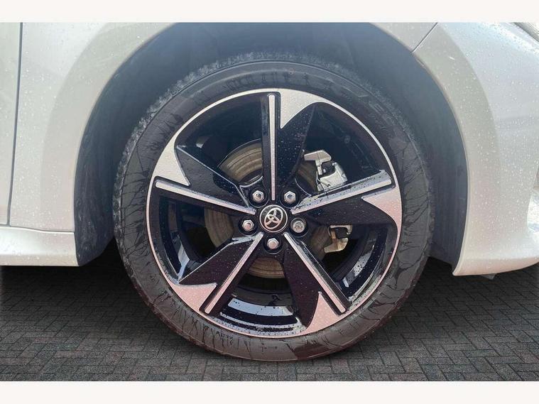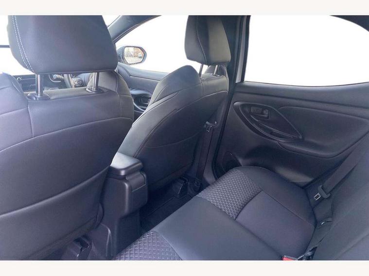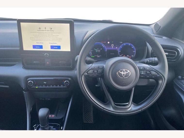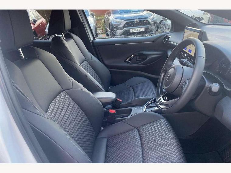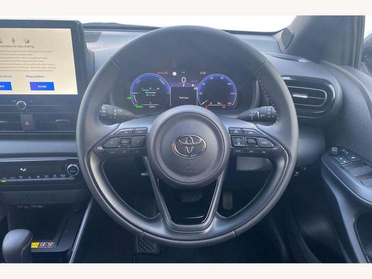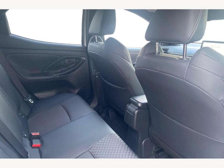 12.3" Digital Combimeter, Adaptive cruise control, Adjustable speed limit with speed warning, Bluetooth connectivity, Colour binocular inspired displays with digital speedometer, E-call, Electric power steering, Hybrid energy display, Lane trace assist, Multi information display switches on steering wheel, Pre-collision system (PCS), Reversing camera, Tailgate, Voice recognition, Wireless charger, Vehicle Stability Control (VSC), 10.5" Toyota smart connect multimedia with wireless smartphone integration incl apple car play and cloud Navigation, 6 speakers, Toyota Touch 3 system with DAB radio, USB connection, Acoustic windscreen glass, Auto high beam assist, Auto windscreen wipers, Automatic headlights, Body coloured door mirrors, Electric adjustable heated door mirrors, Follow me home headlights, Front auto power windows with anti jam protection, LED daytime running lights, LED front fog lights, LED front light guide, LED Headlights, LED High mounted stop lamp, LED Indicators, LED rear light guide, Manual headlight levelling, Painted chequered front grille, Rain sensor, Rear auto power windows with anti jam protection, Rear privacy glass, Rear roof spoiler, Rear side wing doors, Rear wiper, Satin lower front grille, Shark fin antenna, Turning signal integrated indicators in door mirrors, Variable front intermittent wipers, 3 adjustable rear headrests, 3 seat bench in 2nd row, 3 spoke leather steering wheel, 60/40 split folding rear seat, Active headrests, Adjustable boot height, Coat hooks in rear grab handles, Cup holders (2 front & door), Data Communication Module (DCM) connected services, Dual zone automatic air conditioning, Front armrest, Front sport seats, Glovebox, Grey roof lining, Height adjustable driver's seat, Height adjustable passenger seat, Isofix seat fixing, Leather gearshift, Map pockets on the backs of the front seats, Nanoe-X air purifier, Partial leather upholstery, Pollen filter, Shopping bag hooks, Single front passenger seat, Tilt/telescopic steering column, Safety pack - Yaris, 3 point seatbelts on all rear seats, ABS+EBD+Brake assist, Electronic parking brake, Emergency brake light system (EBS), Front passenger airbag on/off switch, Front seatbelt reminder, Hill start assist control (HAC), Rear child proof door locks, Rear seat belt reminder, Supplemental Restraint System (SRS) 8 airbags: Driver & passenger's airbags, dual side curtain airbags, side impact airbags, front centre airbag, Toyota Safety Sense 3 with over the air updates, Tyre pressure warning system, 2x Master key, Alarm/immobiliser, Keyless smart entry with push button start, Remote AC via MyT, Remote locking via MyT, Remote powered central double locking doors, Piano black interior trim, Satin chrome interior styling, Soft touch instrument panel, Space saver spare wheel,