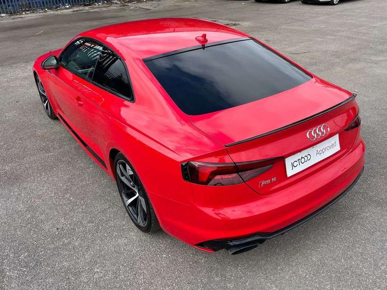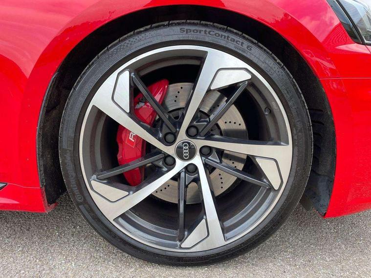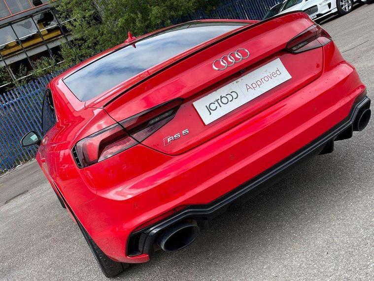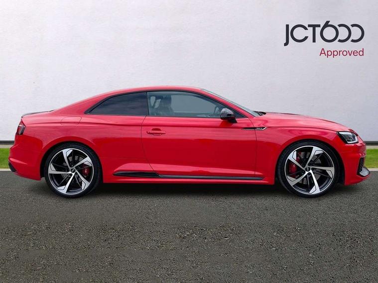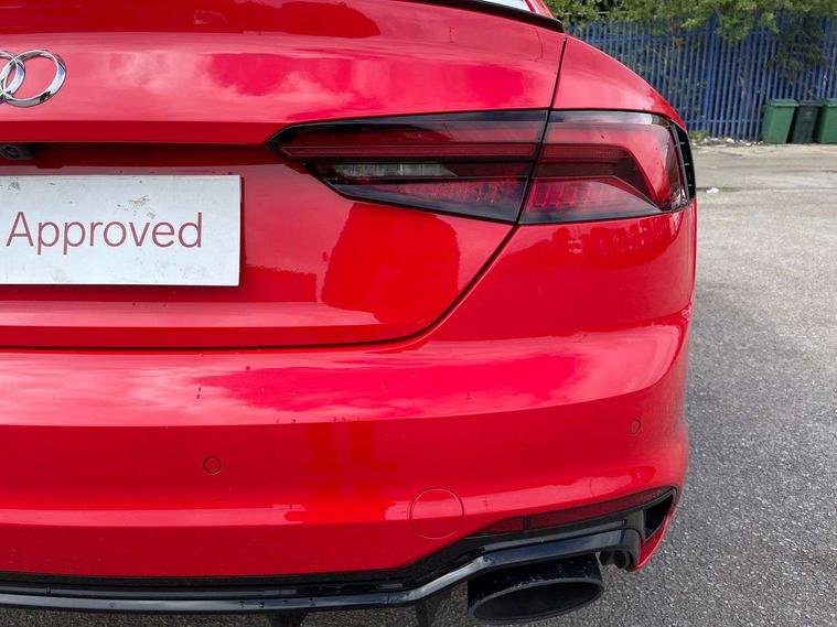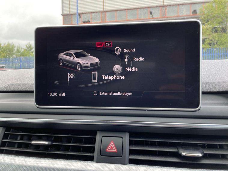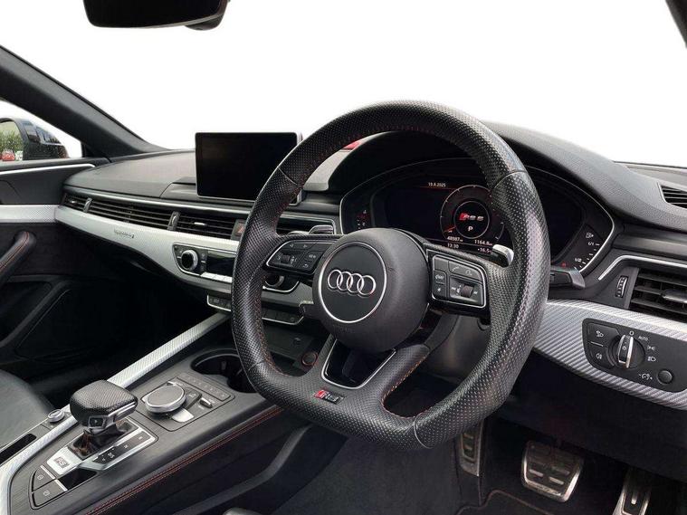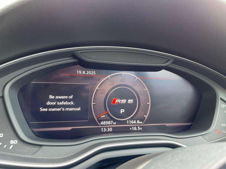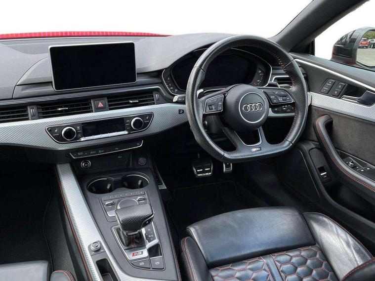 Audi connect, Audi drive select, Audi parking system plus with front and rear sensors, Audi smartphone interface, Colour driver's information system display, Electric boot release, MMI navigation plus with MMI touch, Mobile telephone preparation - bluetooth interface, Service interval indicator, Virtual cockpit, Voice control system, Quattro sports differential, CD player, DAB Digital radio, MMI radio plus with 7" colour MMI screen and MMI controller, Two SDXC card slots, Air inlets in titanium black, Auto dimming rear view mirror with acoustic windscreen, Body colour bumpers, Body colour door handles, Body colour rear diffuser with chrome strip, Electric front windows, Electrically adjustable and heated door mirrors, Front fog lights, Headlight washers, Heat insulated glass, High beam assistant, Rain and light sensors, Twilight grey matt radiator grille in matt aluminium inlay, Twilight grey matt rear diffuser, Twin chrome exhaust tailpipes x2, 2 x USB charging port with aux input socket, Adjustable steering column, Aluminium door sill trims, Automatic tri-zone climate control, Black headlining, Boot mat, Centre console with cupholders, Electric lumbar support, Fine Nappa leather upholstery, Front centre armrest, Front head restraints, Front/rear floor mats, Illuminated door sills, Isofix front passenger and rear seat preparation, Jack and tool kit, Massage function for front seats, Rear centre armrest, Rear headrests, Rear seat storage trays, Split folding rear seat, Stainless steel pedals and foot rest, Super sports seats, Top tether anchor plate for isofix child seat, Extended interior upholstery pack - A5/RS5, Non Smokers pack, ABS, ASR, Driver/Front Passenger airbags, Enhanced braking system, ESP + traction control, First aid kit, Front and rear curtain airbags, Front passenger airbag deactivation, Height adjustable front seatbelts, Multi-Collision braking, Pre-sense city emergency braking system, Seatbelt warning, Side airbags, Warning triangle, Anti theft system, Keyless Start, Locking wheel bolts, Remote central locking, Space saver spare wheel,