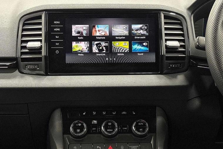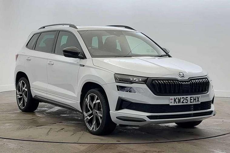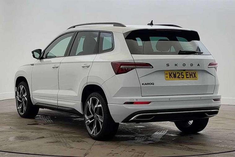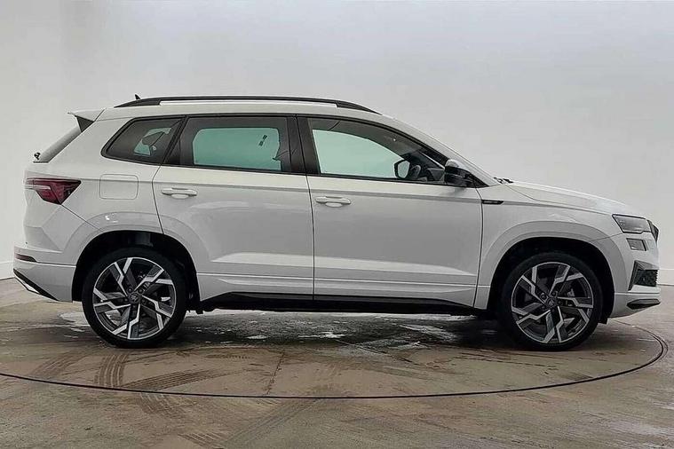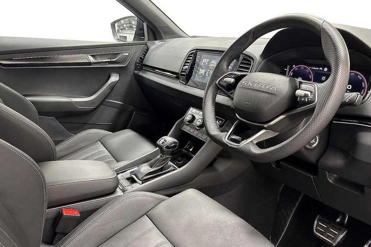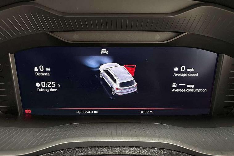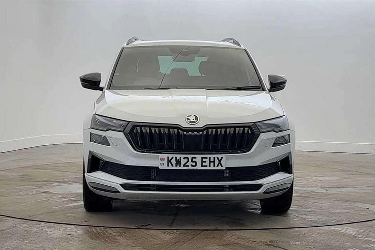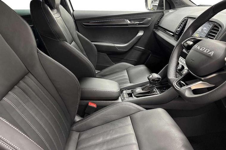 Advanced driver attention and drowsiness monitor, Emergency services call system, Outside temperature gauge, Sensor for driver assistance systems, Service interval indicator, SmartLink wireless for Apple and wired for Android, Start/stop system with regenerative braking, Traffic sign recognition, USB C Port x 2 in front centre console, Virtual Cockpit - 10.25" digital display, Virtual pedal with electrically operated boot door, Wireless smartphone charging, DAB radio with Bluetooth, USB connection, Acoustic glass, Aero front windscreen wipers with intermittent function, Auto dimming rear view mirror with light and rain sensors, Black door mirrors, Black electric window control buttons, Black radiator grille, Black roof rails, Body colour door handles, Electric front and rear windows with child proof lock, Extended rear roof spoiler, Front door steps with SportLine logo, Heated rear windscreen, LED daytime running lights, LED rear lights with high functionality welcome effect and dynamic indicators, Light assistant (coming/leaving home/tunnel light), Panoramic sliding sunroof, Plastic scuff plates in door apertures, Privacy glass, Protective door side sills in body colour, Rear diffuser, Rear side wing doors, Rear window wiper with washer system and intermittent control, Safety reflectors on front doors, Skoda lettering on tailgate in black, Sportline badge on front fender, Sports front and rear bumpers, Third brake light, Unique dark chrome design logo on alloy wheels, 1.5 litre bottle holders in driver and front passenger door panels, 12V socket in boot, 12v socket in front centre armrest with storage compartment and rear air vents, 2 x Tablet holder, 3 rear height adjustable headrests, 3 seat bench in 2nd row, 3 spoke sports leather heated multifunction steering wheel with DSG paddles, 4 foldable roof handles with rear coat hooks, Black floor carpet, Cargo elements in boot, Chrome inner door handles, Foldable hooks in the boot, Front head restraints, Height adjustable front three point seats belts with tensioners, Height/reach adjust steering wheel, Ice scraper, Illuminated glovebox, Illuminated luggage compartment, Isofix child seat preparation for front passenger seat, Isofix child seat preparation outer rear, Manual lumbar support for front seats, Pen holder, Pollen filter, Rear backrest release from boot, Rear boot cover, Rear package tray, Rear reading lights, Rear seats fixed folding and divided 60:40, Rubbish bin door, Safety vest holder, Single front passenger seat, Skoda lettering on steering wheel, Sportline decorative inserts, Storage box in upper central dashboard closed, Sunvisors with illuminated vanity mirrors, Textile floor mats, Ticket holder, Titan black interior ceiling, Umbrella under passenger seat, Under passenger seat storage compartment, Columbus pack - Karoq, LED Interior lighting pack with Skoda welcome logo - Karoq, Light Pack - Karoq, Non Smokers pack, Performance pack - Karoq, Winter plus pack with heated front and rear seats - Karoq, Automatic door unlocking in case of crash, Automatic fuel cut off in case of crash, Driver airbag, Electronic parking brake with auto hold function, Emergency rear braking signal, ESC (incl. ABS+MSR+ASR+EDS+HBA+DSR+RBS+MKB), Front side airbags, Head airbags, Hill hold control, Knee airbags, Passenger airbag with switch-off function, Pedestrian monitor, Seatbelt reminder signalisation and pretensioner for all seats, Three point seatbelts rear, Two tone horn, Tyre pressure monitor, Alarm with interior monitoring, back up horn and tilt sensor with safe function, Electronic engine immobiliser, Keyless entry and start/stop, Remote central locking with 2 remote folding keys, Black air vent surround, Black centre console, carbon door decor, Satin black dashboard, Satin black door trim, 19" Sagittarius anthracite alloy wheels, Anti-theft wheel bolts protection, Breakdown and tool kit,