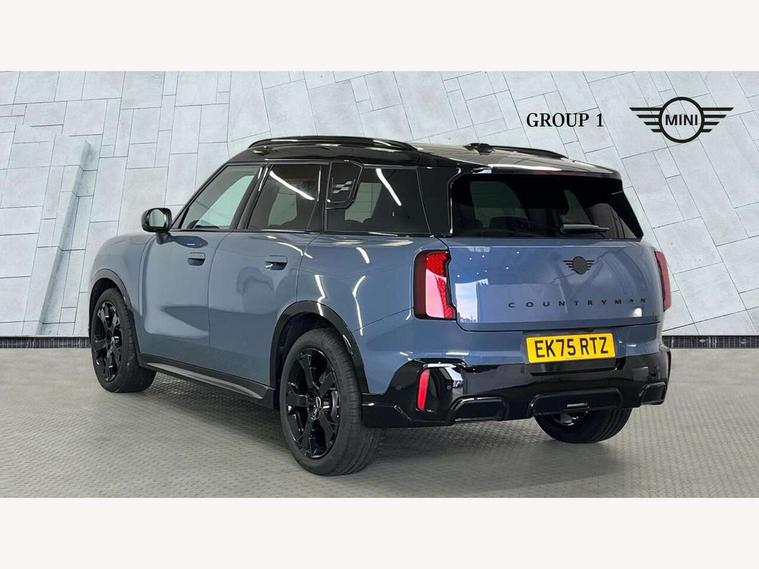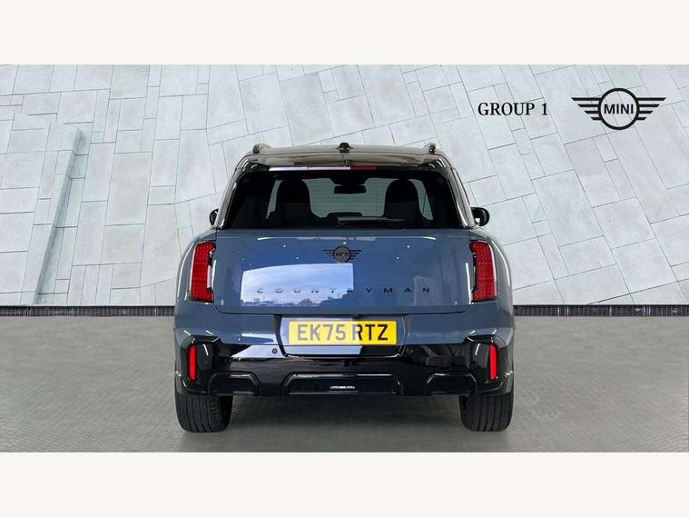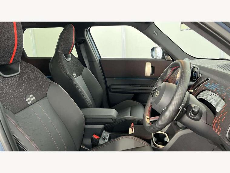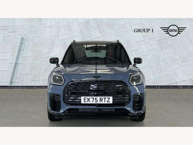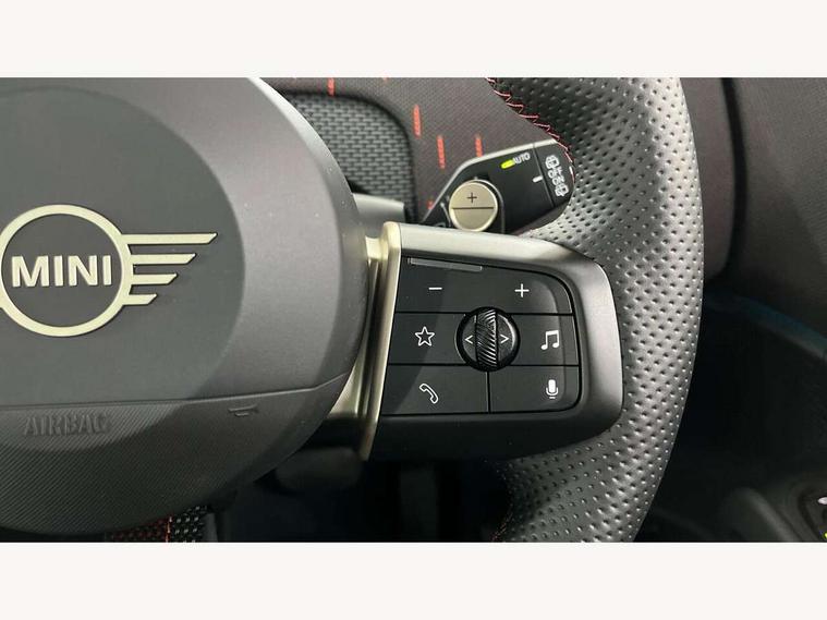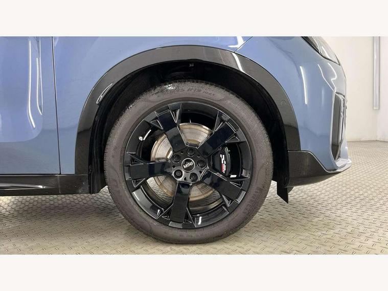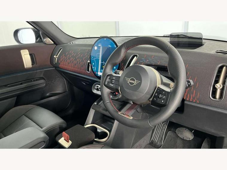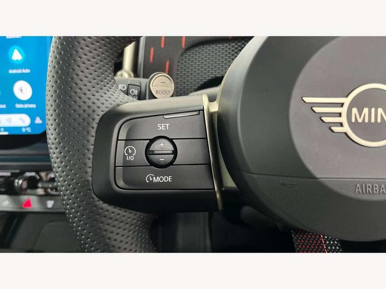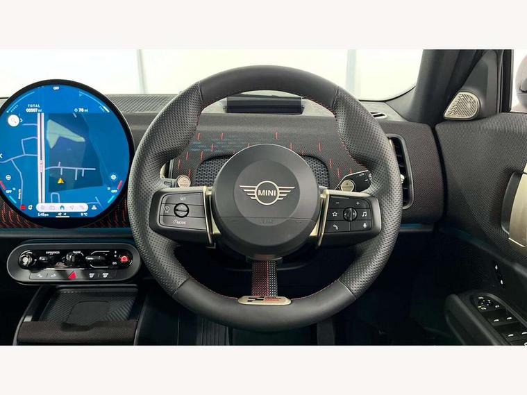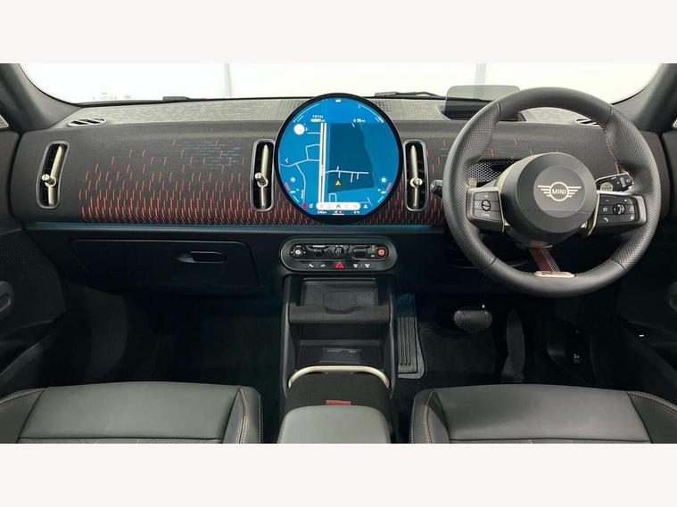Bluetooth connection, Circular OLED Screen, Compatible mobile phone bluetooth with audio streaming, Cruise Control (DCC), Digital dashboard display, Driving assistant, E-call, Electro-mechanical speed dependant steering assistance, MINI Experience Modes, Mini navigation system, MINI TeleServices, Parking assistant in camera and ultrasound based assistance system, rear view camera, parking aid and distance control, Adaptive suspension, Double clutch sports transmission, Larger capacity fuel tank, 6 speakers, DAB Digital radio, Personal eSim, Auto tailgate, Electric adjustable heated door mirrors, Front and rear apron, Front and rear electric windows, Heated rear window, High gloss hexagonal patterned grille surround, LED daytime running lights, LED Headlights, LED rear lights, LED third brake light, Rain sensor with auto headlights, Rear roof spoiler with airblades, Rear side wing doors, Rear window wiper, Roof rails, 3 seat bench in 2nd row, 60/40 split rear bench seat, Anthracite headliner, Auto air conditioning, Floor mats, Front armrest, Front headrests, Heated steering wheel, Height and length steering column adjustment, JCW Front sports seats, Lidded storage box in Black/Red knit, Perforated Vescin steering wheel, Rear headrests, Single front passenger seat, Sunvisors with vanity mirrors, 3x3 point rear seat belts, 6 Airbags - front, side, head and seat belt tensioners, ABS, Brake calipers in Black with JCW badge, DSC - Dynamic Stability Control, Electronic handbrake, Electronic Stability Programme (ESP), Front ISOFIX (iSize), Hill hold assist, Hill start assist, JCW Sport Brakes, Manual rear child locks, Traction control, Tyre pressure monitoring system, Warning triangle, Alarm system with tilt sensor, monitoring doors, bonnet interior and tailgate, Auto drive away locking, Deadlocking function, Electronic vehicle immobiliser, Locking wheel bolts, Remote control locking, Start/stop toggle with keyless go, Tyre repair kit plus,