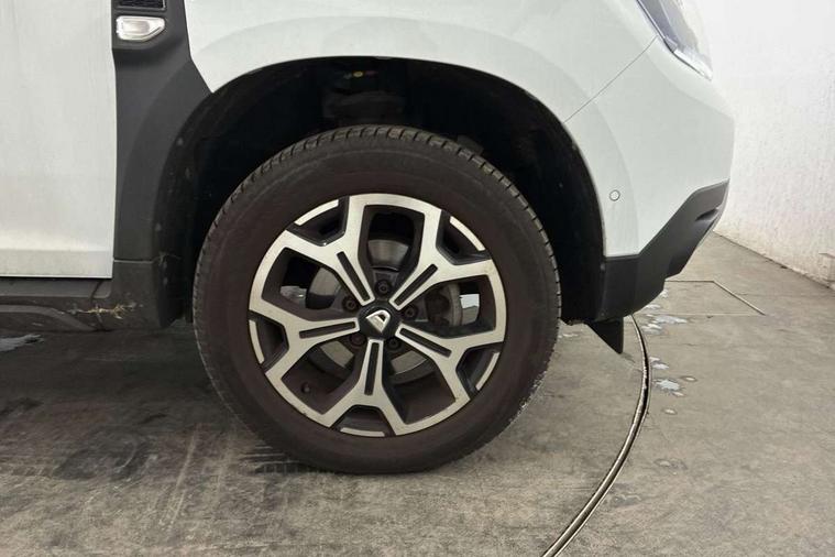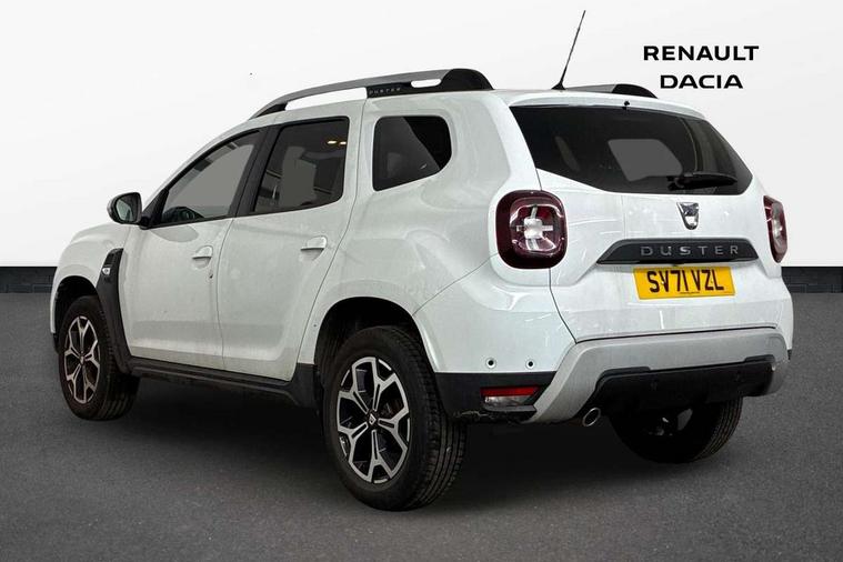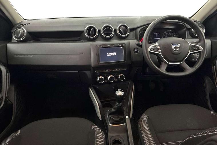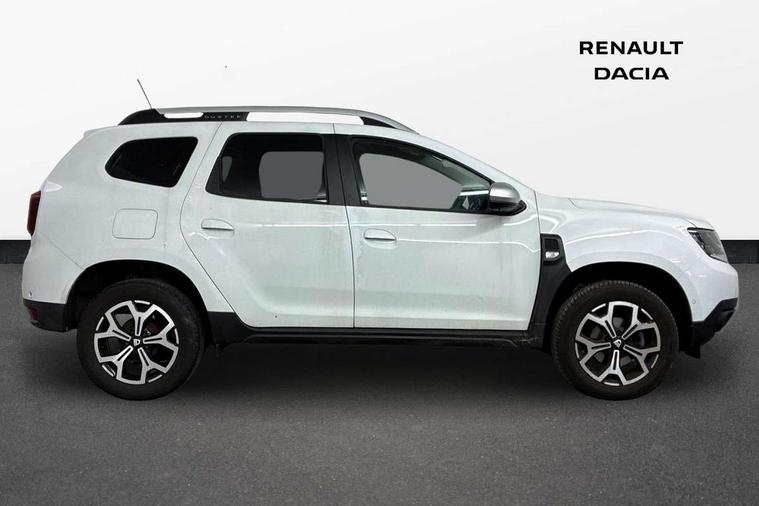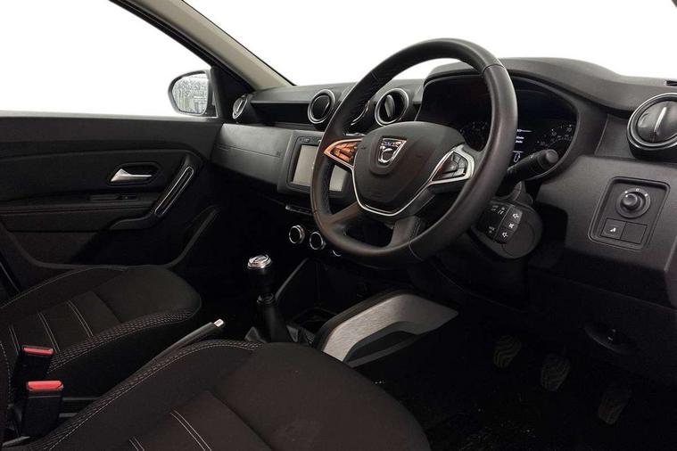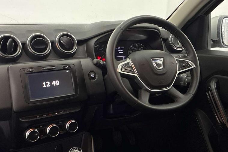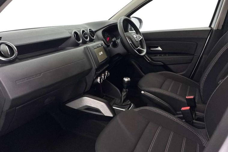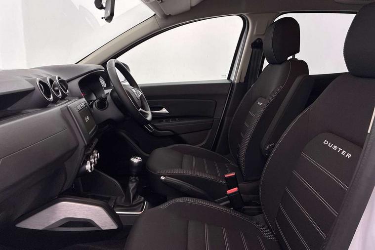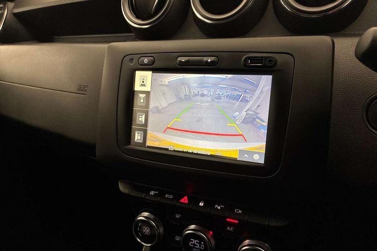 Dark carbon central console surround, Matt black central console fascia, Piano black decorative insert on door panels, Satin chrome air vent surround, Satin chrome instrument dial surrounds, 17" diamond cut alloy wheels, Keyless entry, Remote central locking, Thatcham approved engine immobiliser, 4x 20W FM/AM/DAB tuner with steering column mounted fingertip controls, Aux-in socket, USB connection for MP3 players, 3x3 point rear seatbelts, ABS and Emergency brake assist, ASR traction control with Electronic stability control, Child locks on rear doors, Door open visual and audible warning, Driver airbag, Driver and passenger seatbelt not fastened - visual and audible warning, Front passenger airbag, Front passenger airbag deactivation, Front seatbelt pretensioners, Front side airbags, Height adjustable front seatbelts, Tyre pressure monitor, 3 speed windscreen wipers, Black number plate surround, Black side sills, Black/satin chrome tailgate trim with Duster inscription in black background and lettering, Body coloured door handles, Body coloured front and rear upper section bumpers, Chrome front grille, Dark glass on lateral rear windows, Dark metal door mirrors in grey, Daytime running lights, Double optic headlights, Electric adjustable/heated door mirrors, Electric front windows, Electric rear windows, Front and rear black lower section bumpers, Front door sill protection strip, Front fog lights, Heated rear window, High level third rear brake light, LED automatically switched on - In main headlights, Rear wash/wipe, Satin chrome front and rear skid plates, Satin chrome longitudinal roof bars, 3 rear height adjustable headrests, 4 speed heating and ventilation with air recirculation, 60/40 split folding rear seat, Boot light, Climate control, Driver seat lumbar adjustment, Fabric decorative insert on door panels, Front passenger reading light, Front seat armrests, Gear shift indicator, Glovebox light, Height adjustable driver seat, Height adjustable front headrests, Height adjustable steering wheel, Isofix points for child seats in both outer rear seats, Map pocket on front seat backs, Matt black front door handles, Matt black rear door handles, Passenger sunvisor with vanity mirror, Rear passenger reading light, Satin chrome gear lever cap insert, Satin chrome lower steering wheel insert, Soft feel steering wheel, Blind spot monitoring, Bluetooth connectivity, Cruise control, Dusk sensor, Eco mode, Electric power assisted steering, MediaNav Evolution 7" touchscreen multimedia system with satellite navigation, Apple car play and Android auto, RDS with TMC, siri voice recognition, Multi view camera, On board computer, odometer, trip computer, average fuel consumption, average speed, service indicator, outside temperature gauge, Rear parking camera, Rear parking sensors, Rev counter, Speed limiter, Stop/start system,