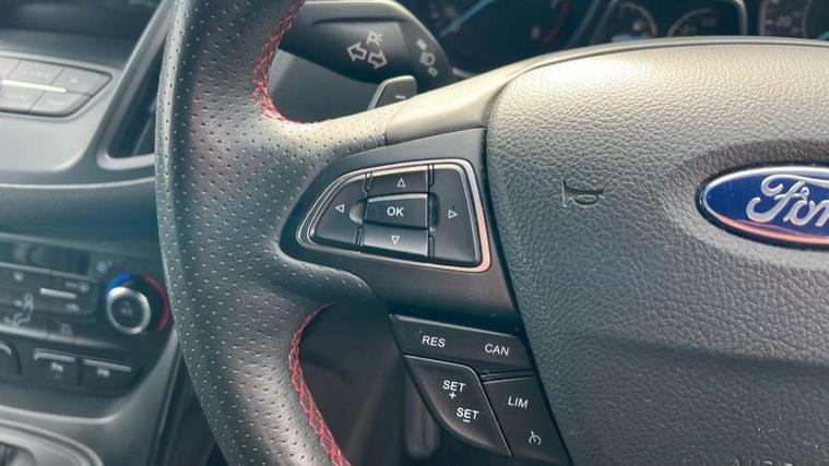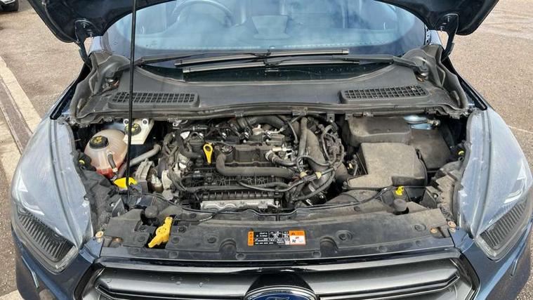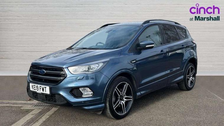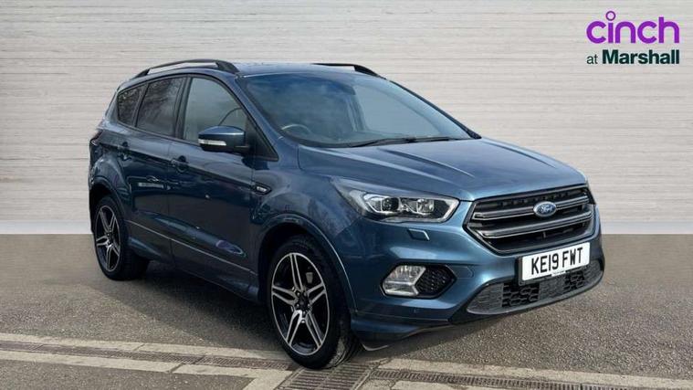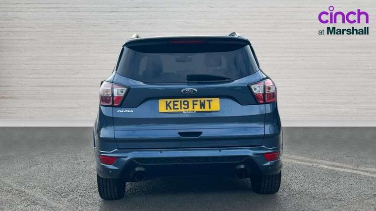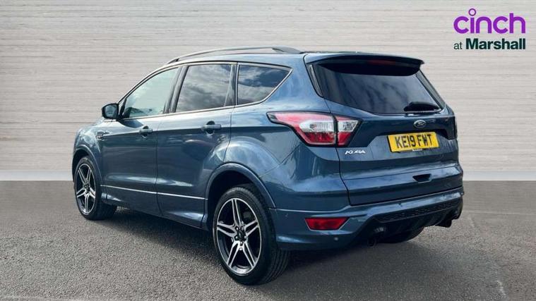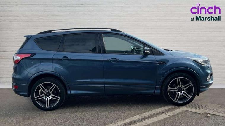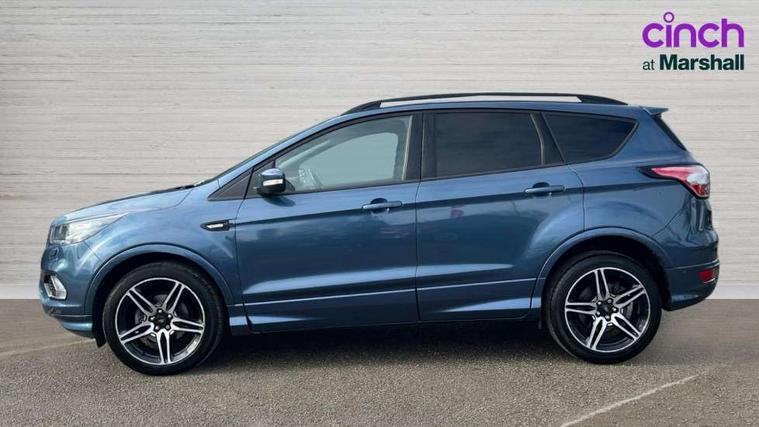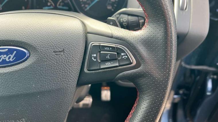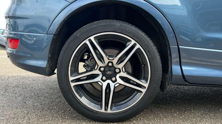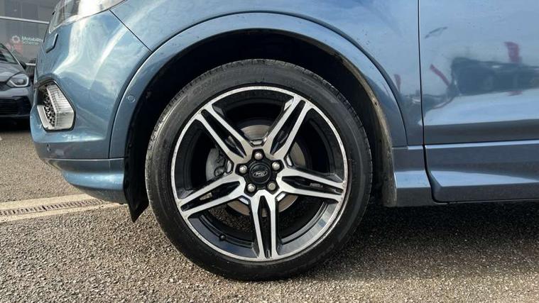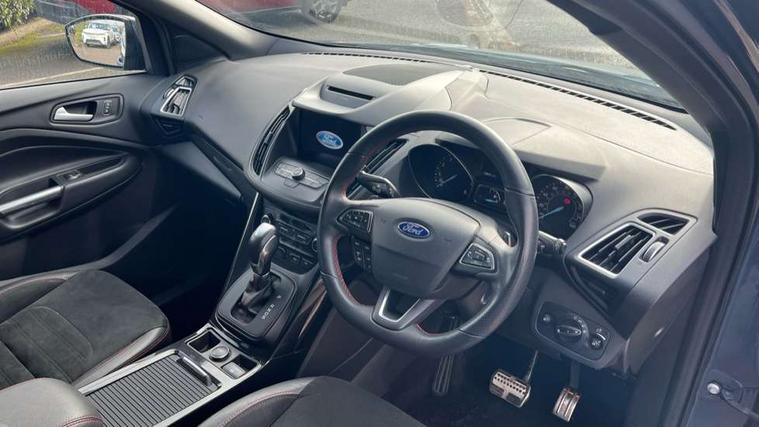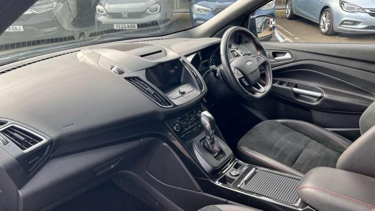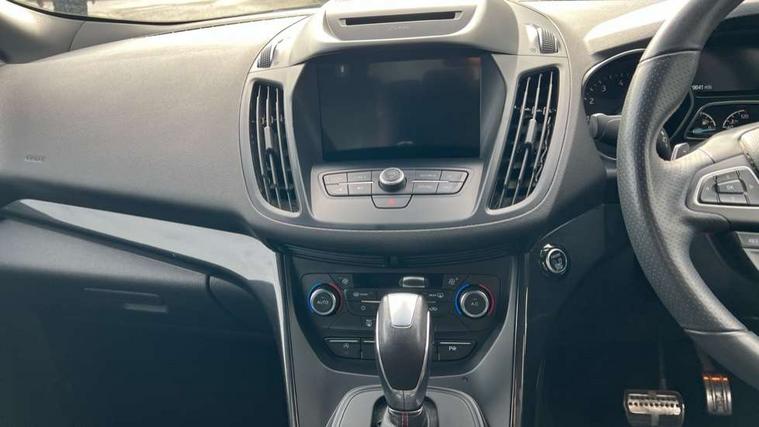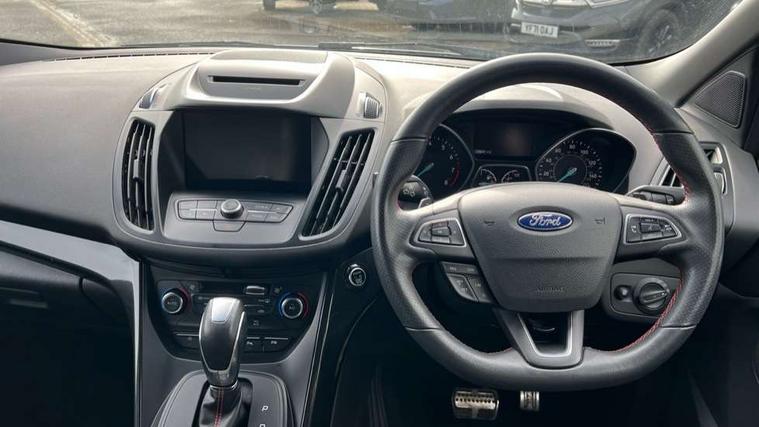 Apple car play/Android Auto, Enhanced active park assist including perpendicular parking pull out assist, flank guard and front/rear parking sensor, EPAS, Hands free telephone, Trip computer, Sports suspension, 2 USB ports, Auxiliary socket for external device, Remote audio controls on steering wheel, Auto dimming rear view mirror, Body colour bumpers, Body colour rear spoiler, Body styling kit - Body colour front/rear/side skirts, door claddings, wheel arches, high gloss black rear mesh, silver skid plate and rear diffuser, Electrically operated and heated door mirrors with side indicators, Electrically operated front and rear windows with global closing, Front fog lights, Front scuff plate, Power folding door mirrors, Quickclear heated windscreen, Rain sensing wipers, Tailgate wash/wipe, Twin exhaust pipes, 6 way manually adjustable driver's seat with lumbar support, 6 way manually adjustable passenger seat with lumbar support, 60/40 split/folding rear back and cushion, Alloy Foot Pedals, Auxiliary power socket in luggage area, Centre console with stowage tray/bottle holder/CD stowage/front and rear 12V power point, Dark headliner, Driver/passenger front seatback pockets, Dual electronic automatic temperature control, Flat bottomed leather steering wheel with red stitching + gear knob, Floor mats with red stitching, Folding rear centre armrest, Footwell courtesy lights front and rear, Front head restraints, Front overhead courtesy lights with theatre style dimming and delay, Front/rear reading lights, Gearshift paddles, Isofix system on outer rear seats, Part leather upholstery, Reach + rake adjustable steering column, Rear head restraints, Sports style front seats, Stowage unit in upper instrument panel, Tie down hooks, Tonneau cover, Variable intensity instrument illumination, Appearance pack - Kuga/ST-Line, 3 point seatbelts on all 3 rear seats, ABS/EBD, Airbags - front driver/passenger, front & rear side, curtain, drivers knee, EBA, Electric traction assist system, Electronic Stability Programme, Front passenger airbag deactivation switch, Hill start assist, Intelligent Protection System (IPS), Tyre pressure monitoring system, Engine immobiliser, Keyless entry, Keyless start with 'Ford Power' starter button, Locking wheel nuts, MyKey system, Remote powered central double locking doors, Thatcham category 1 alarm, Mini steel spare wheel,