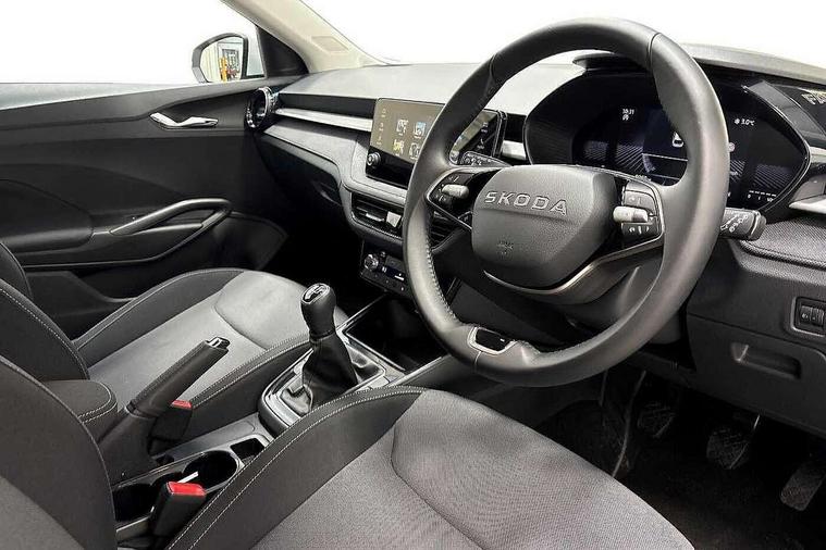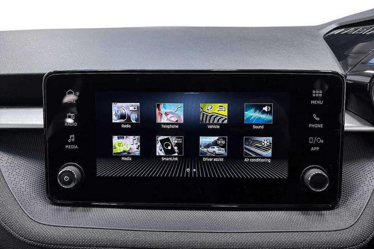 8" Digital instrument display, Advanced driver attention and drowsiness monitor, Bluetooth connection, Electromechanical power steering, Exterior temperature gauge, Service interval indicator, Traffic sign recognition, Wireless SmartLink for Apple CarPlay and Android Auto, 6 Speakers (4 in front and 2 in rear), 8.25" Skoda infotainment touchscreen display, Auxiliary socket for external MP3 player, DAB digital radio reception, Auto dimming rear view mirror, Body colour door mirrors, Body coloured bumpers, Door mirror integrated indicators, Front and rear electric windows, Front window wiper intermittent control, Headlight range control - Automatic, Ice scraper in fuel cap, LED 3rd brake light, LED daytime running lights with coming and leaving home feature, LED rear lights, Rear LED fog light, Rear side wing doors, Rear window wiper with washing nozzles, Roof mounted spoiler, SKODA tailgate lettering in chrome, Unique dark chrome design logo on alloy wheels, 2 reading lights in front and 2 reading lights in rear, 3 rear headrests, Backrest split and folding, Central console with removable cup holder and storage box, Chrome handbrake release button, Dual zone air conditioning with climatronic electronic control, Fabric upholstery, Front centre armrest, Gearshift knob/handle in leather, Grain satin black interior door handles, Hand brake lever handle in leather, Height adjustable front headrests, Height adjustable front seats, Height adjustable steering wheel, ISOFIX and TopTether anchorage points to the outer rear seats, ISOFIX and TopTether on the front passenger seat, Luggage compartment lighting, Manually adjustable lumbar support in front seats, Pollen filter, Rear seat bench unsplit, Single front passenger seat, Skoda lettering on steering wheel, Storm grey headlining, Sun visors with mirror and airbag label on passenger side, Textile floor mats, Ticket holder, Umbrella in drivers door, 3-point height adjustable front seats belts with pretensioner and force limiter, Automatic warning lights in case of crash, Driver and passengers airbag with switch off function, e-Call+, ESC including ABS, MSR, ASR, EDS, HBA and XDS, Front and rear seat belt warning, FRONT ASSIST (AEB City and AEB Inter Urban), Front side airbags, Head airbags, One tone horn, Pedestrian protection, Three rear 3-points safety seat belts with pretensioner and force limiter including stop function for outer rear seat belts, Tyre pressure monitoring system, Anti-theft alarm system including immobiliser, interior monitoring, backup horn, and towing protection, Central locking with radio remote control, interior controls, SAFE function and 2 foldable keys, Black painted air vents, Grain satin black central console cover, Metallic grey upper decorative trim, Satin black door and side trim panel in front, Textile Kota grey lower decorative inserts, Anti-theft wheel bolts protection, Super-low rolling resistance tyres,