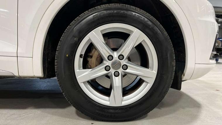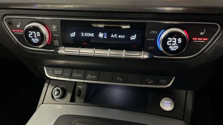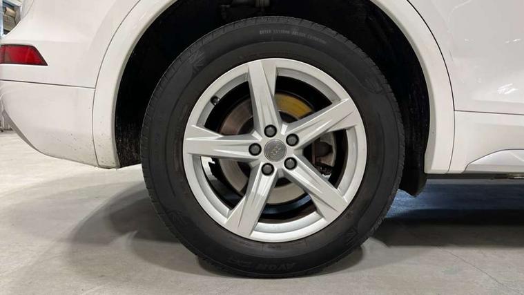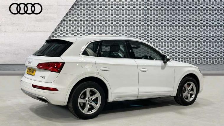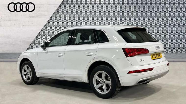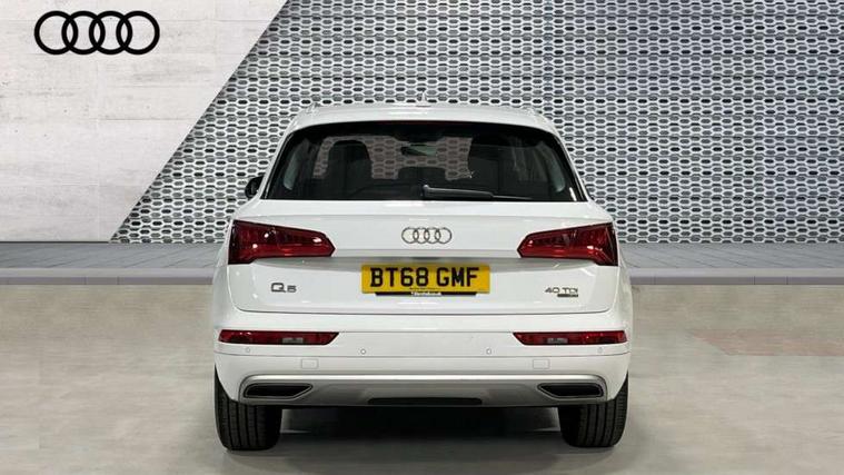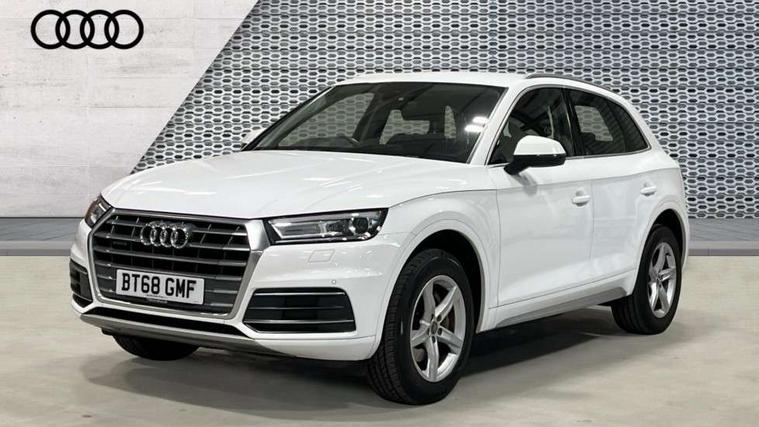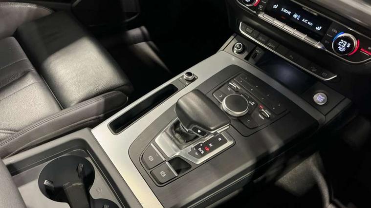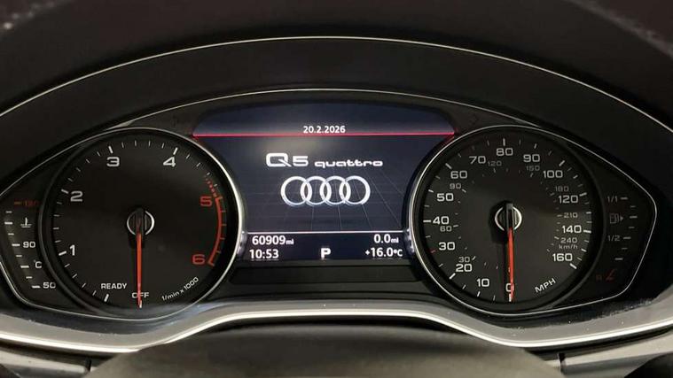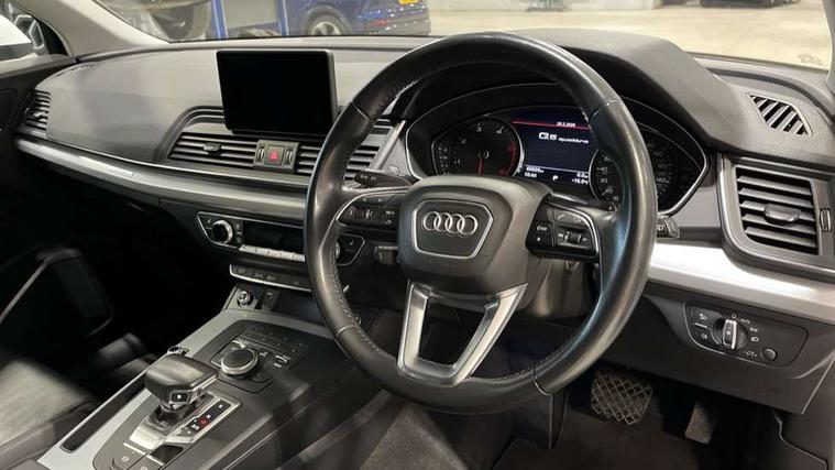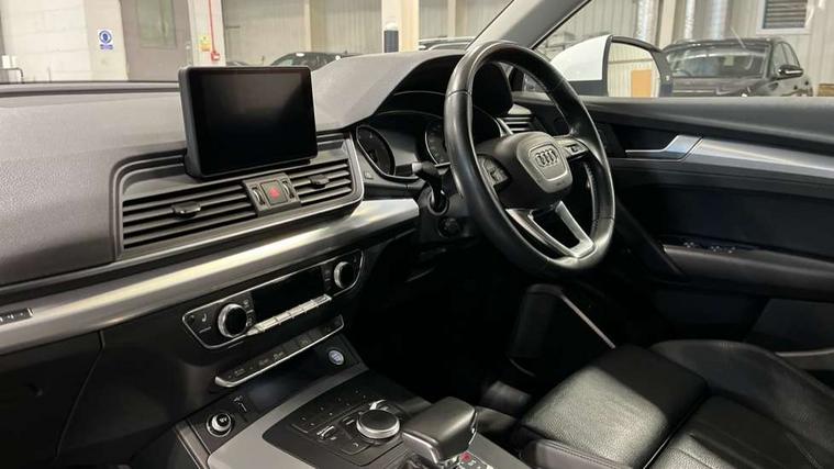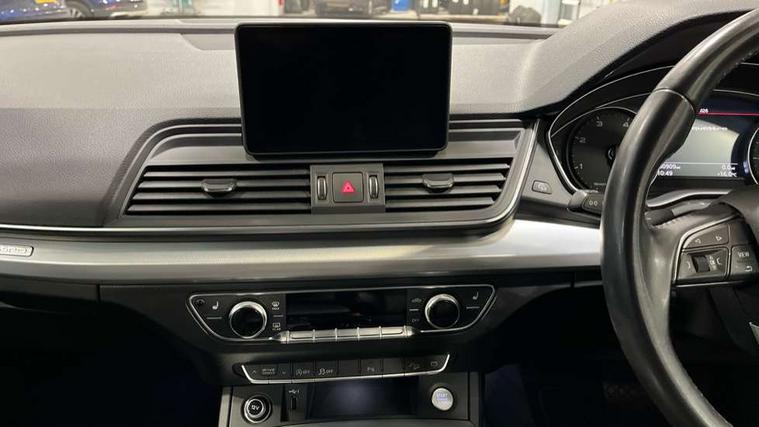 7" Colour driver information system, Audi drive select, Audi parking system plus with front and rear sensors, Audi smartphone interface, Automatic start/stop system, Electro - mechanical power assisted steering, MMI Navigation, Mobile telephone preparation - bluetooth interface, Power tailgate, Service interval indicator, Voice control system, Diesel particulate filter, 2x SD card slot, CD player, DAB Digital radio, MMI radio plus with 7" colour MMI screen and MMI controller, Acoustic windscreen, Air inlets in matt titanium black with blades in matt aluminium silver, Aluminium roof rails, Auto dimming rear view mirror, Automatic headlight levelling, Body colour bumpers, Body colour door mirrors, Chrome exhaust tailpipe, Front and rear electric windows, Light and rain sensor for auto activation of lights and windscreen wipers, Loading sill protector in stainless steel, Matt selenite silver underbody protection, Rear diffuser strip in selenite silver, Rear spoiler, Rear wiper, Side skirts in matt selenite silver, Twilight grey matt radiator grille with matt aluminium horizontal chrome struts, 2 x USB charging port with aux input socket, 3 rear headrests, 3 Spoke leather multi function steering wheel, 3 zone climate control, 4 way electric lumbar support for driver and front passenger, 40:20:40 split folding rear seat with rear centre armrest, Cloth headlining, Door sills trims with aluminium inlays, Front centre armrest, Front/rear floor mats, Height adjustable front head restraints, ISOFIX child seat mounting and top tether, Luggage compartment carpet, Removable luggage compartment floor, Sunvisors with vanity mirrors, Tool kit, Trunk roller cover, High gloss pack - Q5, Non Smokers pack, 3 point seatbelts on all seats, 6 airbags - Driver, front passenger, curtain and side airbags, Electromechanical parking brake, Electronic stabilisation control including ABS, ASR and EDL, Front passenger airbag deactivation, Hill descent control, Hill hold assist, Multi collision brake assist, Pop-up bonnet for pedestrian protection, Pre sense city, Seat belt force limiter, Seatbelt monitoring, Tyre pressure warning, Warning triangle and first aid kit, Anti theft alarm, Anti-theft wheel bolts, Keyless Go access/ignition system, Remote central locking, Aluminium rhombus inlay,