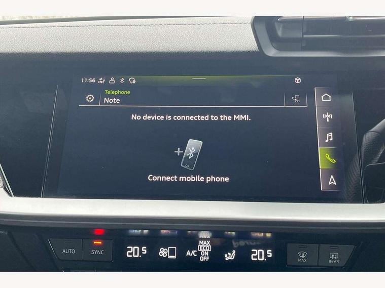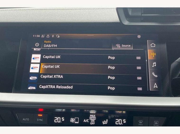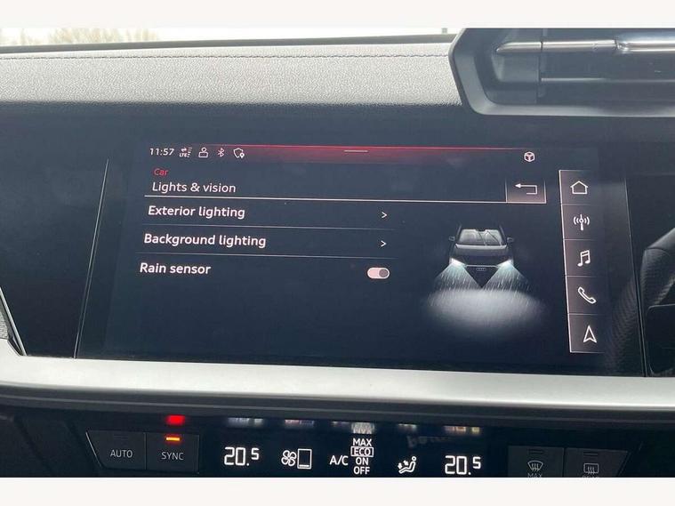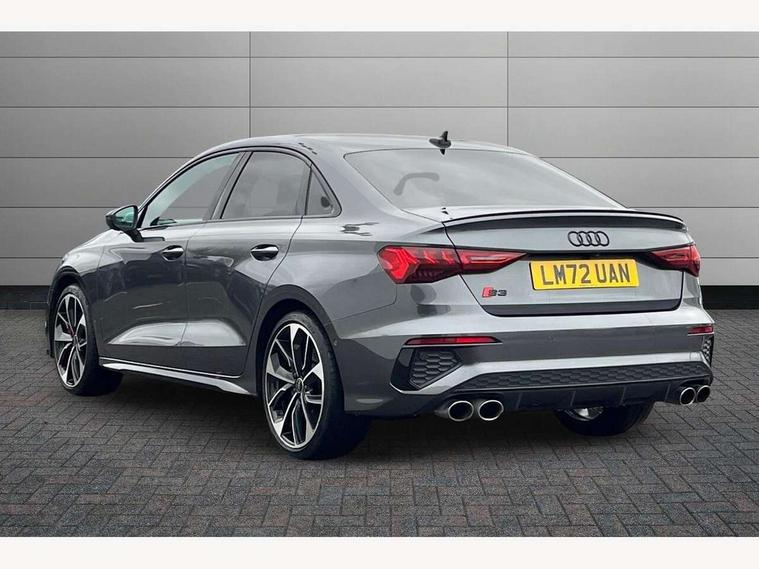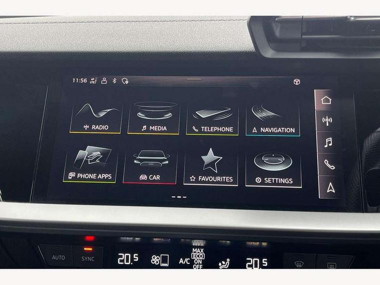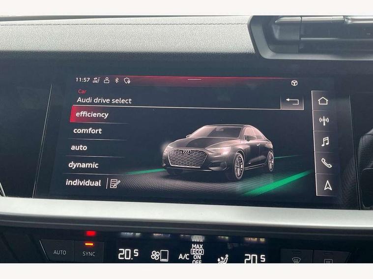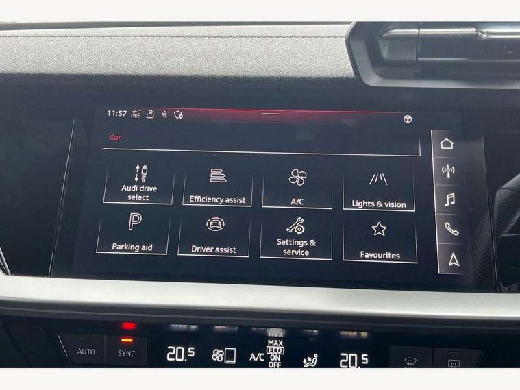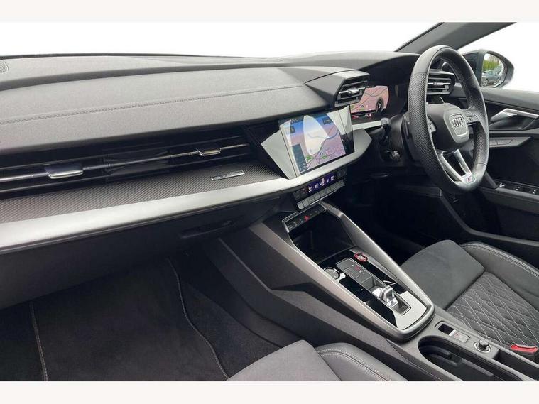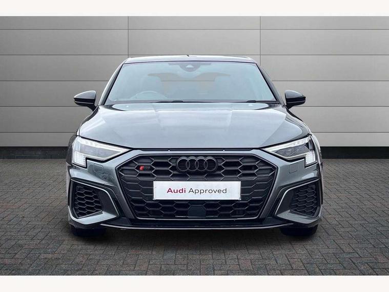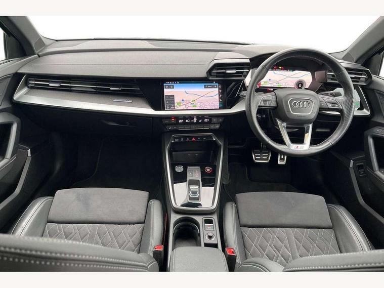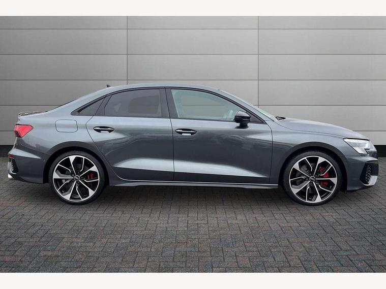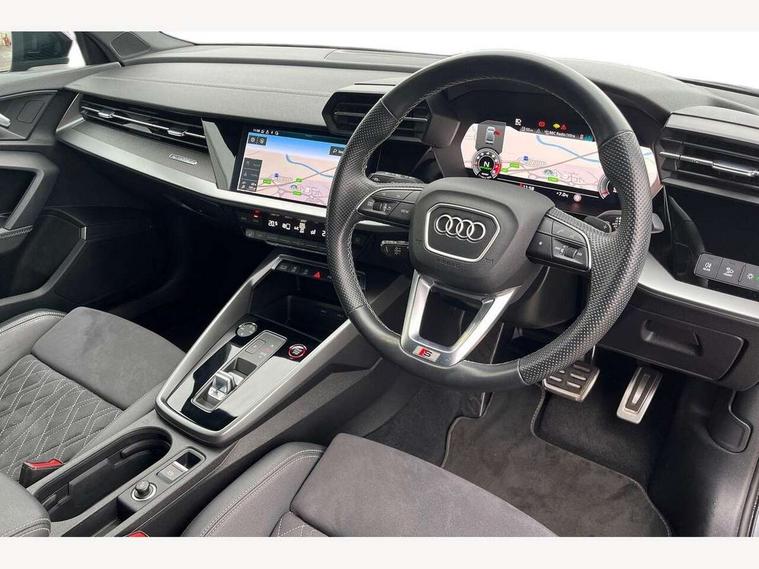 Audi connect emergency call and service, Audi drive select (Auto, Comfort, Dynamic, Efficiency and Individual), Audi smartphone interface, Audi virtual cockpit plus - 12.3" dynamic digital instrument cluster, Automatic start/stop system with recuperation, Bluetooth interface, Collision avoidance assistant, Head up Display, Lane departure warning system, MMI Navigation Plus with high resolution 10.1" colour touch screen display, Progressive steering, Reversing camera, Service indicator, Voice control system with natural language interaction, Quattro permanent all wheel drive, S sports suspension with damper control and lowering by 15mm, 2x USB Type C ports (for charging and data transfer), Bang and Olufsen premium sound system with 3D sound, CD player, DAB Digital radio, 3rd brake light, Acoustic glass windscreen, Audi Beam uses LEDs to project Vorsprung onto the ground as you exit your S3, Audi matrix LED headlights, LED rear lights, dynamic front and rear indicators and headlight cleaning system, Auto dimming frameless rear view mirror, Electric panoramic sunroof, Electrically adj heated/folding + automatically dimming exterior mirrors with memory + automatic kerb side function for passenger side exterior mirror, Front electric windows, Illuminated door sills with aluminium inserts at the front with S logo, Integrated LED indicators in door mirrors, LED daytime running lights, Light and rain sensors, Model and engine designation badges at rear, Privacy glass - dark tinted rear window, rear door and side windows, Rear boot, Rear electric windows, Rear side wing doors, 12V socket and storage compartment in front centre console, 3 seat bench in 2nd row, 3 spoke leather multifunction steering wheel with gear shift paddles, 4 way electrically adjustable lumbar support for driver and front passenger, 40/20/40 split folding rear seat bench with cupholder, Black cloth headlining, Dual zone electronic climate control, Electrically adjustable front seats with memory function for driver's side and exterior mirrors, Electronically operated child locks, Front and rear centre armrest in leather, Front and rear headrests, Front/rear floor mats, Heated front seats, Height and reach adjustable steering wheel, Illuminated vanity mirror, Interior lighting - glove compartment light and right hand side, Luggage compartment floor covering, Single front passenger seat, Stainless steel pedals and front footrest in black, Body styling design pack - S3, Driver Assistance pack - A3 Saloon, Extended ambient lighting pack - A3/S3 Saloon, LED interior lighting pack - A3 Saloon, Storage pack - A3/S3 Saloon, 3x3 point rear seat belts, Driver and front passenger airbag with passenger airbag deactivation, Electronic Stabilisation Control (ESC) including ABS, ASR and EDL, First aid kit with warning triangle and 2 safety vests, Front side airbags with head airbags and interaction airbag, Hill hold assist, Pre-sense front with pedestrian and cyclist detection, Seatbelt monitoring, Tyre pressure loss indicator, Advanced key and power operated tailgate - Luggage compartment lid opens electrically, Anti theft alarm, Anti-theft wheel bolts, Immobiliser, Remote control central locking, Aluminium air vent surrounds, Aluminium trim elements, Carbon inlays, accent surfaces in the dashboard and centre console in platinum grey silk effect paint finish,
