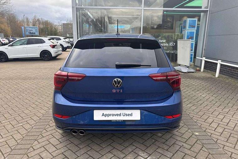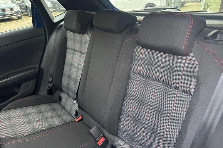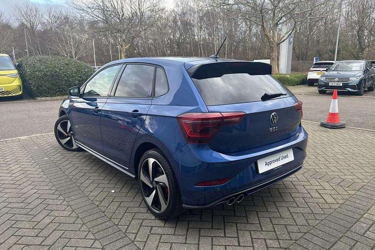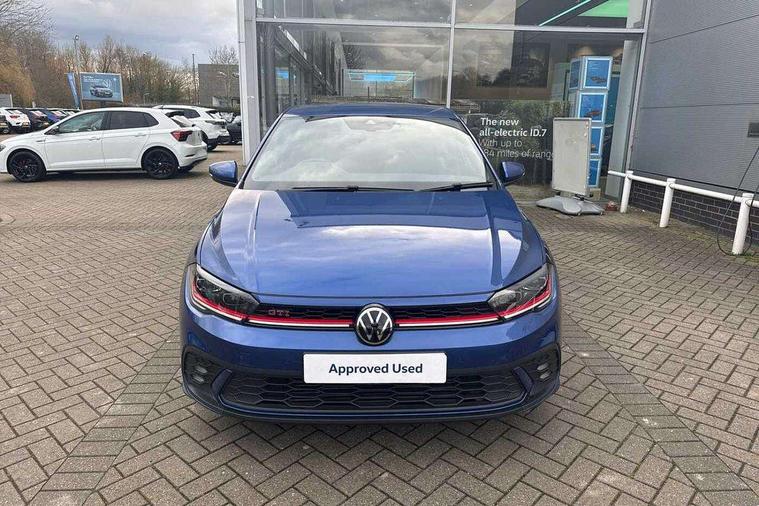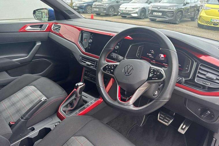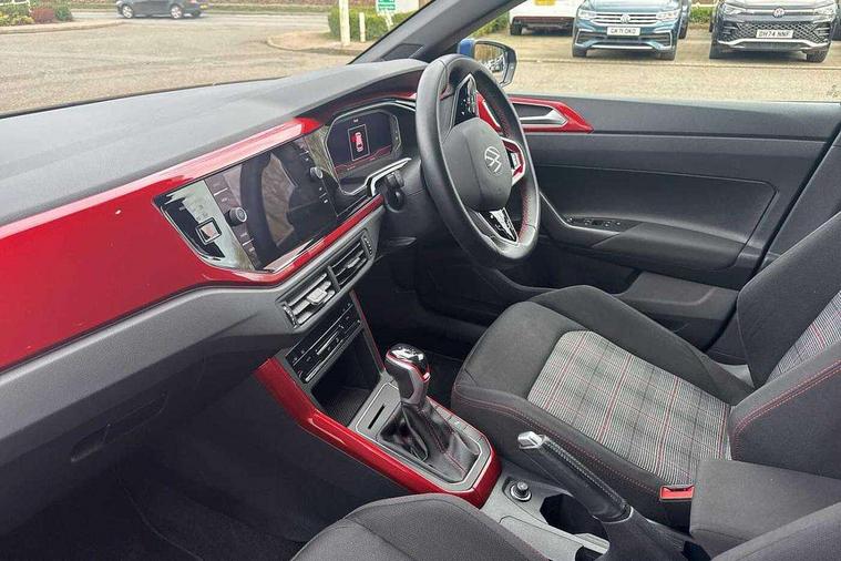 Adaptive cruise control with follow-to-stop and speed limiter, Bluetooth mobile phone interface, Digital Cockpit Pro with 10.25" Display, Driver alert system, Dynamic road sign display, Eco mode, Emergency call service, Power assisted speed sensitive steering, Preparation for We connect and We connect plus, Speedo and rev counter, electronic odometer, trip, service interval display and fuel gauge, Travel Assist - Lane keeping system and traffic jam assist, Travel assist including emergency assist, Trip computer, Warning signal and warning light for front and rear seatbelts not fastened, Washer fluid level indicator, Wireless app connect, Adaptive chassis control, Front wheel drive, Heavy duty rear axle, Rear shock absorpion sports version, Sports select suspension lowered by 15mm, Start-stop system with battery regeneration (recuperation - energy recovery during braking), DAB Digital radio, Diversity antenna for FM reception, Front and rear 6 speakers, Body colour bumpers, Body colour door handles, Electric front windows, Front scuff plates in aluminium with GTI logo, Heat insulating darkened glass in side and rear windows, Heat insulating glass windscreen, Power folding adjustable/heated exterior mirrors and front passenger exterior mirror lowering function, Rear electric windows, Rear fog light, Rear side wing doors, Rear windscreen washer and wiper with interval delay, Sport bumpers with air intakes with honeycomb structure, Third brake light, Twin chrome exhaust tailpipes, 12V power socket in centre console, 2 USB-C ports in the front, 2 USB-C charging sockets on the center console in the rear, 3 rear head restraints, 60/40 split folding rear seat and rear seat bench not split, Air care climatronic air conditoning system with active combination filter and 2-zone temperature control, Black roof lining, Chrome plated radiator grille inserts, air vent surrounds and light switch surrounds, Door and side trim panel, Driver and front passenger seat height adjustment, Driver/passenger sunvisors with illuminated vanity mirrors, Front + rear carpet mats in recycled material, Front centre armrest, Front footwell illumination, Front seat backrest storage pockets, GTI sports gearshift knob in aluminium leather, Handbrake lever handle in leather, Headliner in recycled material, Isofix child seat preparation easy-fit (for two outer rear seats, and front passenger seat) compatible with I-size, LED interior light with switch off delay and dimmer, 2 reading lights front and rear, Luggage compartment cover, Luggage compartment floor, Luggage compartment lighting, Single front passenger seat, Stainless steel pedals, Standard pedal cluster, Three spoke leather wrapped multifunction sports steering wheel with shifting paddles, IQ LED matrix headlights pack - Polo, Light and sight pack - Polo GTI, Sports suspension pack - Polo, 3 point height adj front seatbelts + pretensioners, 3x3 point rear seatbelts, ABS, Driver and front passenger airbag with front passenger airbag deactivation, Drivers and front passengers safety optimised head restraints, ESC (Electronic stability control) + EDL (Electronic Differntial lock) and ASR (Traction control), Extended and predictive pedestrian/ cyclist protection, Front and rear disc brakes with red brake calipers, Front curtain and side airbags with center airbag, Hill hold control, Manual child lock in rear doors, Two tone horn, Tyre pressure loss indicator, Alarm with interior protection, Anti-theft alarm system with interior monitoring, backup horn, and towing protection, Anti-theft wheel bolts, Electronic engine immobiliser, Chrome applications on rotary light, mirror adjustment, window regulator switches, outlet with frame in black, Low rolling resistance tyres,