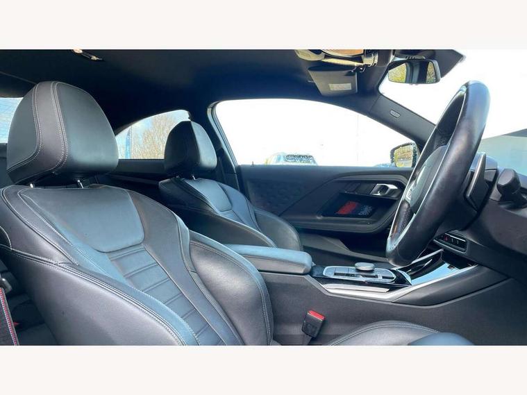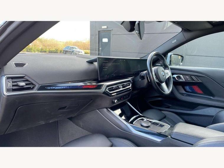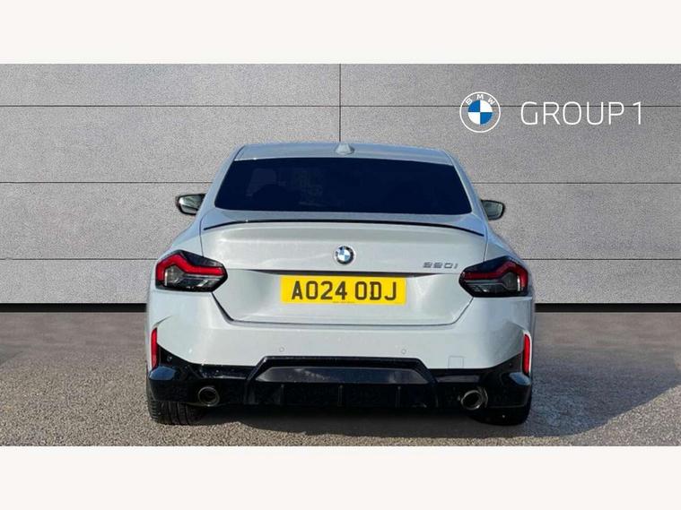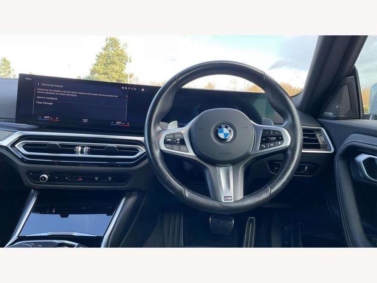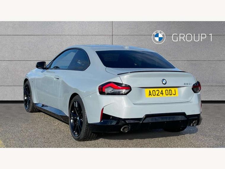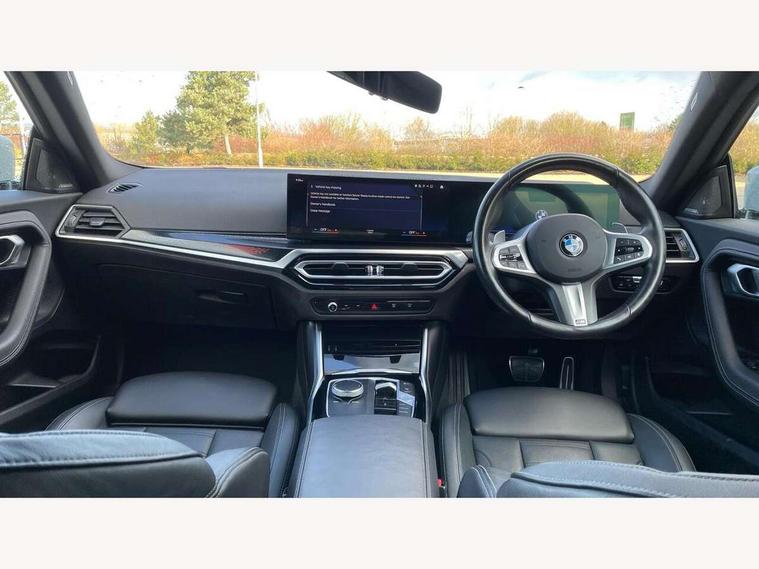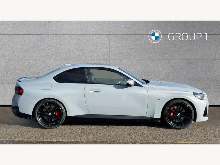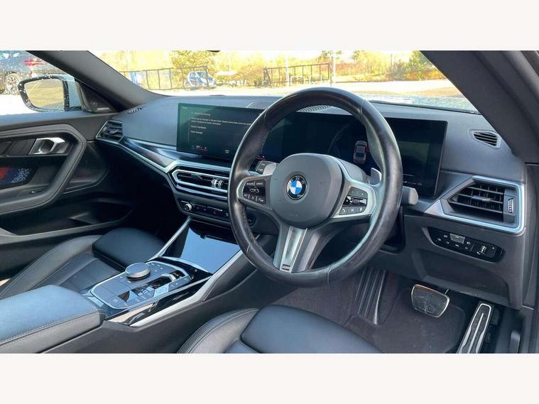 2 USB connections for charging and transferring data, 4G LTE connectivity with hard wired 4G network sim card, Attentiveness assist, Bluetooth with USB, BMW ConnectedDrive online services, BMW Intelligent Personal Assistant, BMW operating system 8 with variable, configurable widgets display information in real time, BMW Teleservices, Check Control warning system for monitoring of lights and door/luggage compartment open warning, Direct selection buttons, Drive off assistant, Eco pro mode, Electric power steering, Front and rear parking sensors, Front/rear Parking distance control, iDrive controller with turn and press function, Integrated owners handbook, Intelligent functions, Live cockpit plus with nav function 12.3" instrument cluster and 14.9" centre display, Oil sensor for level and grade, Optimum shift indicator, Personal Profile, Touch operation on control display, Variable sport steering, Widescreen multi-media display, WiFi interface for wireless connection of mobile terminal devices, Aluminium lightweight construction, Balancer shaft, BMW TwinPower Turbo four-cylinder petrol engine, Double VANOS, Drive performance control with ECO PRO comfort + sport mode, Electronic differential lock, High precision injection, M sport suspension, Petrol Particulate Filter, Sport automatic steptronic transmission with gearshift paddles, manual gearshift time display, launch control, coasting idle ECO PRO/COMFORT modes, Twin scroll turbocharger with Valvetronic, DAB tuner, Acoustic windscreen wipers for reduced driving noise, Adaptive LED Headlights, Automatic windscreen wipers and automatic headlight, Automatically dimming rear view mirror, Body colour door handles flush with door surface, Body colour door mirrors, Body colour front and rear bumpers, Daytime running lights, Electric windows - front and rear, with open/close fingertip control and trap release, Exhaust tailpipes x2 - 90mm in left and right, Fading support, Front and rear bumper system with replaceable deformation elements, Front door sill finishers in black plastic with BMW designation, Front windscreen wipers with integrated washer jets, Green tinted heat protection glazing, High beam assistant, High gloss black sill, bumper trim sides and diffuser insert, High gloss shadowline exterior trim in mirror triangle cover, mirror cover panel, mirror bezel and window border, High level third brake light, Indicators integrated int mirror housing, LED registration plate light, LED technology rear tail lights, brake lights and turn indicators, Lightweight engineering, Model designation on right side of tailgate, One piece kidney grille with hight gloss chrome surround, Rear boot, Rear fog lights, Reversing light in rear light cluster, Shark fin antenna, Single part LED rear lights with smoked glass components, Trailer stabilisation logic, Visible VIN plate, 12V power socket in front centre console with blanking plug, 2 cupholders in front centre console, 2 zone automatic air conditioning, Ambient lighting, Compartment in front of cupholder, Conditioned based service, Driver seat backrest width adjustment, Front and rear side armrests integrated into door trim, Front armrest, Front door pockets, Front head restraints, Front sport seats, Heated front seats, Illuminated glove compartment with separate small compartment, M headliner Anthracite, M sport leather steering wheel, Manually adjustment steering wheel column, Rear seat backrest with manual 40:20:40 split folding, Rear seat centre foldable armrest with integrated cup holder, Single front passenger seat, Storage compartment between rear seats, Storage tray and compartment with cover in centre console, Sun visors with vanity mirrors and insert tab, Through loading system with 40/20/40 split folding 2 rear seat in 2nd row, Two folding rear seat headrests, Velour floor mats, Additional storage compartment pack without USB - 2 Series Coupe, Connected pack professional - 2 Series Coupe, Interior and exterior mirror pack - 2 Series Coupe, M Sport exterior styling aerodynamics pack - 2 Series Coupe, 2 tone horn, Anti lock braking system (ABS) with cornering brake control, Automatic Stability Control (ASC), BMW emergency call, Brake drying, Child seat ISOFIX attachment for the two outer rear seats, Crash sensor activating of airbags, Unlocking doors, hazard warning lights, interior light, safety battery terminal, Deactivation of fuel pump in the event of a crash, Driver and front passenger airbags, Driver and front passenger side airbags, integrated in the door side seat backrest bolsters for all seat variants, Dynamic brake control, Dynamic stability control + (DSC+), Dynamic Traction Control - DTC, Electrically operated hand brake including automatic hold function and automatic release when driving off, Front and rear disc brakes, Head airbags for all 4 outer seats, Manual deactivation of front passenger airbag, Seat belt security check for driver and front passenger, Seatbelt warning, Side impact protection, Three point seat belts on 4 seats including front belt stopper, pyrotechnic belt tensioners and belt force limiters, Tyre pressure sensor, Warning triangle and first aid kit, Alarm system (Thatcham 1) with remote control and electronic engine immobiliser, Central locking switch for all doors, fuel filler cap and luggage compartment, Deadlocking function system to all doors, Drive away locking system on all doors and luggage compartment, Locking wheel bolts, Start/Stop button (illuminated) in centre console with keyless engine start and Auto Start-Stop deactivation button, Two remote control key with integrated key - one button for open and close doors/fuel flap/tailgate and separate button for unlock luggage compartment, BMW mobility tyre sealing system, Electrically powered 12V compressor, Reduced rolling resistance tyres,