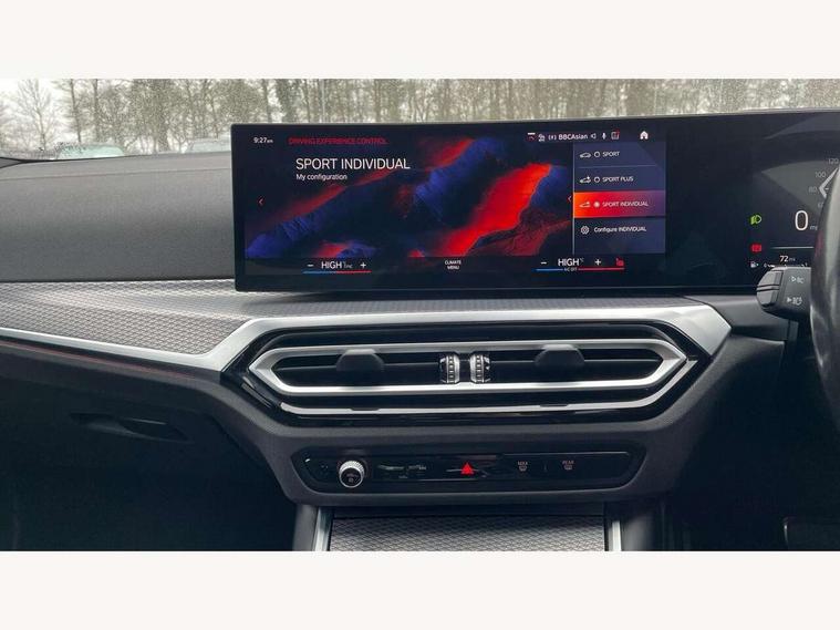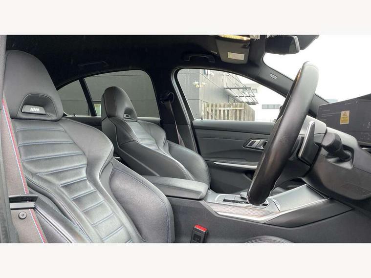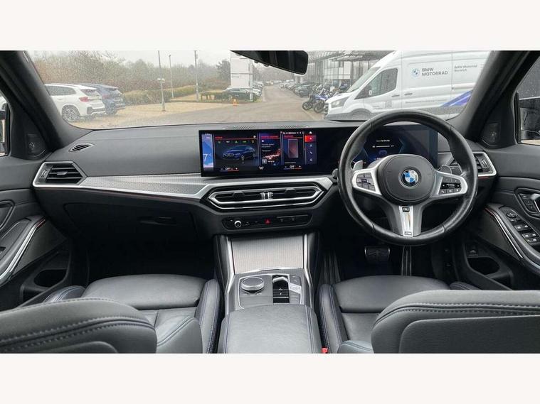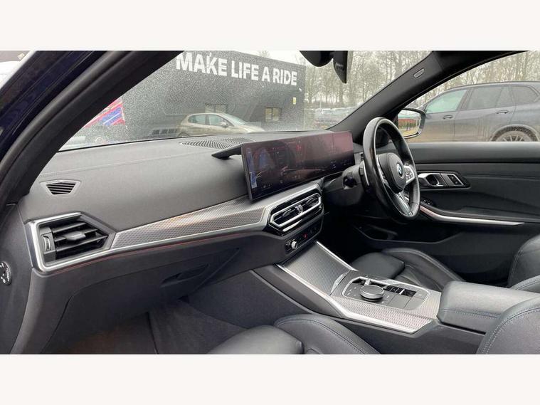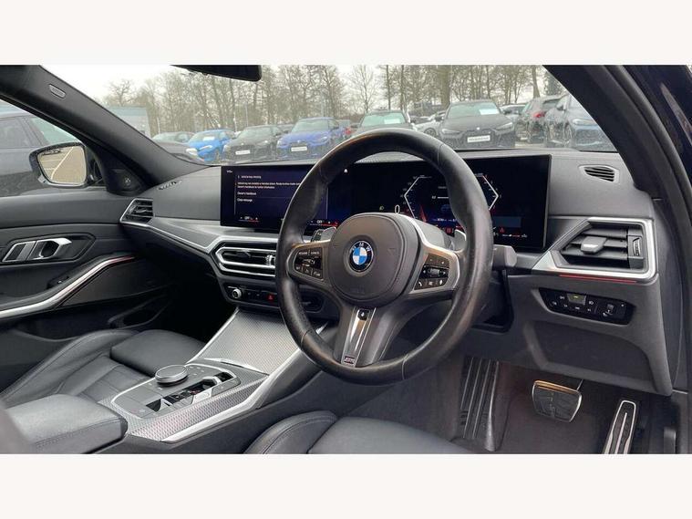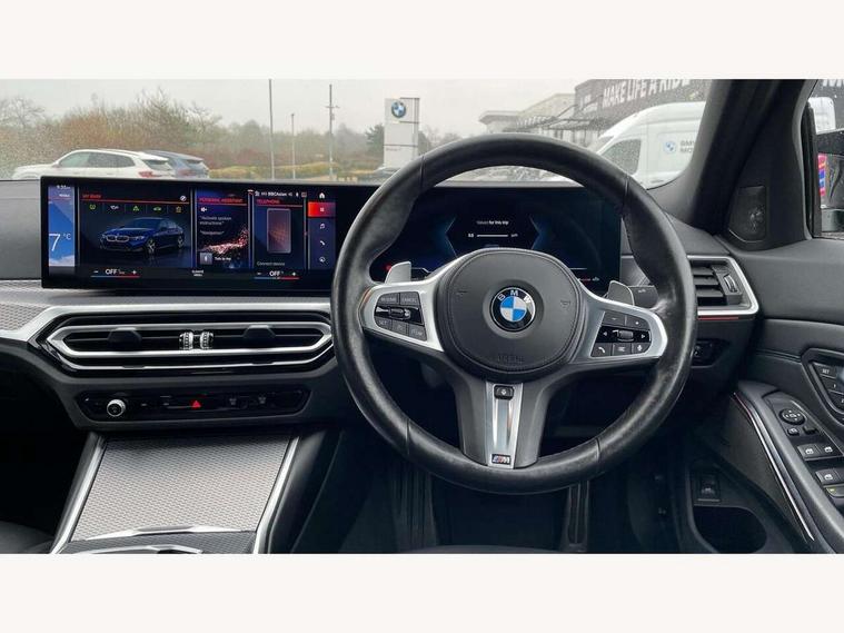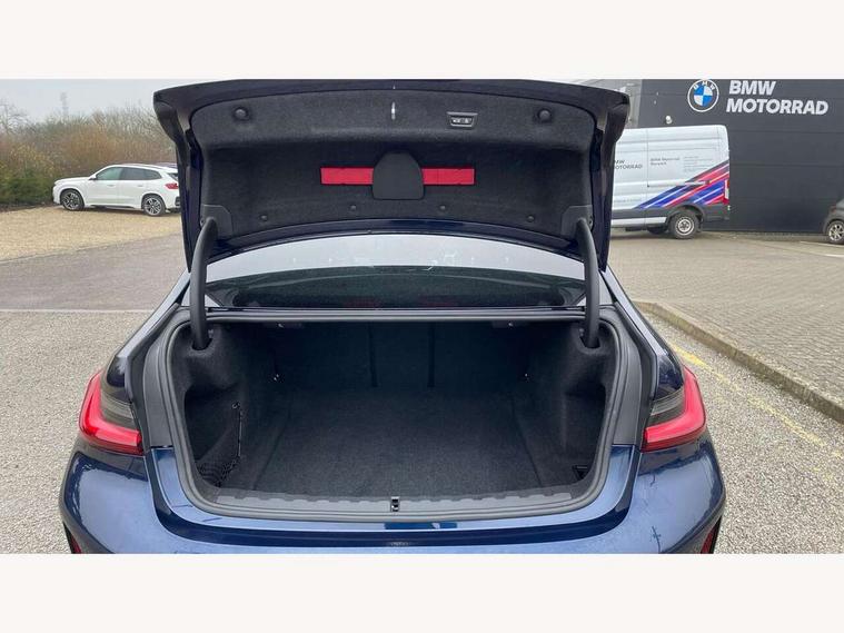 Active guard plus, Attentiveness assist, Automatic Start/stop button, BMW iDrive, BMW Teleservices, Condition based service, ConnectedDrive Services, Driving experience switch, Oil sensor for level and grade, Preparation for driver assistance, Shifting point display, Smartphone integration, Variable sport steering, 48V Mild hybrid technology, Double joint spring strut front axle, Electronic differential lock control (EDLC), Fuel tank breather system, Larger capacity fuel tank, M Sport differential, Sport automatic transmission with steering-wheel mounted gearshift paddles and launch control, DAB tuner, 3rd brake light, Acoustic glazing, Adaptive LED Headlights, Auto dimming rear view mirror, Automated High beam assist, Automatic headlight beam throw control with load dependent regulating reaction, dynamic compensation of braking dive and acceleration squat, BMW emblem, engine compartment lid and tailgate, BMW individual lights shadow line, BMW M Individual high gloss shadow line with extended contents, Body colour roof fin, Door sill strips, Electric windows - front and rear, with open/close fingertip control, anti-trap facility and comfort closing, Follow me home headlight function, Front and rear bumper system with replaceable deformation elements, Front apron plastic in body colour, Fuel filler flap - right rear in body colour, Heated washer jets, High gloss shadow line exterior trim, Illuminated bow type door handles in body colour drivers side with door lock, Interior rear view electrochromatic mirror with automatic anti dazzle function, LED daytime running lights, LED rear lights, LED turn indicator, Licence plate panel integrated into front bumper and tailgate, M Sport spoiler, Matt black B-pillar finsher, Matt black window recess cover, Model designation on right side of tailgate, One piece front bumper cover including towing eye cover in body colour, Rain sensor with automatic headlight activation, Rear boot, Rear side wing doors, Reversing lights, Side frame decorative moulding black matt, Sun protection glass, Visible exhaust tailpipe finisher, Welcome lights in interior and door handle area, 12V power socket in front storage compartment, 2 front cupholder in centre console with clamping elements and matt black inlay, 3 seat bench in 2nd row, 3 zone automatic air conditioning, 40:20:40 split folding rear seat with loading system, Anthracite headlining, Armrest integrated in front and rear door trim + front centre console armrest, BMW ID, Driver backrest width adjustment, Folding rear centre armrest with 2 cupholders, Front and rear door exit lighting (left / right), Front and rear footwell lighting, Front and rear headrests, Front and rear reading lights, Front and rear velour floor mats, Heated front seats, Height adjustable mechanically and infinitely variable steering column, Illuminated armrest storage compartment, Illuminated glove compartment, Illuminated luggage compartment, Lashing eyelets in luggage compartment, LED ambient lighting with welcome carpet light, M Sport multifunction leather steering wheel, Make-up mirror lights, Single front passenger seat, Standard seat for driver and passenger with manual adjustment, Sunvisors with vanity mirrors and ticket pocket, Toolkit located in luggage compartment, Connected pack professional - 3 Series Saloon/Touring, Interior and exterior mirror pack - 3 Series Touring/Saloon, M Aerodynamics package - 3 Series Saloon/Touring, M sport exterior styling pack - 3 Series Saloon/Touring, Storage compartment pack - 3 Series Saloon/Touring, 3x3 point rear seatbelts, BMW emergency call, Child locks on rear doors, Crash sensor activating of airbags, Unlocking doors, hazard warning lights, interior light, safety battery terminal, Driver and front passenger with seat occupancy detection for driver's and passenger side, Driver and passenger side airbags, body protection at side and airbags deploy from seat backrests, Dynamic brake control, Dynamic stability control + (DSC+) - Anti-lock Braking System (ABS) with brake assist and cornering brake control + Automatic Stability Control (ASC), Dynamic Traction Control - DTC, Electric parking brake including automatic hold function and automatic release of the parking brake when driving off, Head airbags in 1st and 2nd row, head protection at side, curtain airbags open from headliner above 1st and 2nd row, M sport seatbelt, Plastic fuel tank, Side impact protection, Tyre pressure monitoring with three level warning strategy, Ventilated front and rear disc brakes, Warning triangle and first aid kit, Alarm system, Centre lock switch, Closing system with central locking, Electronic vehicle immobiliser, Sensatec instrument panel,