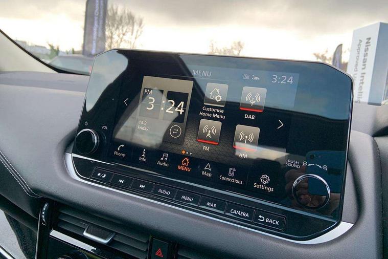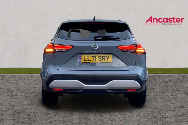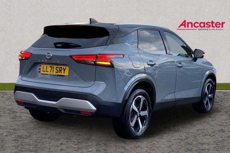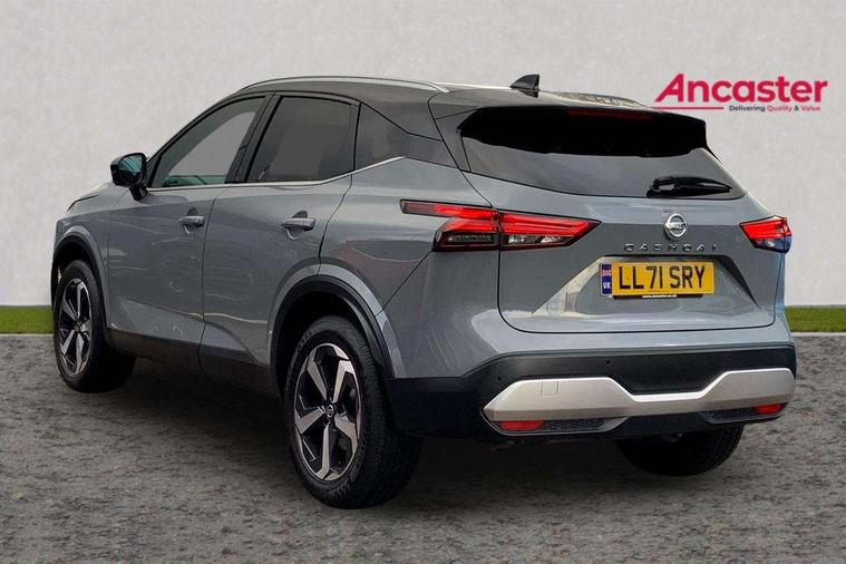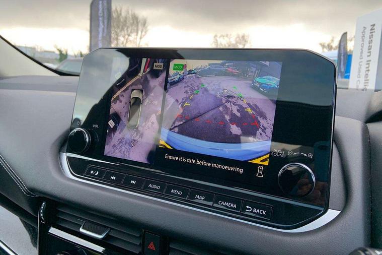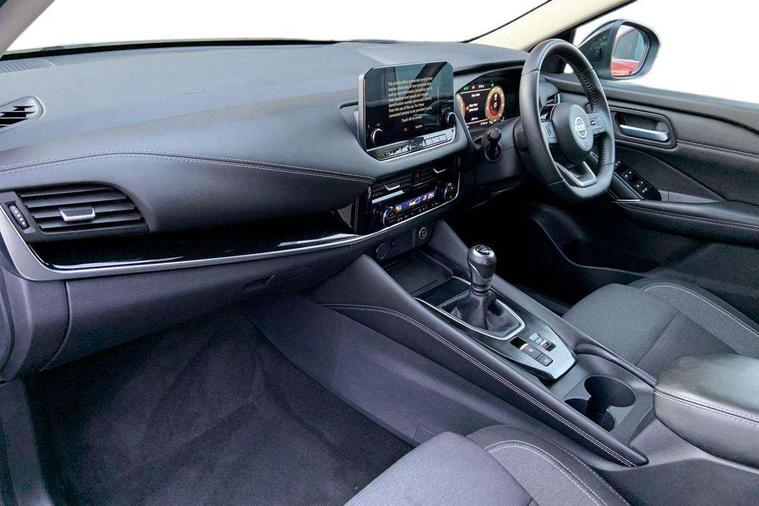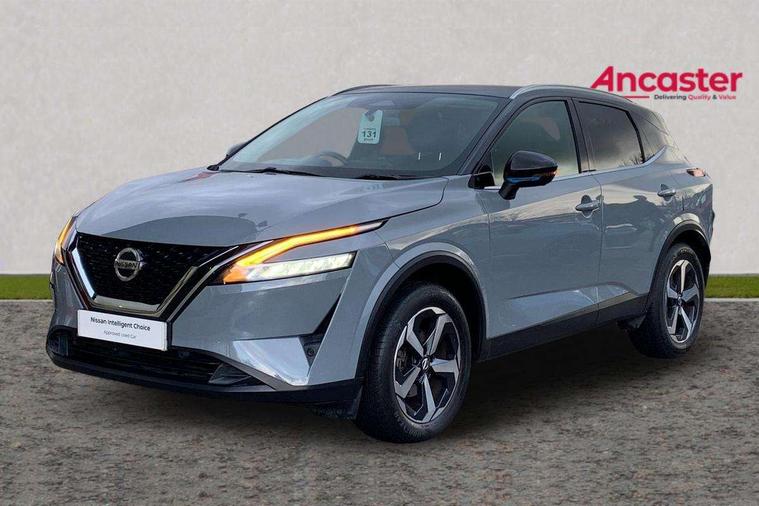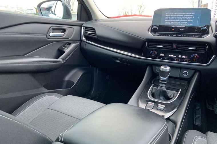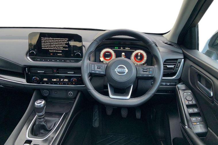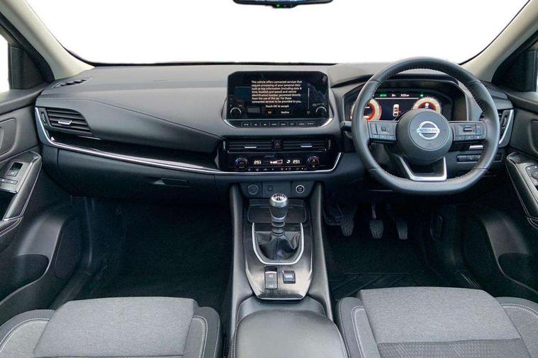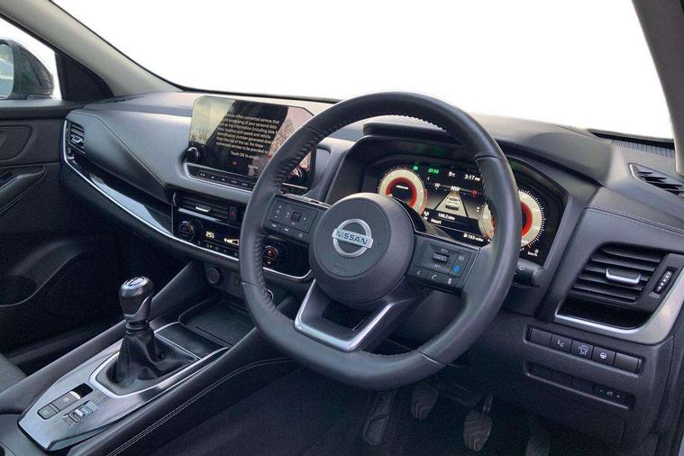Blind spot warning, Drive modes (sport, normal, eco), Electric speed sensitive power steering, Emergency and breakdown call, Front and rear parking sensors, Full Digital 12.3" TFT Digital Combimeter, Idle stop/start system, Intelligent Cruise control (ICC), Intelligent driver alert system, Intelligent forward collision warning, Intelligent lane intervention, Lane departure prevention, Lane departure warning system, Moving object detection, Push button starter, Rear cross traffic alert, Traffic sign recognition with legal speed adjustment, Trip computer, 6 speakers, AM/FM audio system with DAB, Bluetooth audio streaming, Front USB connections (Type-A and Type-C), Rear USB charging only ports (Type-A and Type-C), 3rd brake light, Auto dimming rear view mirror, Auto rear wiper when reversing, Body colour mirror caps, Body coloured door handles, Bodyside mouldings, Chrome side window finisher, Electric auto folding door mirrors, Electrically adjustable and heated door mirrors with LED turn indicator, Fixed panoramic glass roof with electric sunshade, Follow me home headlights, High beam assist, Intelligent auto headlights, LED daytime running lights, LED rear lights, One touch front and rear electric windows with remote opening and closing, Partially body coloured bumpers, Privacy glass, Rain sensor, Rear roof spoiler, Rear side wing doors, Rear styling plate, Roof rails, Shark fin antenna, Splash free rain sensing wipers, Super UV and infrared cut glass, Three blink turn signal, 12v power socket in dashboard and luggage, 2 way electrical driver lumbar adjustment, 2x Rear coat hooks, 3 bench rear seats in 2nd row, 3 rear headrests, 4 grab handles, 6 Luggage hooks - 4 on floor, 2 on side, 60/40 split folding rear seat bench, Ambient lighting around centre console, Centre console storage tray, Chrome interior door handles, Cloth monoform upholstery, Driver and front passenger sunvisors with illuminated vanity mirrors, Driver seat back pocket, Dual zone automatic climate control with pollen filter, Front centre console and armrest, Front cupholder, Front door with bottle holders, Glovebox with light, Hard trunk cover, Height adjustable driver's seat, Height adjustable front headrests, Leather shift knob, Leather steering wheel, Luggage board system, Luggage space lighting, Manually adjustable passenger (slide recline + lifter), Multifunction steering wheel, Passenger seat back pocket, Rear armrest with 2 cupholders, Rear door bottle holders, Single front passenger seat, Soft PVC kneepad, Steering wheel switches, Tilt/telescopic adjustable steering wheel, Two rear isofix child seat anchorage points with top tether, Welcome light and console tray ambient lighting, Connectivity Pack - Qashqai, Tech Pack (Drive Assist + HUD), 3x3 point rear seatbelt pretensioners + load limiters, ABS, ESP, EBD and brake assist, Active brake limited slip, Auto hold function, Child locks on rear doors, Curtain and front side, far side airbags, Driver and passenger airbags, Driver, passenger and 2nd row rear seat belt reminder, Electronic parking brake, Front seatbelt pretensioners + load limiters, Height adjustable front seatbelts, Hill start assist, Intelligent blind spot intervention, Intelligent front emergency braking with pedestrian, cyclist recognition and junction assist, Intelligent rear automatic braking, Tyre pressure monitoring system, Vehicle dynamic control, Capless fuel filler, Engine immobiliser, Nissan i-key, Remote central door locking with deadlocking, Thatcham Cat.1 alarm, 18" Diamond cut alloy wheels,