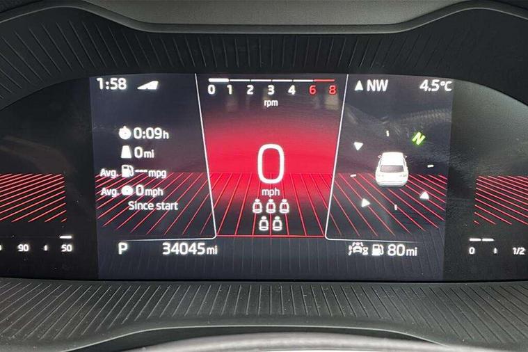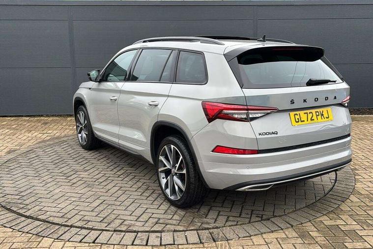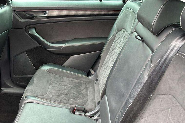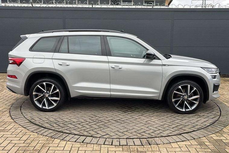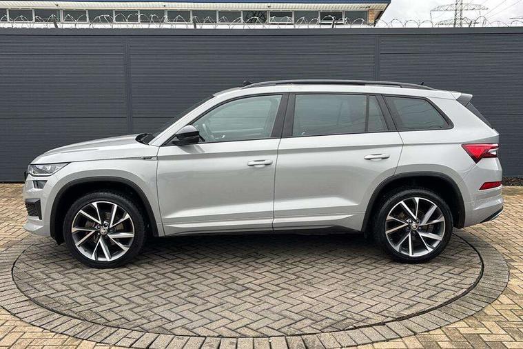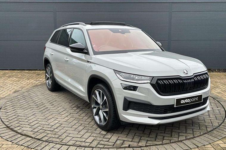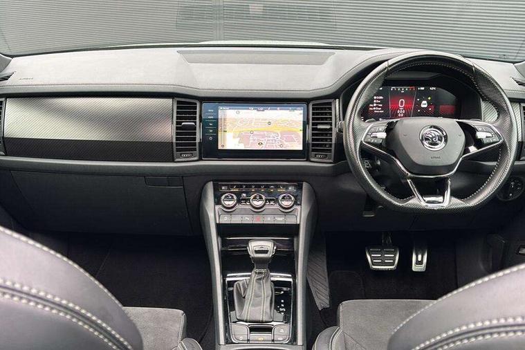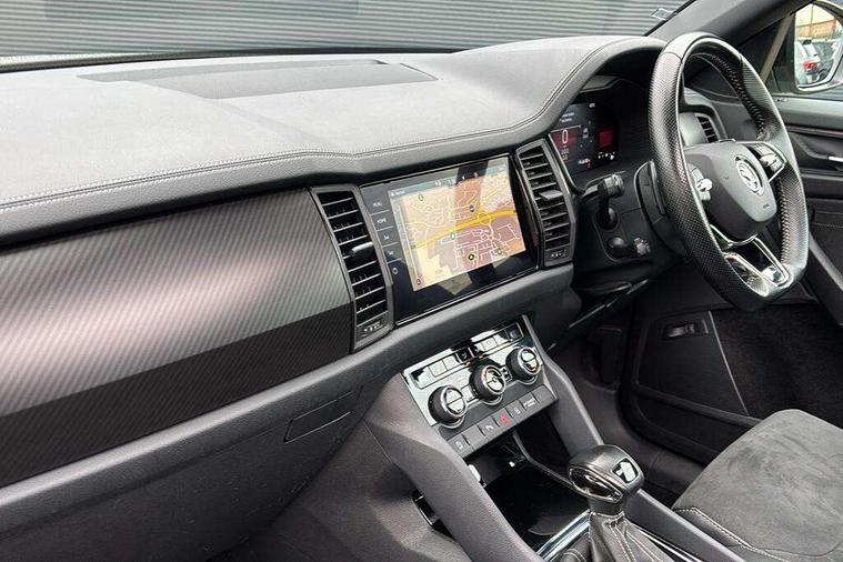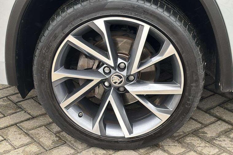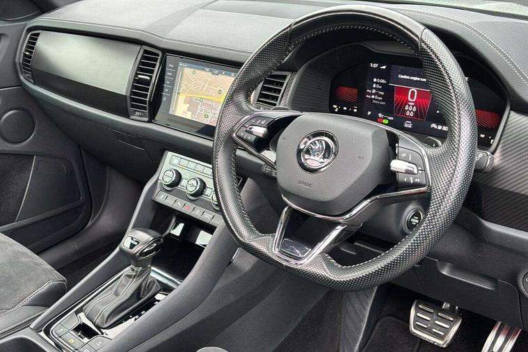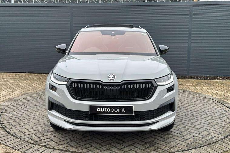 Bluetooth system, Columbus satellite navigation with 9.2" touchscreen, integrated Wi-Fi, web radio, Digital voice enhancement, e call+, ECO Stop/start function, Exterior temperature indicator, Progressive steering, Rear view camera, Smartlink wireless for apple carplay and wired for android auto, Speed limiter, Tailgate unlocking from outside, USB C Port x 2 in front centre console, Wireless charging, 8 Speakers, DAB Digital radio, Aero front windscreen wipers with intermittent function, Aero rear window wiper, Auto dimming rear view mirror, Black roof rails, Black sports styling including front grille and window surrounds, Black wheel arch surrounds, Body colour bumpers, Body colour door handles, Electric adjustable/heated/folding door mirrors, driver side auto dimming with boarding sports and memory function, Electric front and rear windows, Extended rear spoiler with finlets in gloss black, Front fog lights, Full LED matrix headlights with AFS (adaptive front light system), cornering function and AWL (all weather lighting system), Gloss black door mirrors, Headlight washers, Heated rear window, Invisible tailpipe, LED daytime running lights, LED rear fog light, LED third brake light in rear spoiler, Light assistant (coming/leaving home/tunnel light), Off-road style lower front bumper element, Privacy glass, Rain and light sensors, Rear diffuser, Rear LED lights (high functionality) with welcome effect and dynamic indicators, Rear side wing doors, Safety reflectors on front and rear doors, Sportline badge on front fender, Sports front and rear bumpers including lower rear chrome strip, Tailgate lettering in Black, Window control switches with black trim, 12V socket in boot, 2 rails with 2 hooks, 2 seat bench in 3rd row, 3 seat bench in 2nd row, 4 foldable roof handles with rear coat hooks, 60:40 foldable rear seat with sliding adjustment and backrest angle adjustment, Aluminium pedals, Black roof headlining, Bottle holders in door panel in the 1.5 litre front and 1 litre rear, Cargo storage compartments, Chrome headlight control button, Chrome interior door handles, Coat hooks on B pillar, Covered storage compartment on driver side, Decorative door sill covers, Front centre armrest with storage compartment, cup holder and 12V socket, Front courtesy lights, Gear shift lever with chrome frame and black gloss insert, Grey stitching in front and rear armrests and door armrests + door inserts, Height adjustable front headrests, Illuminated and cooled glovebox, Illuminated luggage compartment, Isofix child seat fittings in outer rear seats with top tether, Manually adjustable steering column, Microsuede door panels, Net programme in boot (1x horizontal Net, 2x vertical Nets), Overhead glasses storage compartment, Pollen filter, Rear centre armrest with cupholders, Single front passenger seat, Sliding trunk cover, Small Bags on the inner sides of the front backrests, Sports seats, Sunvisors with illuminated vanity mirrors, Three rear height adjustable headrests, Ticket holder on A Pillar, Umbrella in door panel, Variable boot floor, LED Interior light pack - Kodiaq, Auto door release and activation of warning lights in the event of an accident, Child locks on rear doors, Driver and front passenger airbag with knee airbag and front passenger airbag deactivation, Electronic parking brake with hill start assist, Emergency rear braking signal, ESC (incl. ABS+MSR+ASR+EDS+HBA+DSR+RBS+MKB), Front assist with autonomous emergency braking, Front side airbags with curtain airbags, Fuel cut off safety device, Height adjustable front 3 point seatbelts + pretensioners, Hill hold control, Rear disc brakes, Safety vest holder in door, Seat belt reminder for all seats, Three point rear seat belts, Two tone horn, Tyre pressure monitor, Alarm with interior monitoring and tilt sensor with safe function, Anti-theft wheel bolts, Immobiliser, Keyless entry and start system (KESSY), Remote central locking with 2 keys, Black air vent surround, Carbon finish dashboard and door inserts, Grey stitching in dashboard, 20" Vega Anthracite alloy wheels, Temporary spare wheel (space saver),