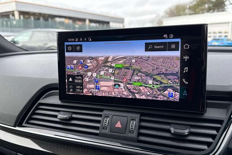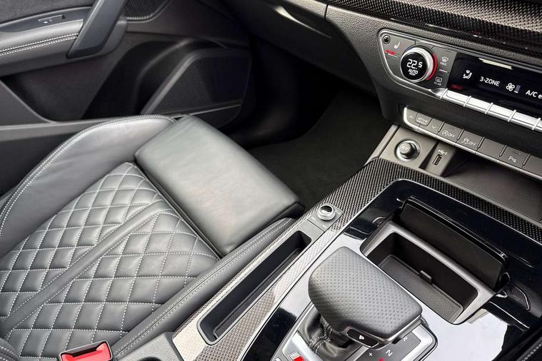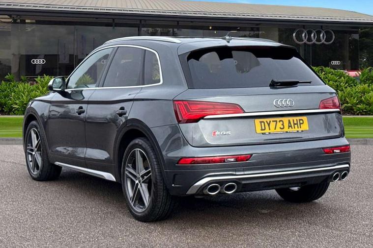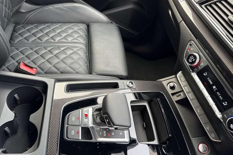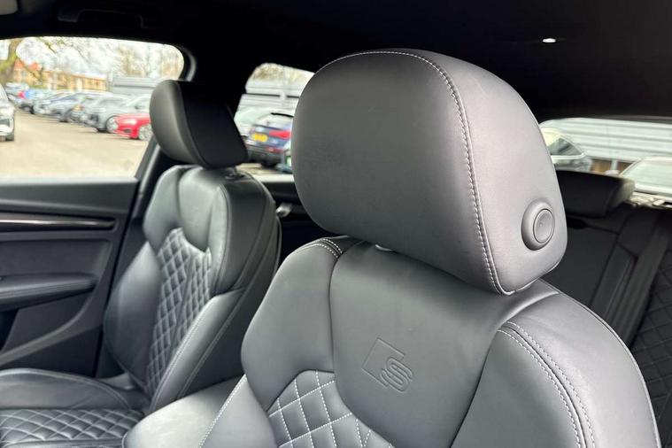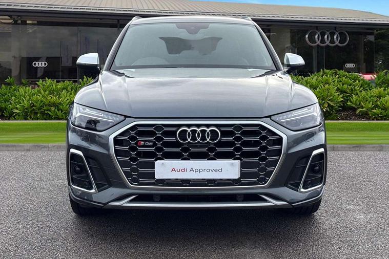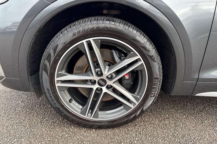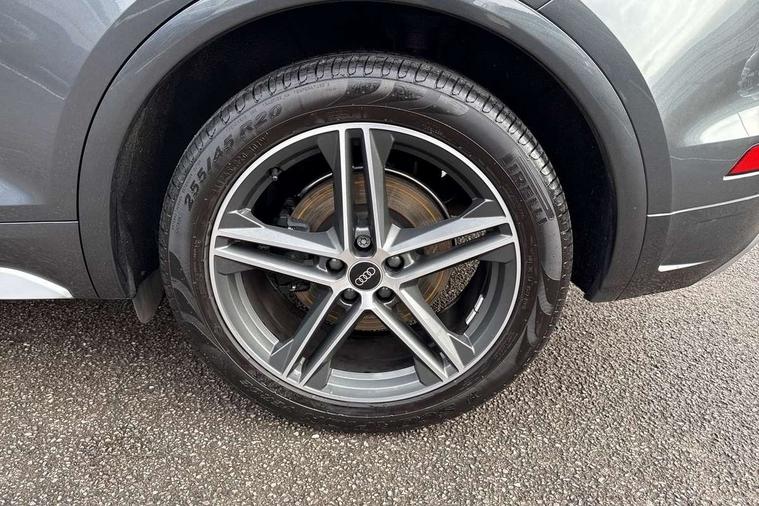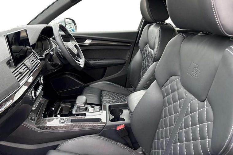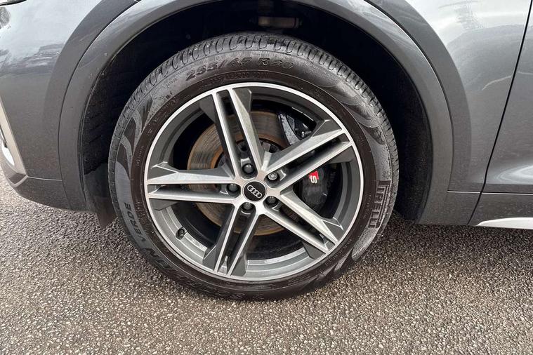 Acoustic front and rear parking sensor, Audi connect safety and service (e-call), Audi connect with Amazon Alexa Integration, Audi drive select, Audi virtual cockpit plus with 12.3" screen and three different layout designs, Audi wireless smartphone interface, Automatic start-stop system with coasting functionality and efficiency programme, Bluetooth interface, Electro - mechanical power assisted steering, MMI navigation plus with 10.1" touch screen, Power tailgate, Reversing camera, Service interval indicator, Voice control system with Audi hotword activation "Hey Audi", 70 litre fuel tank and 24 litre AdBlue tank, Diesel particulate filter, Quattro on demand, S sport suspension with damper control, Audi sound system, DAB Digital radio, Acoustic windscreen, Aluminium roof rails, Audi beam, Audi beam with Audi rings logo, Audi matrix LED headlights with dynamic front and rear indicators, Auto dimming door mirrors, Auto dimming frameless rear view mirror, Automatic headlight adjustment, Automatic headlights and windscreen wipers, Body colour bumpers, Body colour rear diffuser with matt aluminium silver surrounds, Body colour underbody protection, Chrome plated exhaust trims, Daytime running lights, Door sills in Selenite silver, Electric adjustable/heated/folding door mirrors, Front air inlet surrounds in aluminium, Front and rear electric windows, Front radiator grille in honeycomb design, Headlight washers, High gloss black B pillar trims and triangular rear door trim, High level LED brake light, Rear chrome trim strip below lights, Rear privacy glass and rear side windows, Rear side wing doors, Rear wiper, Roof bars, S front and rear bumpers, S Line rear spoiler, S Line side skirts, S specific rear diffuser, 2 x USB charging port with aux input socket, 3 rear headrests, 4 way electric lumbar support for driver and front passenger, 40:20:40 split folding 3 rear bench seat in 2nd row with rear centre armrest, Black cloth headlining, Comfort front centre armrest, Contrast stitching on seats, steering wheel and gear lever gaiter, Deluxe 3 zone electronic climate control, Fine Nappa leather upholstery with diamond pattern contrast stitching + front sport seats with S embossed logo, Front/rear floor mats, Fully electrically adjustable seats, Gear lever in black leather, Heated front seats, Height adjustable front head restraints, Height/reach adjustable steering column, Illuminated door sill trims with S logo, Luggage compartment cover, Massage function for front seats, Rear seat bench plus-adjust for forwards/backwards position/backrest angle, cupholders in the armrest, load through hatch and remote backrest release, Removable luggage compartment floor, Single front passenger seat, Stainless steel pedals, Sunvisors with vanity mirrors, Extended interior upholstery pack - Q5, High gloss pack - Q5, LED interior light pack - Q5, 3 point seatbelts on all seats, 6 airbags - Driver, front passenger, curtain and side airbags, Electrically operated child locks on rear doors, Electromechanical parking brake, Electronic stabilisation control including ABS, ASR and EDL, First aid kit with warning triangle and vests, Front passenger airbag deactivation, Hill descent control, Hill hold assist, ISOFIX child seat mounting for front passenger seat and ISOFIX child seat mounting with Top Tether for outer rear seats, Multi collision brake assist, Pop-up bonnet for pedestrian protection, Pre sense city, Seat belt force limiter, Seatbelt monitoring, Tyre pressure warning, Anti theft alarm, Anti-theft wheel bolts, Keyless Go access/ignition system, Remote central locking, Air vents inserts and centre console in gloss black, 20'' 5 twin star spoke design alloy wheels in gloss graphite grey,