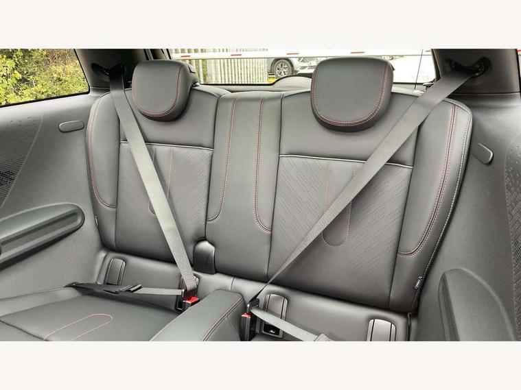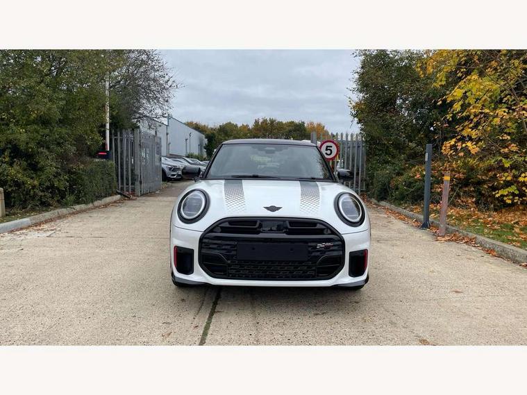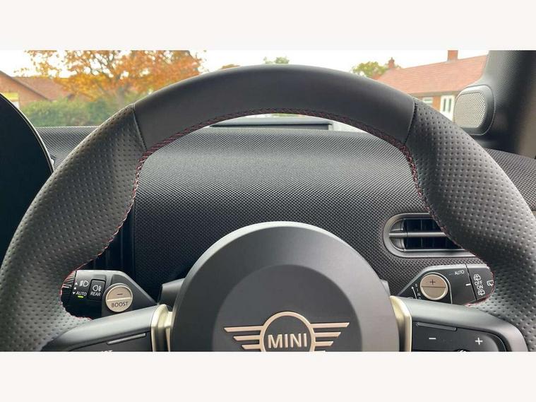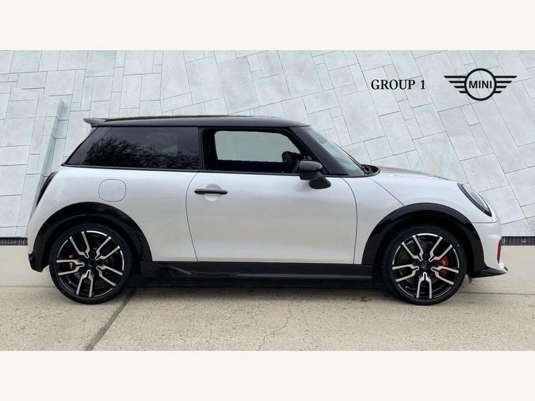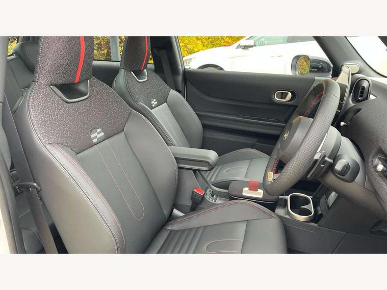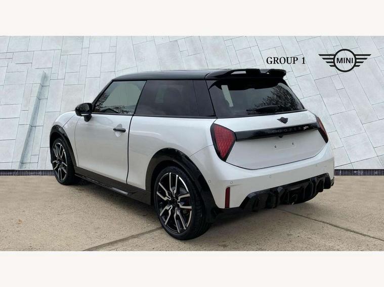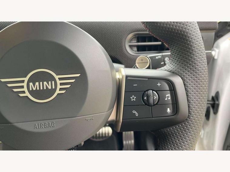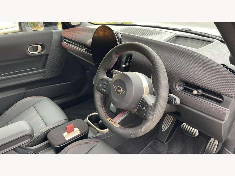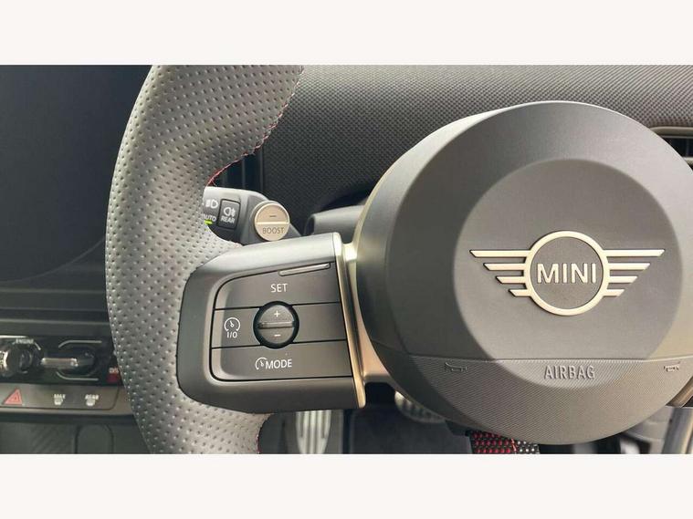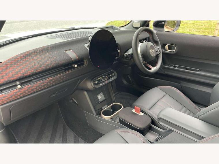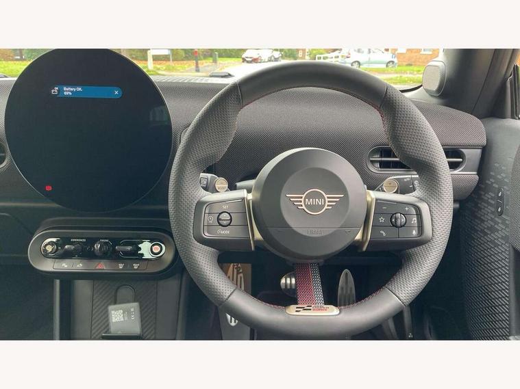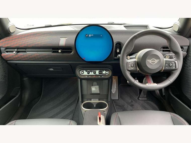 Central toggle bar, Circular OLED Screen, Compatible mobile phone bluetooth with audio streaming, Cruise control, Digital instrument cluster, Electro-mechanical speed dependant steering assistance, Emergency call service, Gaming controller with intelligent personal assistant voice update, JCW bespoke experience mode, Mini navigation system, On board computer, Service interval indicator, Tailgate, 7 speed sport transmission with double clutch, Adaptive suspension, JCW exhaust system, DAB Digital radio, Harman Kardon sound system, Personal eSim, Rear USB charger, Auto headlights, Electric adjustable heated door mirrors, Electric front windows, Front and rear apron, Heated rear window, Heated windscreen washer jets, High gloss black wheel arches, High gloss hexagonal patterned grille surround, JCW body kit, LED 3rd brake light, LED daytime running lights, LED indicator lights, LED rear lights, Rain sensor window wipers, Rear fog lights, Rear roof spoiler with airblades, Rear window wiper, 2 seat bench in second row, 2 zone automatic air conditioning, 60/40 rear seat bench, Ambient lighting, Black lower band in high gloss, Cupholders, Dark headliner, Floor mats, Front and rear head restraints, Front compact armrest, Heated steering wheel, Height adjustable passenger seat, Lidded storage box in Black/Red knit, Luggage compartment lighting, Partially perforated vescin steering wheel with red accent, black/red decorative strap, Single front passenger seat, Stainless steel pedals, Steering wheel paddle shift, Sunvisors with vanity mirrors, Driving assistant pack - Cooper Hatchback, Level 1 pack - Mini Hatchback, Park assistant pack - Cooper Hatchback, 3 point seatbelts on all four seats, 6 Airbags - front, side, head and seat belt tensioners, Anti-lock braking system (ABS), DSC - Dynamic Stability Control, Electronic parking brake, Front and rear disc brakes, Front ISOFIX (iSize), Front passenger airbag deactivation, JCW Sport Brakes, Red brake callipers with JCW badge, Traction control, Tyre pressure monitoring system, Alarm, Immobiliser, Remote central locking, Black/Red decorative dash strap, Tyre repair kit,