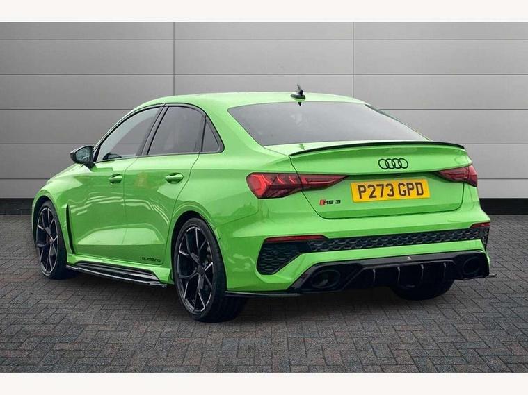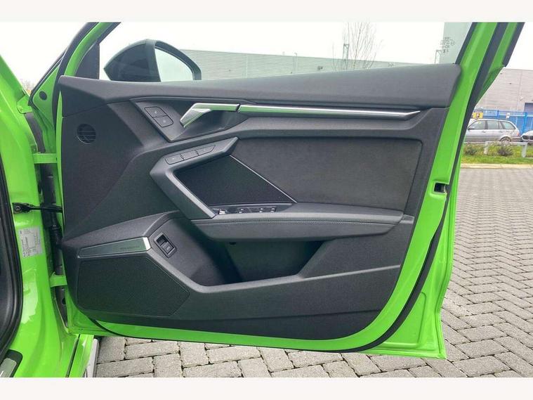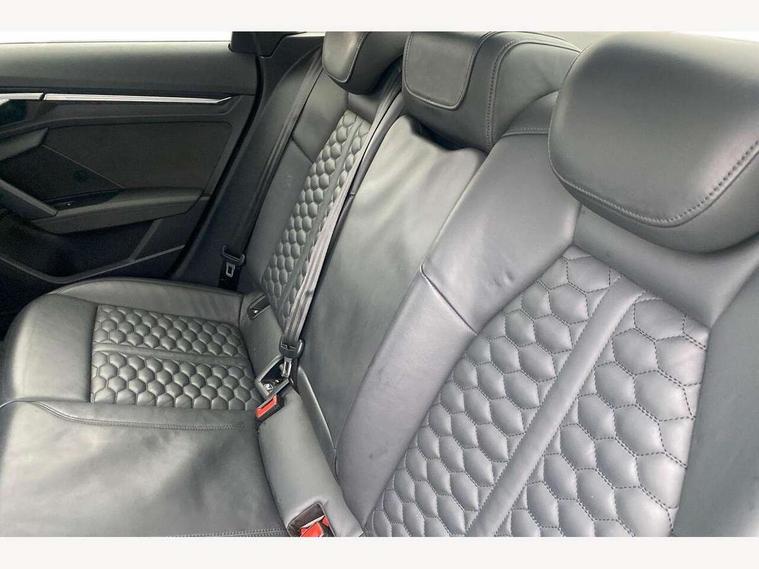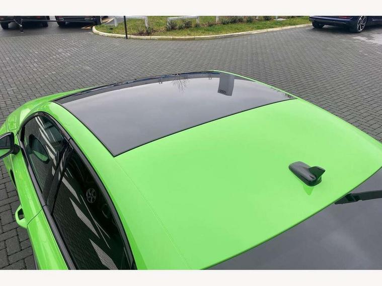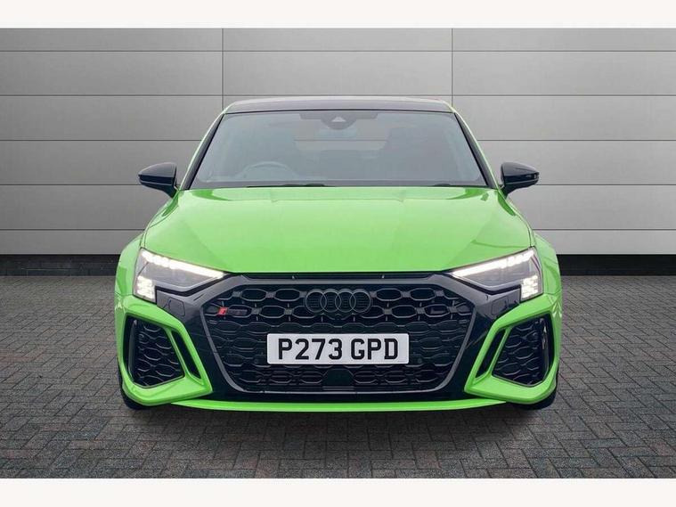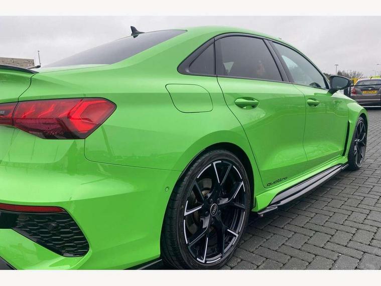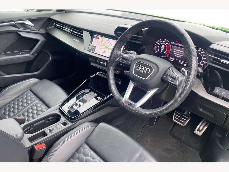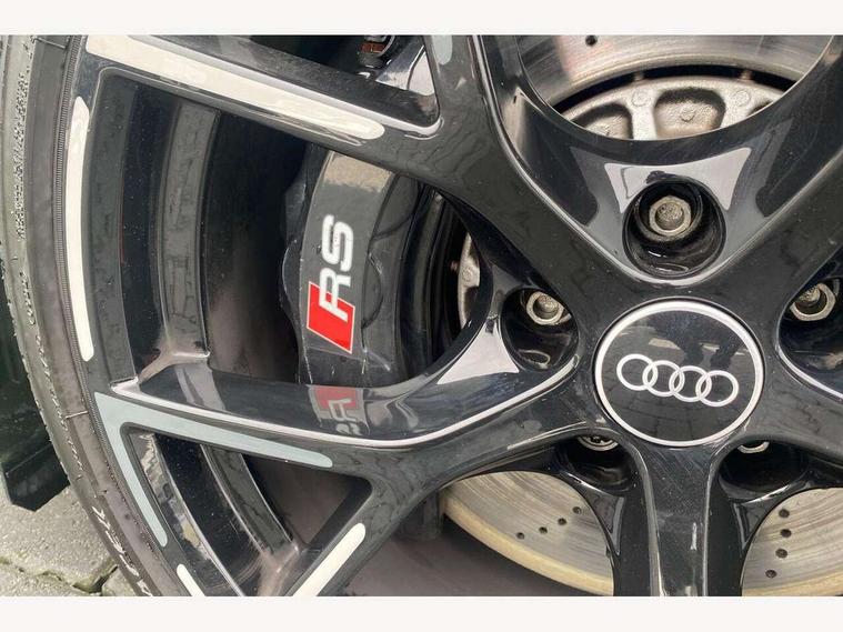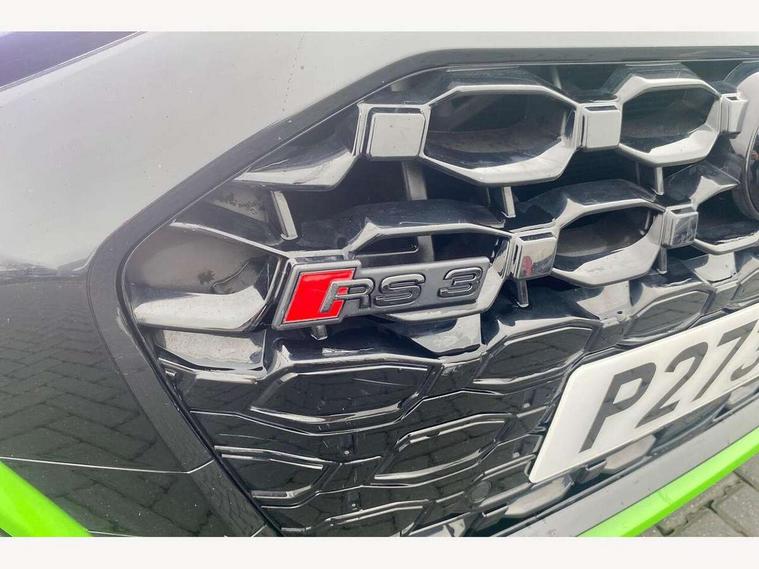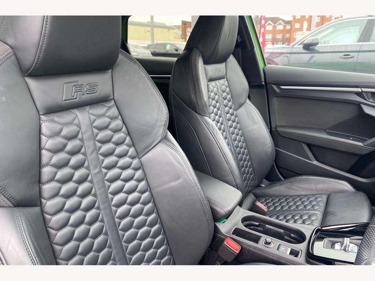 Audi smartphone interface, Audi virtual cockpit with RS specific display 12.3" full colour digital instrument cluster, Automatic start/stop system with recuperation, Bluetooth interface, Collision avoidance assistant, Emergency e-call, Head up Display, Lane departure warning system, Legal emergency call, Parking assist with parking system plus, Power operated tailgate - Luggage compartment lid opens electrically, Progressive power assisted steering, Reversing camera, Quattro permanent four wheel drive, Rear suspension, DAB Digital radio, 3rd brake light, Acoustic glass windscreen, Audi beam uses LEDs to project the Audi sport logo onto the ground as you exit your RS 3, Audi matrix LED headlights, LED rear lights, dynamic front and rear indicators and headlight cleaning system, Auto dimming rear view mirror, Black side skirts, Body colour roof, Carbon fibre engine cover, Electric adj heated/folding + auto dimming exterior mirrors with memory + LED indicator + auto kerb side function for passenger side exterior mirror, Front spoiler in high gloss black, Heat insulating glass windscreen, LED daytime running lights, Light and rain sensors, Panoramic glass sunroof, Privacy glass - dark tinted rear and rear side windows from B-pillar backwards, Rear boot, Rear side wing doors, RS exterior features in gloss black, RS sports exhaust system, 3 seat bench in 2nd row, 3 spoke leather multifunction steering wheel with gear shift paddles, 4 way lumbar support for front seats, 40/20/40 split folding rear seat bench, Black cloth headlining, Dual zone electronic climate control, Electrically adjustable front seats with memory function for driver's side, Front and rear headrests, Front centre armrest, Front sports seats RS embossed logo, Front/rear floor mats, Heated front seats, Honeycomb stitching and RS embossing, Illuminated door sill trims inlays in aluminium with RS 3 logo, RS emblems, Single front passenger seat, Stainless steel pedals and front footrest in black, Aluminium interior elements pack - RS3, Ambient lighting pack - RS3, Comfort and sound pack - RS3, Driver assistance pack with 3 spoke leather multi function steering wheel - RS3, MMI navigation plus with MMI touch - RS3, RS bodystyling - RS3, Storage Pack - RS3, 3x3 point rear seat belts, ABS/EBD, ASR, Audi pre sense front, Driver/Front Passenger airbags, EDL, ESC - Electronic Stability Control + traction control, Front passenger airbag deactivation, Front side airbags with head airbags and interaction airbag, Hill hold assist, Seat belt reminder with passenger presence detection in rear, Tyre pressure loss indicator, Warning triangle and first aid kit, Anti theft alarm, Anti-theft wheel bolts, Electronically operated child lock, Remote control central locking, Full decorative carbon trim, 19" 5 Y spoke black with graphic print alloy wheels, Tool kit, Tyre repair kit,