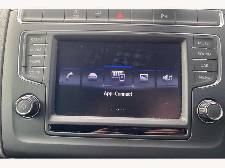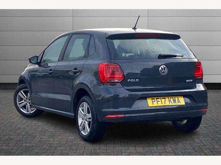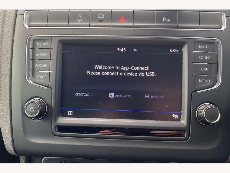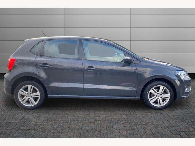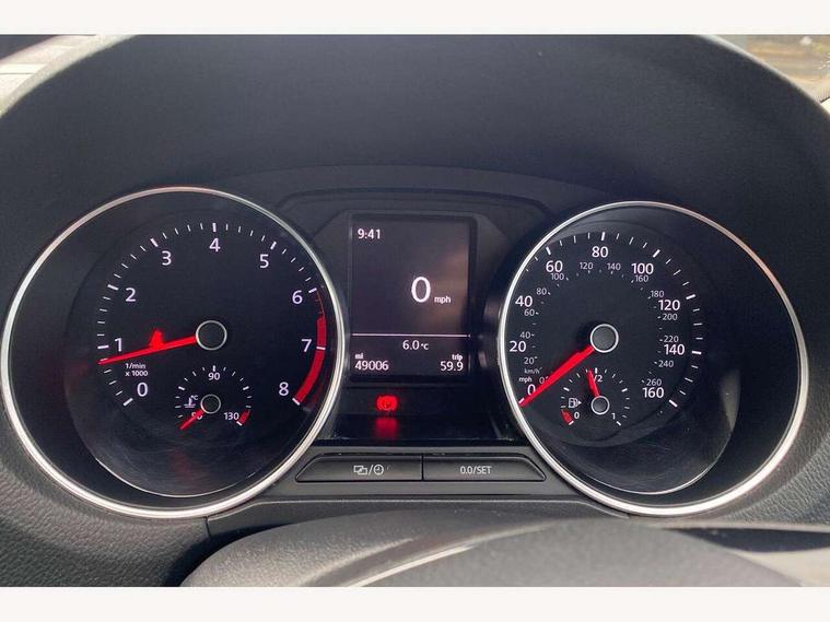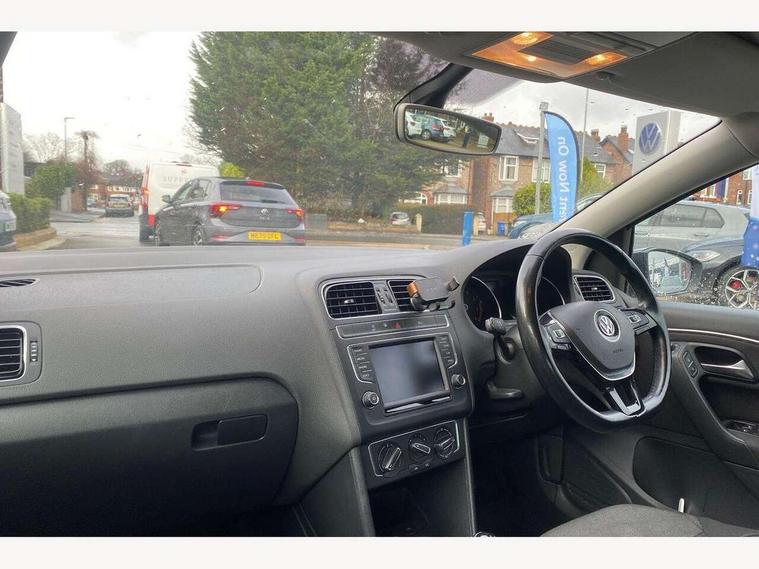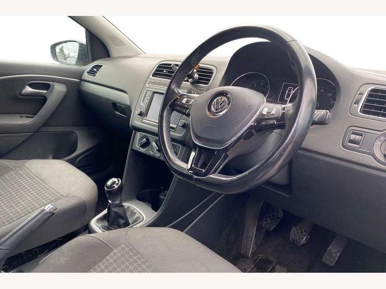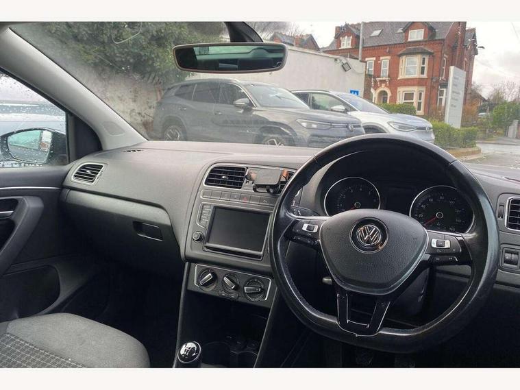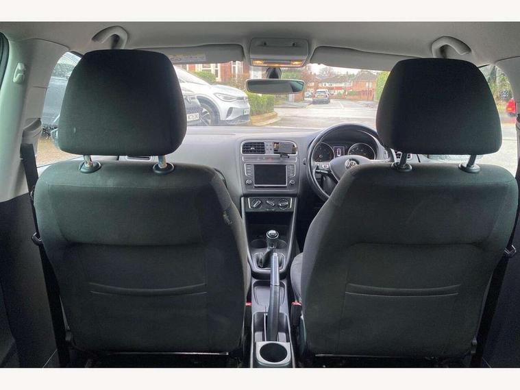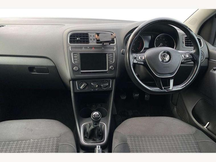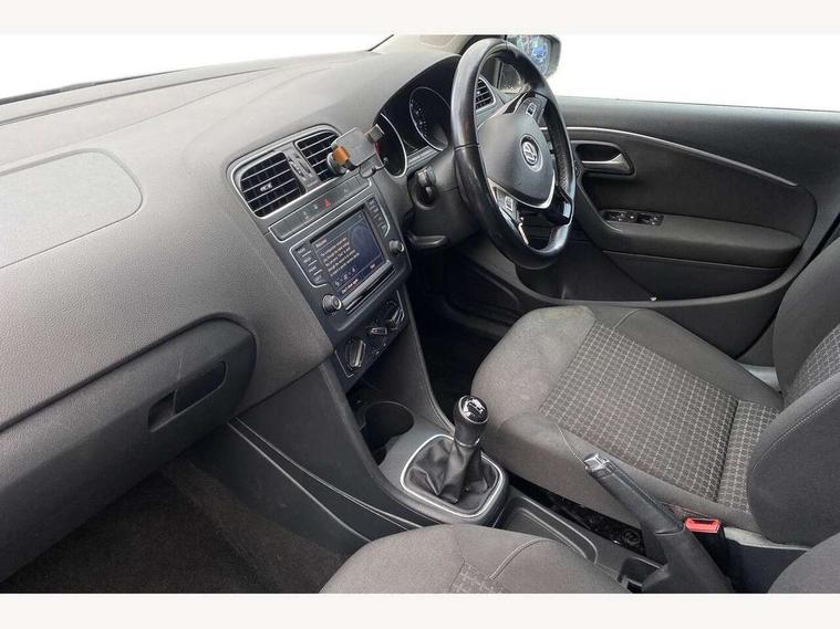 App-Connect, Bluetooth Telephone preparation, Cruise control + speed limiter, Driver alert system, Multi function display, Multifunction computer, PAS - speed related, Service interval indicator, Ultrasonic front and rear optical and audible parking sensors, Warning buzzer and light for front seatbelts unfastened, 6 speakers, Composition media system with radio, glovebox mounted CD, colour touch screen, SD card, aux-in, USB, multimedia interface, DAB Digital radio, Black grille with chrome surround, Body colour bumpers, Body colour door handles, Body colour door mirrors, Body coloured side sills, Chrome trimmed front air intake surrounds, Electric folding door mirrors, Electric front windows, Electric operated/heated door mirrors, Front fog lights with static cornering function, Front wash/wipe with interval delay, Heat insulated tinted glass 65% light absorbing from B pillar back, Heated rear window with auto timer, Rear electric windows, Rear windscreen washer and wiper with interval delay, 12V power socket in centre console, 2 bag hooks in luggage compartment, 2 cupholders, 3 rear head restraints, 3 spoke steering wheel, 4 grab handles, 60/40 split folding rear seat, Centre console storage, Chrome interior door handles, Driver and passenger sunvisors, Driver seat height adjust, Dust/pollen filter, Front door pockets, Front passenger seat height adjust, Front seat backrest storage nets, Front/rear reading lights, Glovebox, Height/reach adjustable steering column, Illuminated vanity mirror, Interior light with delay, Isofix Preparation 2 Rear child seats, Luggage compartment cover, removable, Luggage compartment lighting, Matt chrome gear lever gaiter surround, Multifunction leather steering wheel with leather gear knob/handbrake grip, Storage compartment in front doors, Storage compartment in rear doors, Sunglasses holder, Variable boot floor, Light and sight pack - Polo, 3 point height adj front seatbelts + pretensioners, 3x3 point rear seatbelts, ABS, Automatic post collision braking, Driver/front passenger airbag, Driver/Passenger whiplash optimised head restraints, ESC - Electronic Stability Control + traction control, ESP with EDL + ASR, HBA (Hydraulic Brake Assist), Hill hold control, Tyre pressure monitoring system, Alarm with remote central locking and interior protection, Electronic engine immobiliser, Air vents in Matt chrome, Matt chrome interior trim, 15" steel spare wheel,