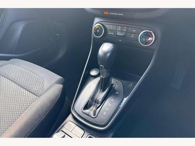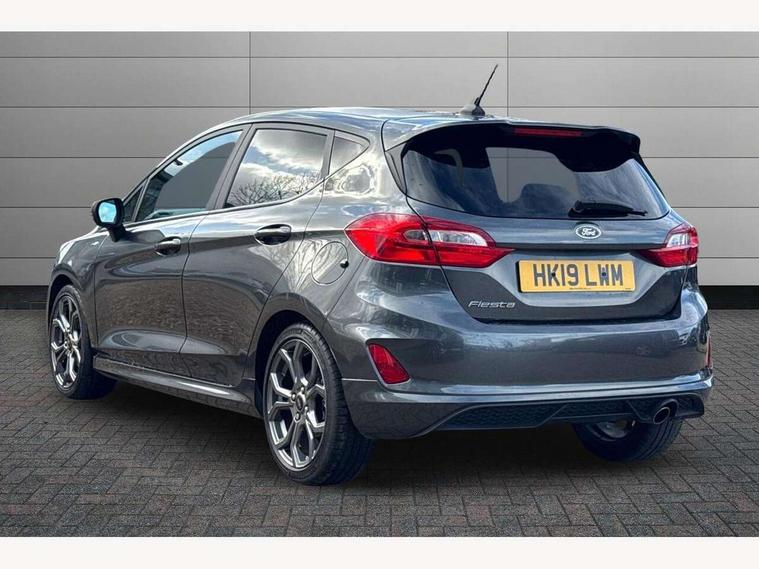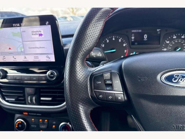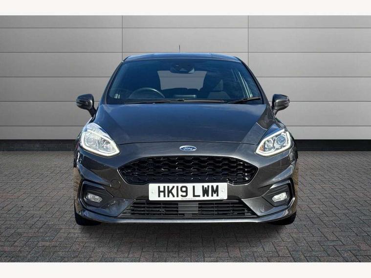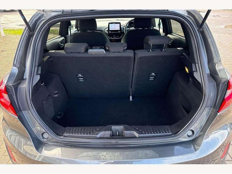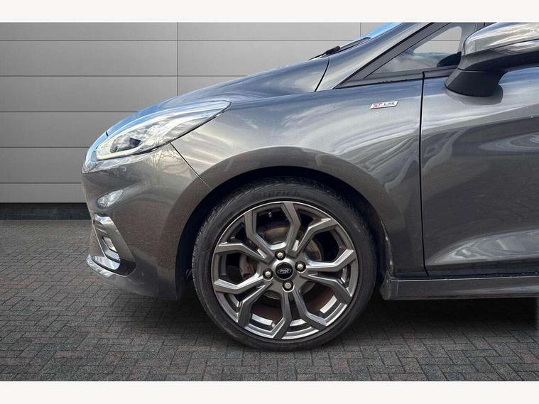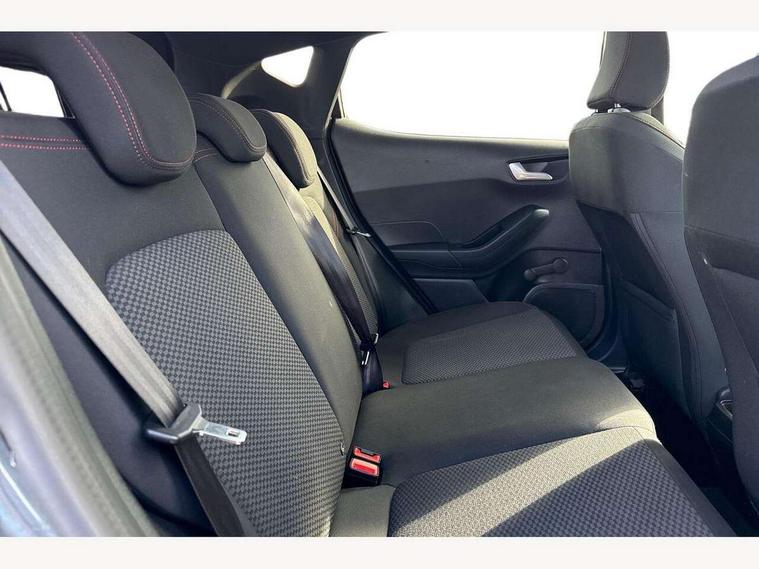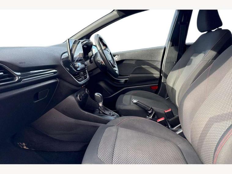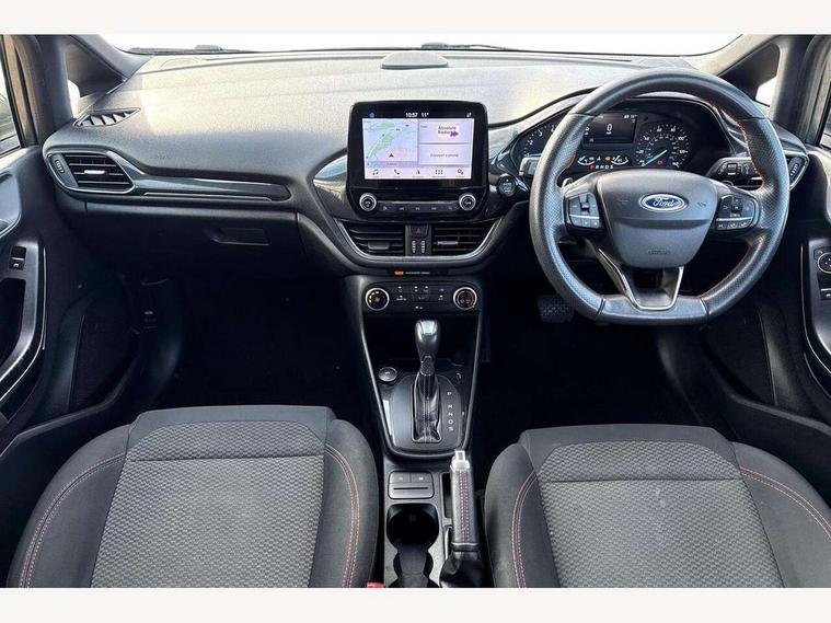 Bluetooth system, Electric power steering, Ford easy fuel, Trip computer, Sports suspension, 2 USB ports, Auxiliary input socket, DAB Digital radio, Steering wheel mounted controls, Automatic headlights, Body colour bumpers, Body colour door handles, Body colour electric adjustable heated door mirrors with integral indicators, Body colour large rear spoiler, Chrome door handles, Chrome lower window surround, Cornering front fog lights, Electric front windows/one touch facility, Quickclear heated windscreen, Rear wiper, Rugged body styling kit with active front wing badges, Tinted glass, Unique ST-Line upper grille & full bodystyling kit with ST-Line wing badges, 12V Accessory socket in centre console, 3 spoke flat bottomed leather steering wheel, 60/40 split folding rear seat, Adjustable head restraints, Ambient lighting, Black headlining, Boot carpet, Centre console with armrest and illuminated cupholders, Chrome inner door handles, Cloth upholstery, Footwell illumination, Front and rear velour floor mats, Front map reading lights, Front seat and rear pockets, Height adjustable driver's seat, Illuminated glovebox, Leather gear knob, Leather trimmed handbrake handle, Load area light, Manual air conditioning, Overhead console with sunglasses holder, Pollen filter, Rake/reach adjustable steering wheel, Rear centre head restraint, Sports front seats, Sports pedals, NCAP Pack - Fiesta, 3 point seatbelts on all rear seats, ABS+EBA, Curtain airbags, Driver and passenger airbags, Drivers knee airbag, Electronic stability control with hill start assist, Front passenger airbag deactivation, Front side airbags, Seatbelt warning, Tyre pressure monitoring system, Keyless start with 'Ford Power' starter button, MyKey system, Remote central locking & engine immobiliser, Thatcham Cat.1 alarm,