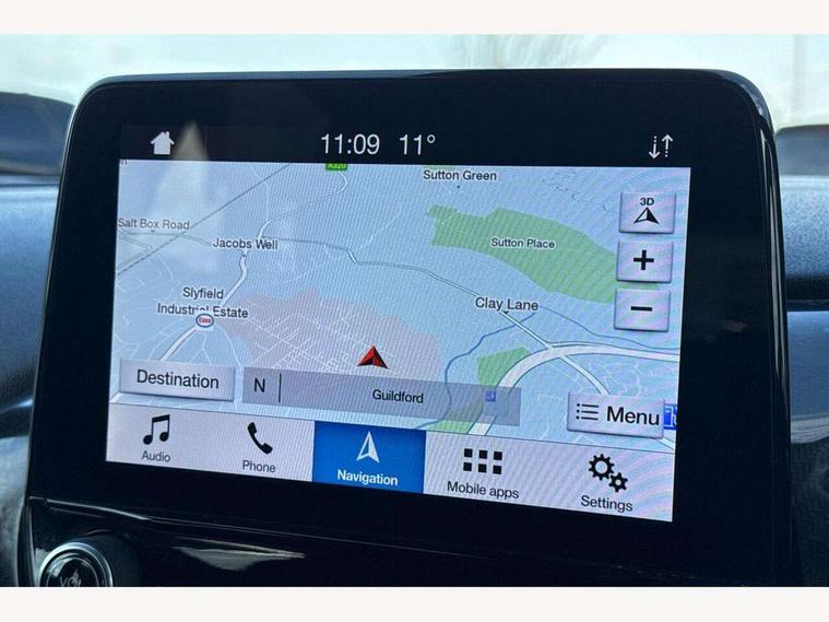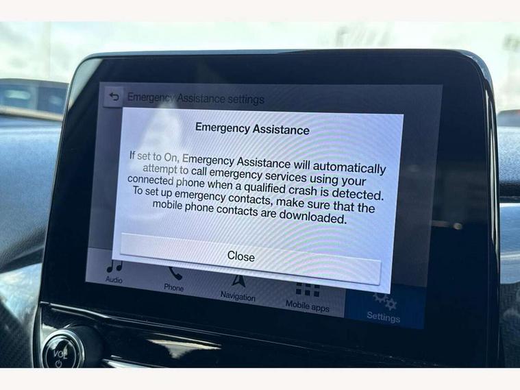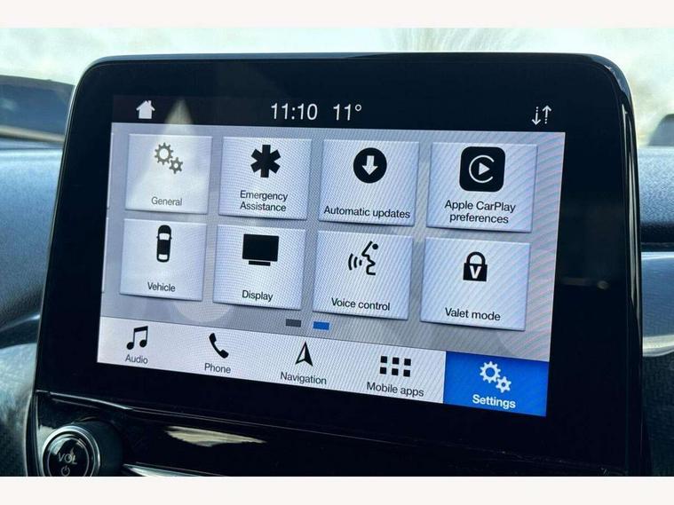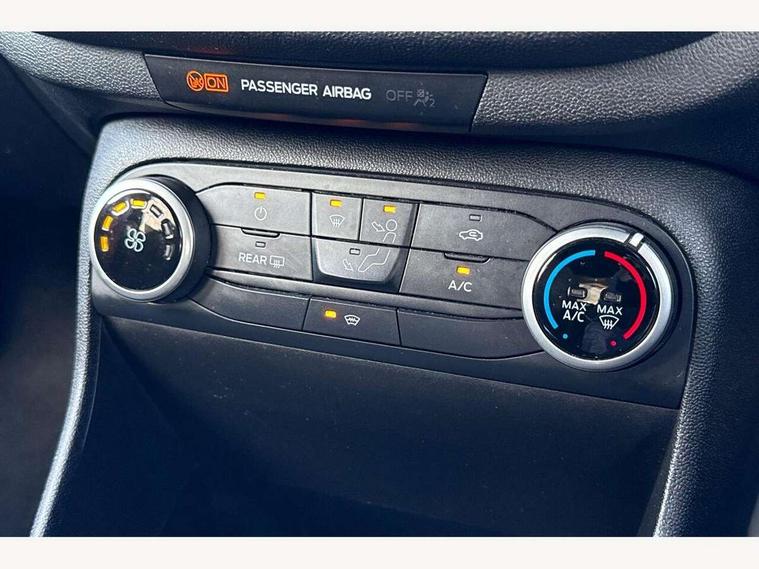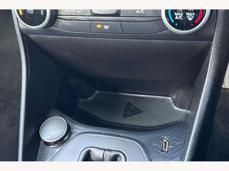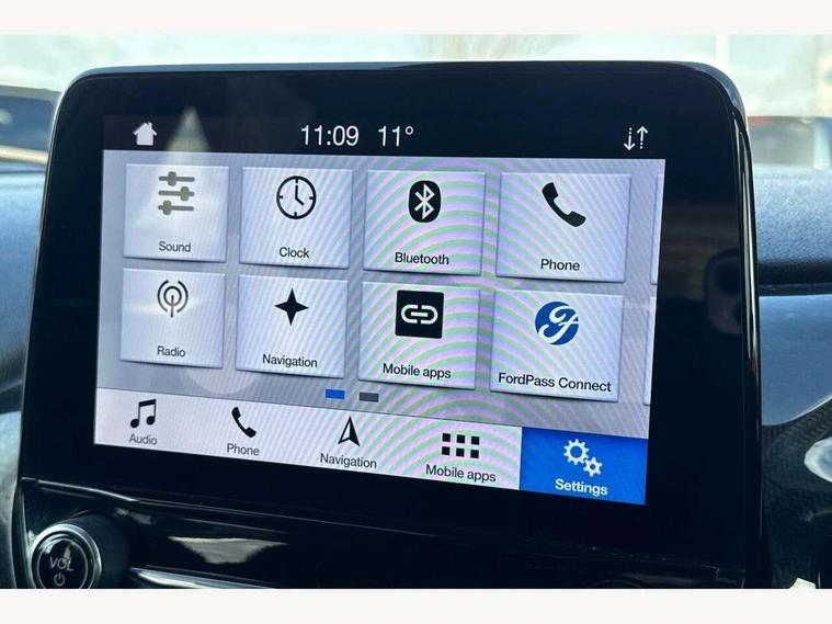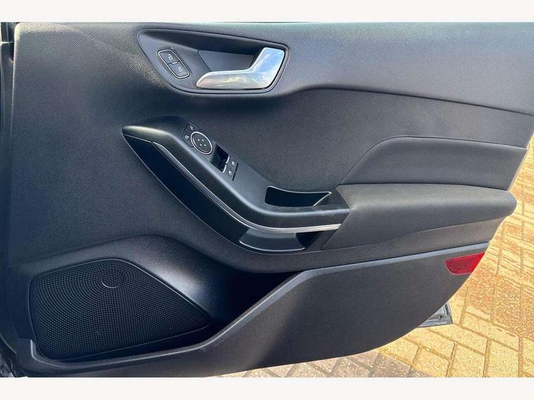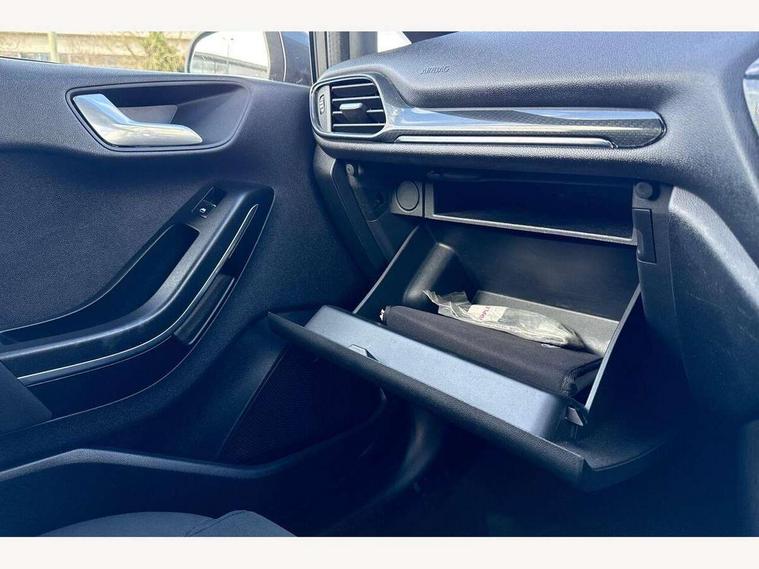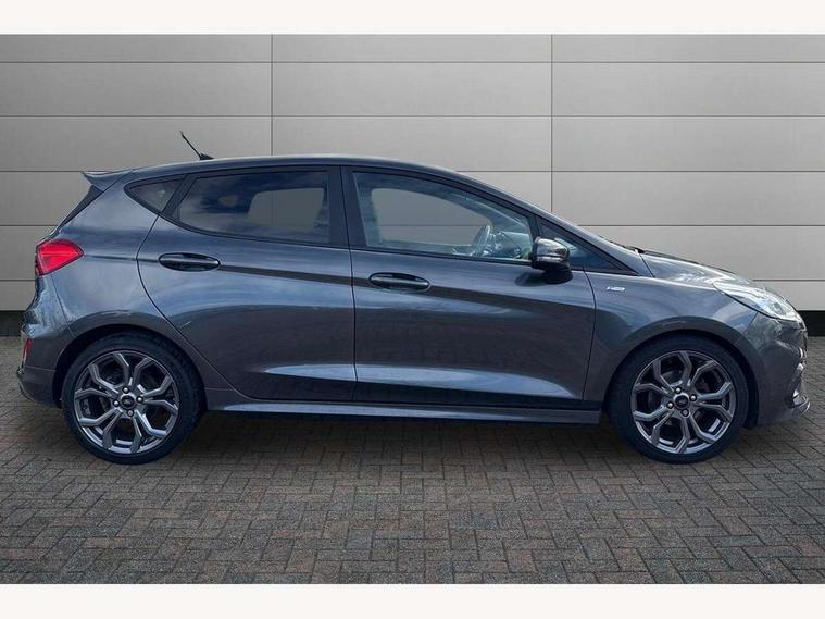 Bluetooth system, Electric power steering, Ford easy fuel, Trip computer, Sports suspension, 2 USB ports, Auxiliary input socket, DAB Digital radio, Steering wheel mounted controls, Automatic headlights, Body colour bumpers, Body colour door handles, Body colour electric adjustable heated door mirrors with integral indicators, Body colour large rear spoiler, Chrome door handles, Chrome lower window surround, Cornering front fog lights, Electric front windows/one touch facility, Quickclear heated windscreen, Rear wiper, Rugged body styling kit with active front wing badges, Tinted glass, Unique ST-Line upper grille & full bodystyling kit with ST-Line wing badges, 12V Accessory socket in centre console, 3 spoke flat bottomed leather steering wheel, 60/40 split folding rear seat, Adjustable head restraints, Ambient lighting, Black headlining, Boot carpet, Centre console with armrest and illuminated cupholders, Chrome inner door handles, Cloth upholstery, Footwell illumination, Front and rear velour floor mats, Front map reading lights, Front seat and rear pockets, Height adjustable driver's seat, Illuminated glovebox, Leather gear knob, Leather trimmed handbrake handle, Load area light, Manual air conditioning, Overhead console with sunglasses holder, Pollen filter, Rake/reach adjustable steering wheel, Rear centre head restraint, Sports front seats, Sports pedals, NCAP Pack - Fiesta, 3 point seatbelts on all rear seats, ABS+EBA, Curtain airbags, Driver and passenger airbags, Drivers knee airbag, Electronic stability control with hill start assist, Front passenger airbag deactivation, Front side airbags, Seatbelt warning, Tyre pressure monitoring system, Keyless start with 'Ford Power' starter button, MyKey system, Remote central locking & engine immobiliser, Thatcham Cat.1 alarm,