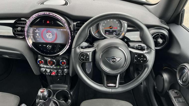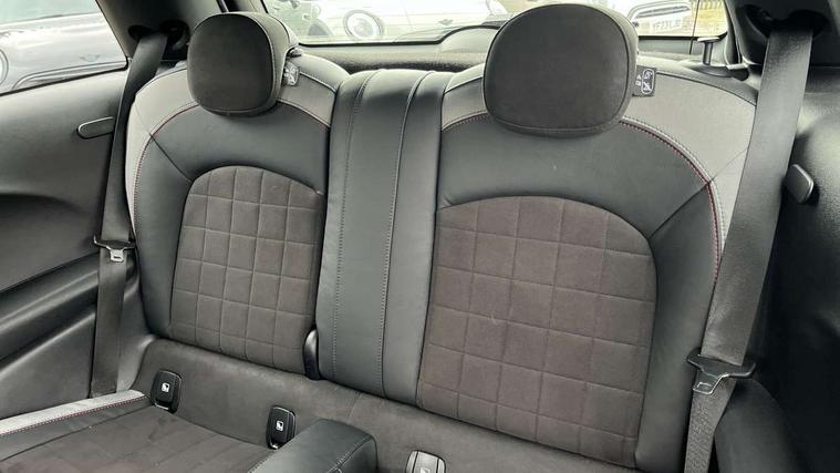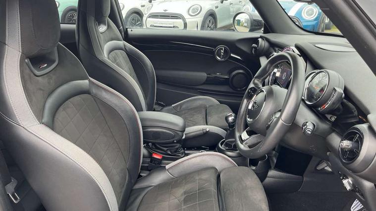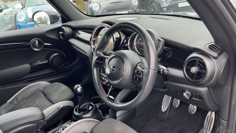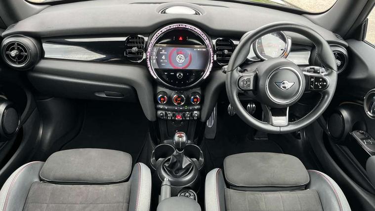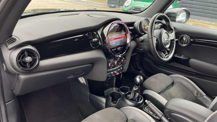 Apple CarPlay, Automatic start/stop function with brake energy recuperation, Compatible mobile phone bluetooth with audio streaming, Cruise control with brake assist, Electro-mechanical speed dependant steering assistance, Flexible car sharing preparation, Instrument cluster, MINI Driving Modes - centre toggle switch to control driving setting (sport, mid and green), Mini E-call, MINI TeleServices, On board computer, Rear park distance control, Service interval indicator, 6 Speed manual transmission including gear change indicator display, Double Vanos system, Fully variable valve control, High precision injection, Intelligent adaptive suspension, Performance Control, 8.8" touchscreen with LED ring, FM tuner and DAB digital radio, 3rd brake light, Automatic headlight activation switch, Bonnet scoop, Dynamic brake lights, Electric front windows, Heated rear window, Heated windscreen washer jets, JCW Aerodynamic kit - Front and rear bumpers with sporty JCW styling and part-painted side sills with MINI John Cooper Works door sill finishers, John Cooper Works rear spoiler, LED headlight with closed ring and daytime driving lights, Metal door sill strips with Cooper S, Model logo Cooper S on right of tailgate, Radiator grille chrome border with honeycomb structure including S Badge, Rain sensor window wipers, Rear fog lights, Rear LED lights with union jack design, Rear window wiper, Side scuttle panel with integrated indicator, Sun/heat protection glass, Two central exhaust tailpipes with chrome finisher, White indicator lenses, 12V Accessory socket in centre console, 2 seat bench in 2nd row, 4 lashing eyes in luggage compartment, 60/40 split folding rear seat, Anthracite headliner including grab handles and clothes hooks, Carbon black colour line - Knee roll and door armrest, Chrome interior highlights, Cupholders, Front and rear isofix with front passenger airbag deactivation, Front floor mats in velour, Glove compartment, Height and length steering column adjustment, Interior lighting with 12 different colours across the dashboard, underneath door bezel with illuminated laser-engraved design on central display, JCW Sport seats with integrated headrests, adjustable thigh support and John Cooper Works logo, Leatherette gearshift lever and handbrake gaiters, LED reading lights, vanity mirror lights, front foot well light and spotlight on front seats, Manual air conditioning, Mechanical seat adjustment - forward/back & backrest for front seats and driver seat height adjust, Multifunction steering wheel, Passenger seat height adjuster, Single front passenger seat, Storage compartments in doors, Storage pocket on back of front seats, Sunvisors with vanity mirrors, Walknappa leather steering wheel with grey seam and John Cooper Works badge on Piano Black lower steering wheel spoke, Piano black exterior pack - Mini Hatchback Cooper S, 3 point seatbelts on all four seats, 6 Airbags - front, side, head and seat belt tensioners, Anti-lock braking system (ABS), DSC - Dynamic Stability Control, Front and rear disc brakes, Two tone horn, Tyre pressure monitoring system, Alarm system with tilt sensor, monitoring doors, bonnet interior and tailgate, Electronic vehicle immobiliser, Start/stop toggle with keyless go, Piano black interior trim, Tool kit,