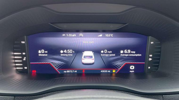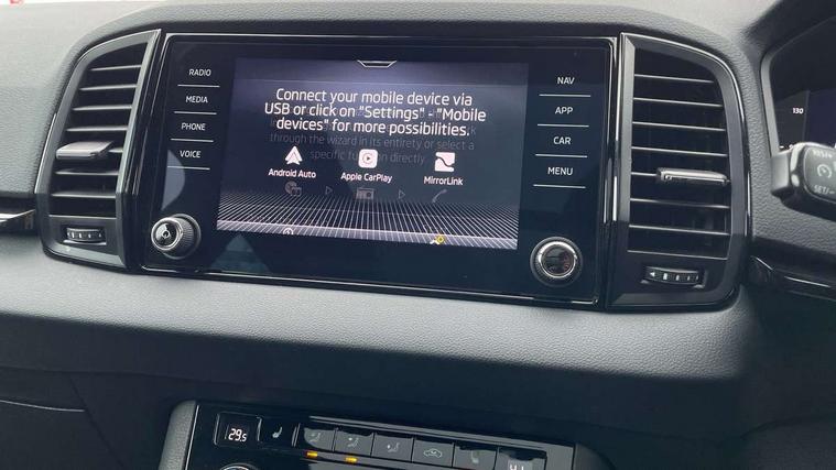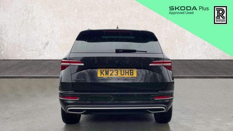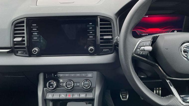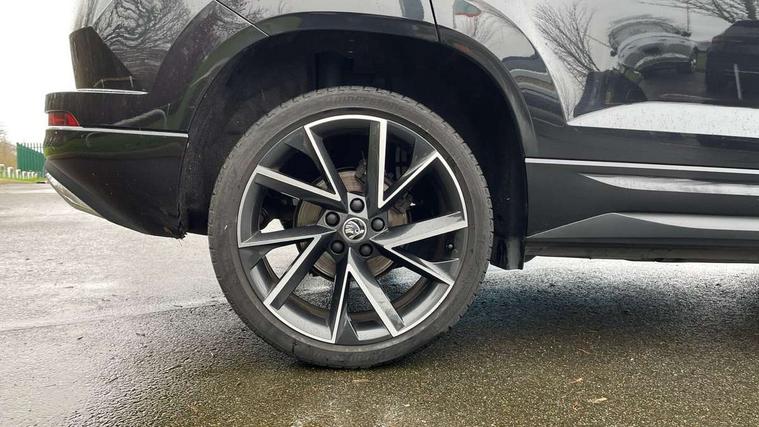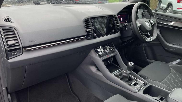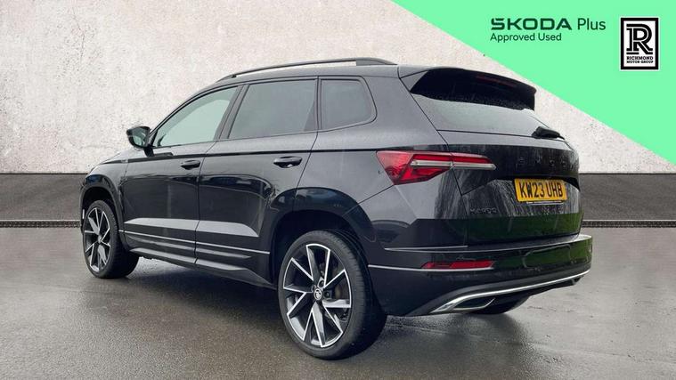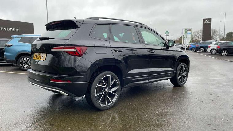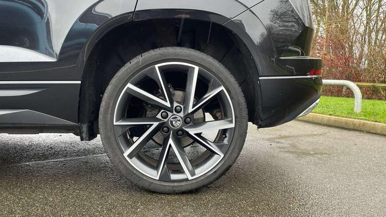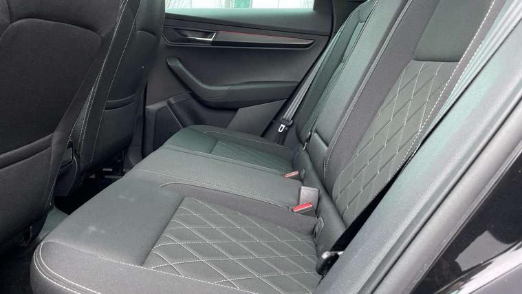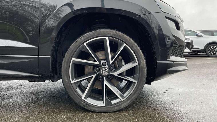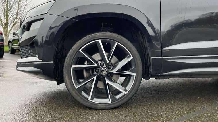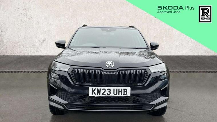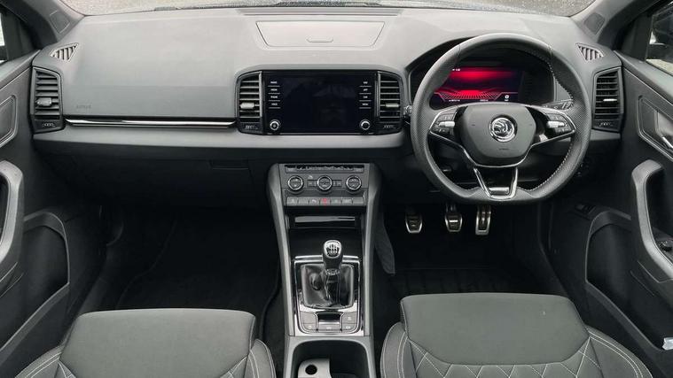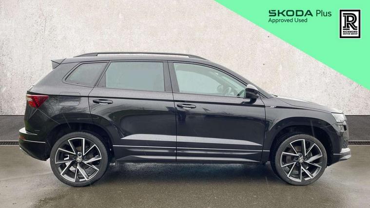 8" Digital display, Care connect, Driver fatigue sensor, Emergency services call system, Outside temperature gauge, Service interval indicator, SmartLink wireless for Apple and wired for Android, Start/stop system with regenerative braking, USB C Port x 2 in front centre console, Virtual cockpit, Virtual pedal with electrically operated boot door, 8 speakers, DAB radio with Bluetooth, USB connection, Wireless charging without wireless aerial connection, Acoustic glass, Aero front windscreen wipers with intermittent function, Auto dimming rear view mirror with light and rain sensors, Black door mirrors, Black electric window control buttons, Black radiator grille, Black roof rails, Body colour door handles, Electric front and rear windows with child proof lock, Front door steps with SportLine logo, Heated rear windscreen, LED daytime running lights, LED rear lights with high functionality welcome effect and dynamic indicators, Light assistant (coming/leaving home/tunnel light), Panoramic sliding sunroof, Plastic scuff plates, Privacy glass, Protective door side sills in body colour, Rear diffuser, Rear side wing doors, Rear spoiler, Rear window wiper with washer system and intermittent control, Safety reflectors on front doors, Skoda lettering on tailgate in black, Sportline badge on front fender, Sportline decorative inserts with badging, Sports front and rear bumpers, 1.5 litre bottle holders in driver and front passenger door panels, 12V socket in boot, 12v socket in front centre armrest with storage compartment and rear air vents, 3 rear height adjustable headrests, 3 seat bench in 2nd row, 3 spoke leather sports multifunction steering wheel and silver stitching, 4 foldable roof handles with rear coat hooks, Black floor carpet, Black roof headlining, Chrome inner door handles, Double sided boot floor, Foldable hooks in the boot, Front head restraints, Height adjustable front three point seats belts with tensioners, Height/reach adjust steering wheel, Ice scraper, Illuminated glovebox, Illuminated luggage compartment, Isofix child seat preparation outer rear, Manual lumbar support for front seats, Pen holder, Pollen filter, Rear boot cover, Rear reading lights, Rear seats fixed folding and divided 60:40, Rubbish bin door, Safety vest holder, Single front passenger seat, Storage box in upper central dashboard closed, Sunvisors with illuminated vanity mirrors, Textile floor mats, Ticket holder, Titan black interior ceiling, Tool kit, Welcome animation with sportline logo, Boot pack - Karoq, Light Pack - Karoq, Parking pack - Karoq, Automatic door unlocking in case of crash, Automatic fuel cut off in case of crash, Child locks on rear doors, Driver airbag, Electronic parking brake with auto hold function, Emergency rear braking signal, ESC including ABS, MSR, ASR, EDS, HBA, DSR, RBS, MKB and traction control, Front side airbags, Hill hold control, Knee airbags, Passenger airbag with switch-off function, Pedestrian monitor, Seatbelt reminder signalisation and pretensioner for all seats, Three point seatbelts rear, Two tone horn, Tyre pressure display, Tyre pressure monitor, Alarm with interior monitoring, back up horn and tilt sensor with safe function, Electronic engine immobiliser, Keyless entry and start/stop, Remote central locking with 2 remote folding keys, Black air vent surround, Black centre console, Satin black dashboard, Satin black door trim, 19" Vega black polished alloy wheels, Anti-theft wheel bolts protection, Matt black aero hub caps, Storage on wheel cover,