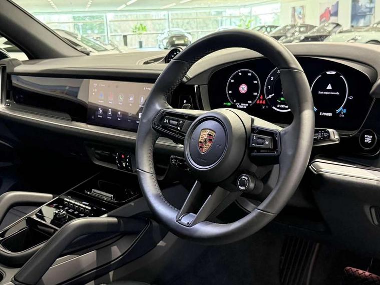 Active parking assist and 360 camera, Active speed limit assist, Adaptive cruise control, Android Auto, Apple car play, Brake pad wear indicator, Central analogue rev counter with black dial face, power meter and pointers in acid green, Driver awareness detection, Driver personalisation for climate, audio and communication, assistance systems and other customisable car systems, E-call, Energy recuperating braking system, High resolution 12.3-inch touchscreen display in full HD resolution, Individual mode for individual selection of vehicle drive settings, Instrument cluster with 12.6" curved display, Instrument cluster with two high-resolution displays, Lane change assist, Mobile phone preparation with Bluetooth interface for telephone and music, Mode switch, Porsche Communication Management (PCM) including online navigation module, mobile phone preparation, audio interfaces and voice control system, Power steering plus, Power tailgate with gesture control, Reversible occupant protection measures, Self steering park assist, Smartphone integration, Speed limit indicator, Vehicle electrical system recuperation, Warn and brake assist including pedestrian protection, 11 kW on board AC charger, 32A 230V blue industrial supply cable and basic wall mount, 70 litre fuel tank, 8 speed automatic gearbox, Adaptive air suspension with levelling system and height adjustment with Porsche Active Suspension Management (PASM), Aluminium cylinder heads and engine block, Direct fuel injection (DFI) with central injector position, Front and rear aluminium multi link axles, Gasoline particulate filter, Lithium-ion battery, Mode 3 charging cable, Power electronics, battery manager and electrically powered auxiliary units, Sport mode, Standard charging cable length, Standard suspension, Starter battery, Supply cable for domestic electrical socket (10A), Turbocharger, VarioCam Plus, Water cooled with thermal management, AM radio, Digital radio+, Fast charging two USB-C PD connectivity and charging port in front storage compartment, Smartphone compartment with wireless charging, Two USB-C PD charging ports in the rear, Active air intake flaps, Aluminium finish fuel filler cap, Aluminium roof, Auto dimming interior + exterior mirrors, Automatic headlight activation including welcome home functionality, Bumper system with high strength cross members and two deformation elements + Two receptacles with screw threads towing lug + onboard tool kit, Deletion of GTS logo on sideskirt inlays, E-Hybrid logo on front wings with border in black, Electric windows + anti trap protection + one touch open/close drivers side, Electrically adjustable, folding and heated exterior mirrors, aspherical on drivers side including courtesy lights, Extensive aerodynamic underbody protection, Exterior mirror lower trims including mirror base in black, Fixed Panoramic roof system, Four point signature LED daytime running lights, Front end with integrated air intakes and airblades for the side air intakes, Front light modules including position lights and direction indicators in LED light guide technology, Front windscreen wipers with two speeds, intermittent wipe and rain sensor, Fully galvanised steel / aluminium hybrid lightweight bodyshell and Aluminium bonnet, tailgate, doors, side panels, roof and front wings, Heated rear window with automatic switch off, LED High level third brake light integrated into roof spoiler, Lower valance, PORSCHE logo LED door courtesy lights, PORSCHE' lettering integrated in tailgate strip, Privacy glass, Rear diffusor in louvered design, Rear side wing doors, Rear window wiper with intermittent function and washer jet, Right fuel filler cover and left charging port cover, Side window trims and front inlays in high gloss black, Thermally tinted insulated glass all round, Tinted HD matrix LED headlights, 3 seat bench in 2nd row, 4-way headrests front/2-way headrests rear, Ambient lighting, B-pillar clothes hooks on driver and passenger's side, Charge air cooling, Deletion of turbo S logo embossed on headrests, Door interior with decorative surfaces and accent trims, Double sun visors for driver and front passenger, Electric sound, Electric steering column, Elevated centre console with handles, Five seats rear seat system with two comfort outer seats and a central seat, Front and rear bottle holders in door panels, Front centre armrest, Heated front seats, Illuminated make-up mirror in sun visors, Isofix fastening system for child seats on outer rear seats, Leather covered fixed luggage compartment cover, Leather door panel and central armrests, Leather gear selector, LED interior light with switchoff delay function, footwell + glove compartment light, ashtray + ignition lock illumination, front + rear reading light, Manual height adjust for driver and front passenger seat belt, Particle/pollen filter with active carbon filter, PM 2.5 fine dust filtering, Porsche crest on front headrests, Rear seat split folding design 40:20:40, Fold out centre armrest with integrated cup holder, manual fore/after adjust and backrest angle adjust, Retractable roller luggage compartment cover in detachable cassette, Sideskirts in black plastic, Single front passenger seat, Soft close doors, Steering code engine cooling system, Storage compartments - Cooled glove compartment, front centre console, door and map pockets on front seat backrests + side luggage compartment, Three 12V power sockets - front below the glove compartment, centre console and at side of luggage compartment, Two integrated cup holders in front and rear with variable diameter, Driver and front passenger memory pack - Cayenne, High gloss silver exterior package - Cayenne, 3-point automatic seatbelts with front and outer rear seats pretensioners and front force limiter with 3-point automatic seatbelt for rear centre seat, 4 piston aluminium monobloc fixed brake calipers at rear, 6 piston aluminium monobloc fixed caliper brakes at front, Active bonnet, Auto hol