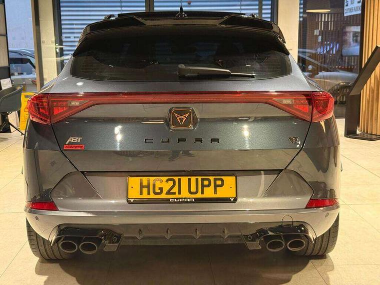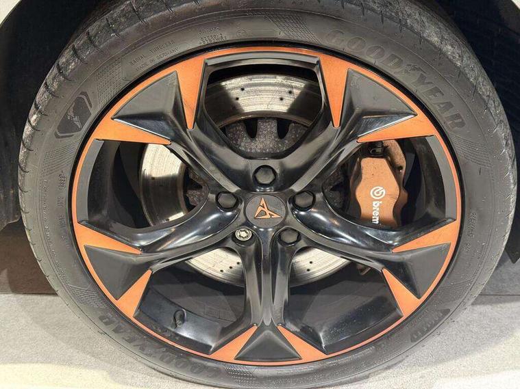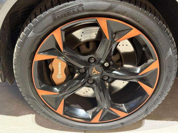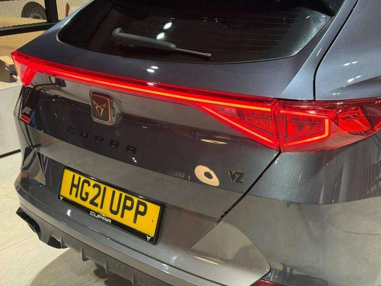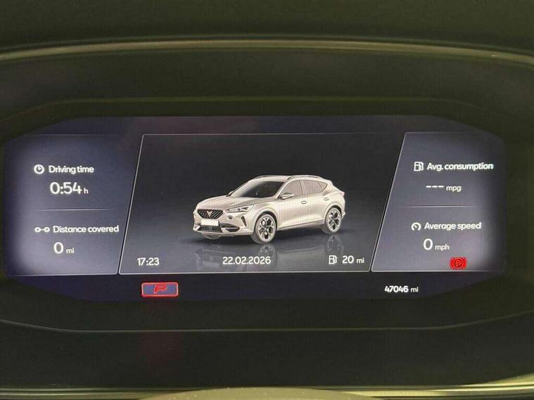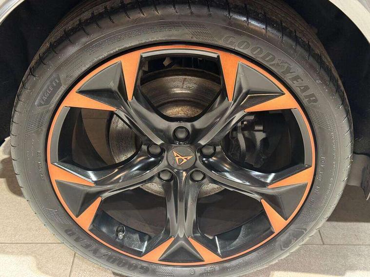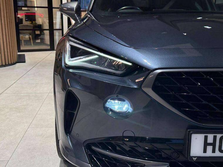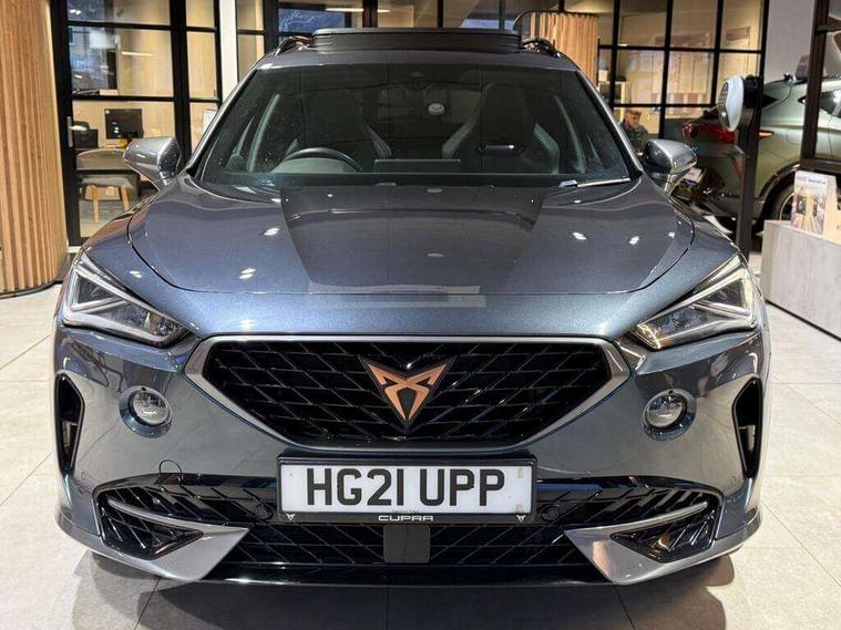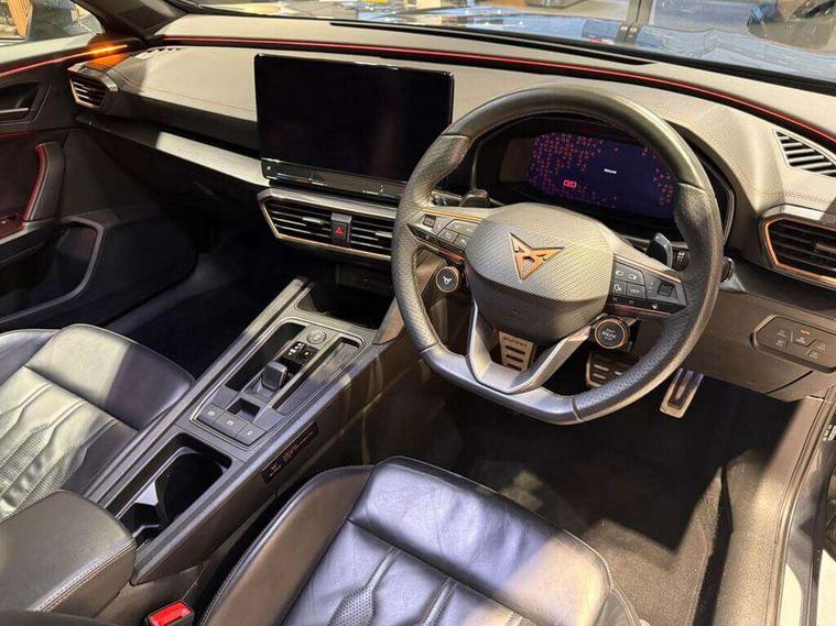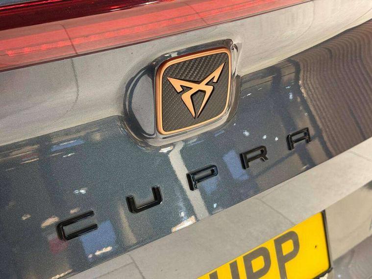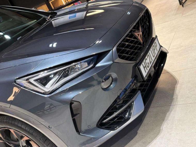 Digital cockpit and configurable dashboard, Driver alert system, Dynamic chassis control with driving profile selection (Comfort, Sport, CUPRA, Individual), Forward collision warning with automatic braking, Park assist (inc front/rear parking sensors), Predictive adaptive cruise control with speed limiter, Rear view camera, RPM, trip computer, outside temp gauge, instrument light brightness, low fuel warning light, lights on reminder, gearshift indicator, Service interval indicator, Speed sensitive power steering, Start/stop system with regenerative braking, Virtual pedal and electric tailgate, Wireless apple carplay, Wireless phone charger, Electronic locking differential and dynamic traction support, Sports suspension with front shock absoption, 2 front and 2 rear USB type C sockets, Auxiliary input socket, DAB radio, Auto dimming rear view mirror, Body colour door handles, Body coloured bumpers, Dark grey wing mirror, Daytime running light with automatic headlight control and coming home feature, Dynamic headlight range control, Electric front/rear windows, Electrically adjustable, heated and folding door mirrors, Front fog lamps with cornering function, Gloss black roof rails and window surrounds, LED Headlights, LED Taillights with dynamic indicator, Metallic paint, Panoramic sunroof, Rain sensing wipers, Rear diffuser with twin exhaust pipe on each side, Rear wash/wipe, Sports bumpers, Tinted rear windows, Welcome lights, 12v power supply in centre console, 12v socket in loadspace, 2 front and 2 rear reading lights, 230V socket, 60/40 split rear bench seat with armrest and mechanical seat release, Black headlining, Cupra sports pedals, Dust/pollen filter, Front and rear head restraints, Front centre armrest, Heated steering wheel, Height/reach adjust steering wheel, Illuminated interior front door sills, Illuminated sunvisor with mirror, Interior ambient lighting, Isofix, Leather multi-function sports steering wheel with start stop, CUPRA mode button and gear shift paddles, Luggage tie-down hooks, Three zone climate control, Three zone climate control with control panel in rear, Variable luggage/load compartment floor, Wraparound lighting, Genuine Nappa leather Pack - Cupra, Navigation system pack - Formentor, Safety and driving pack (XL) - Formentor, 3 point seatbelts on all rear seats, ABS, Brake control system - ESC and brake booster, Brembo brakes, Child proof door locks, Driver and front passenger airbags with front passenger airbag de-activation, Electronic parking brake, Front side curtain airbags, Hill hold control, Seat belt reminder for front and rear seats, Tyre pressure monitoring system, Anti theft alarm system, Keyless entry and start system (KESSY), Locking wheel bolts, Copper and aluminium interior detailing, 19" Sport copper/black alloy wheels with 94W tyres, Breakdown kit, Emergency tyre repair kit,