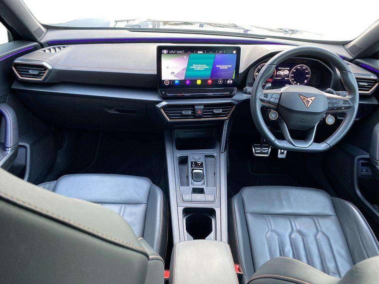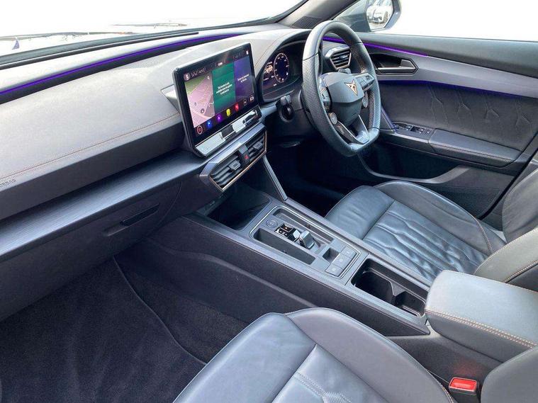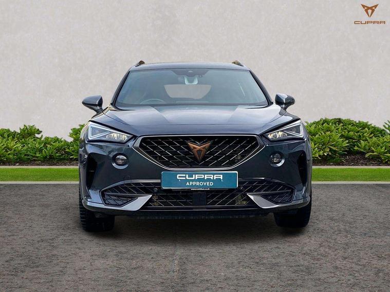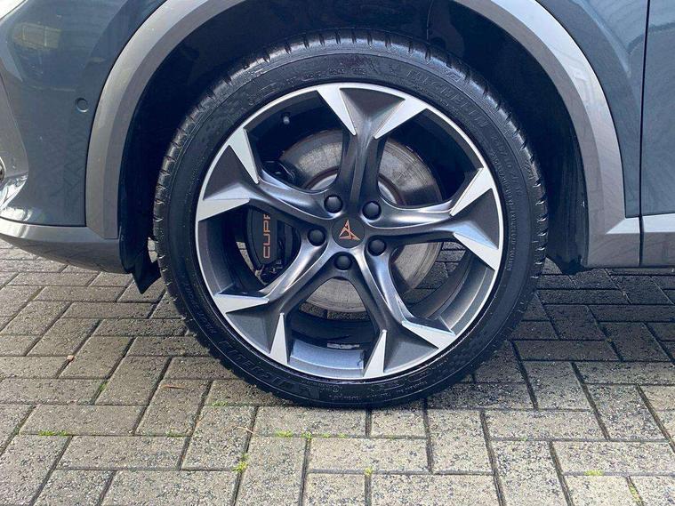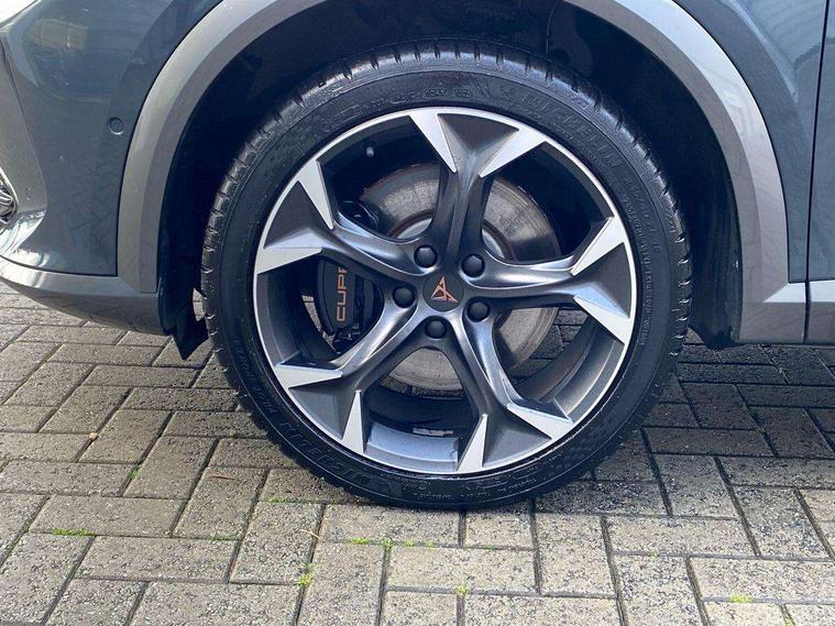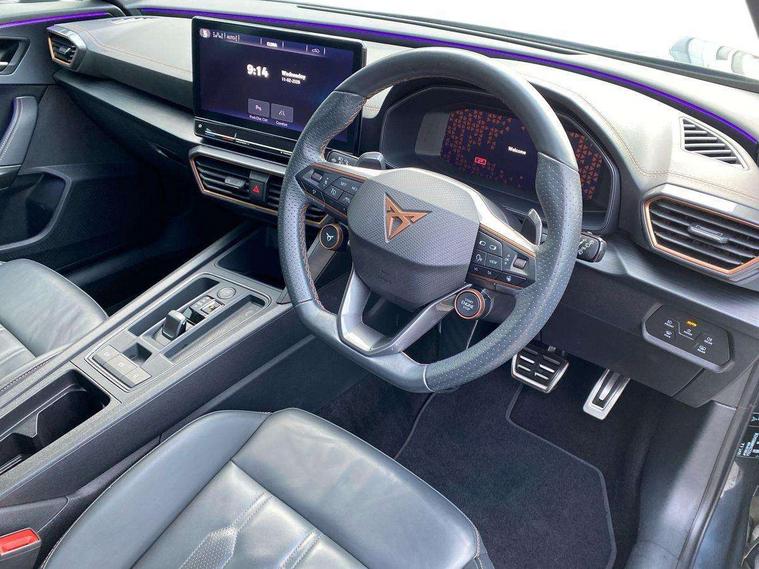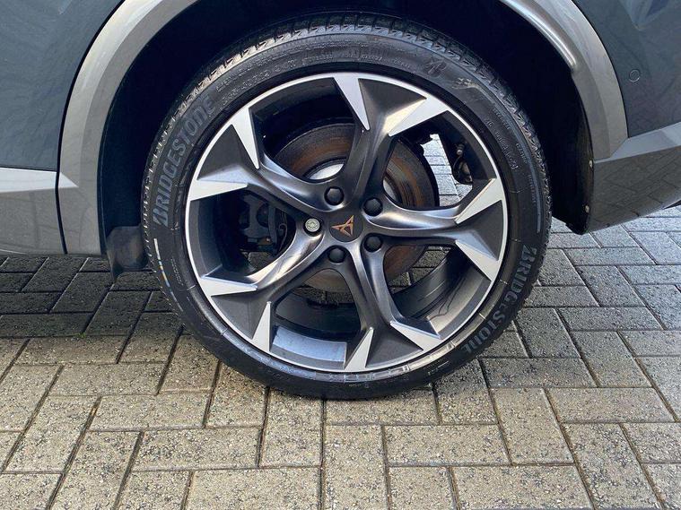 Digital cockpit and configurable dashboard, Driver alert system, Dynamic chassis control with driving profile selection (Comfort, Sport, CUPRA, Individual), Forward collision warning with automatic braking, Lane assist, Navigation system with 12'' Touchscreen Display, Park assist (inc front/rear parking sensors), Predictive adaptive cruise control with speed limiter, RPM, trip computer, outside temp gauge, instrument light brightness, low fuel warning light, lights on reminder, gearshift indicator, Service interval indicator, Speed sensitive power steering, Start/stop system with regenerative braking, Virtual pedal and electric tailgate, Voice control system, Wired Android Auto, Wireless apple carplay, Wireless phone charger, 10 amp mode 2 charging cable, 16 amp mode 3 charging cable, 3.6 kw On-board charger, Electronic locking differential and dynamic traction support, Sports suspension with front shock absoption, 2 front and 2 rear USB type C sockets, Auxiliary input socket, DAB radio, Auto dimming rear view mirror, Body colour door handles, Body coloured bumpers, Dark grey wing mirror, Daytime running light with automatic headlight control and coming home feature, Dynamic headlight range control, Electric front/rear windows, Electrically adjustable heated and folding door mirrors with memory function, Front fog lamps with cornering function, Gloss black roof rails and window surrounds, LED Headlights, LED Taillights with dynamic indicator, Rain sensing wipers, Rear diffuser with twin exhaust pipe on each side with simulated exhausts, Rear side wing doors, Rear wash/wipe, Sports bumpers, Third brake light, Tinted rear windows, Welcome lights, 12v power supply in centre console, 12V socket, 12v socket in loadspace, 2 front and 2 rear reading lights, 230V socket, 3 seat bench in 2nd row, 60/40 split rear bench seat with armrest and mechanical seat release, Black headlining, Cupra sports pedals, Dust/pollen filter, Front and rear head restraints, Front centre armrest, Height/reach adjust steering wheel, Illuminated interior front door sills, Illuminated sunvisor with mirror, Isofix, Leather heated multi-function sports steering wheel with start stop, CUPRA mode button and gear shift paddles, Luggage tie-down hooks, Single front passenger seat, Three zone climate control with control panel in rear, Wraparound lighting, Genuine Nappa leather Pack - Cupra, Safety and driving pack (XL) - Formentor, 3 point seatbelts on all rear seats, ABS, Brake control system - ESC and brake booster, Child proof door locks, Driver and front passenger airbags with front passenger airbag de-activation, Electronic parking brake, Front and rear disc brakes, Front side curtain airbags, Hill hold control, Public e-call, Seat belt reminder for front and rear seats, Tyre pressure monitoring system, Anti theft alarm system, Keyless entry and start system (KESSY), Locking wheel bolts, Copper and aluminium interior detailing, 19" 'Exclusive' machined sport matte black and silver alloy wheels, Tyre repair kit,