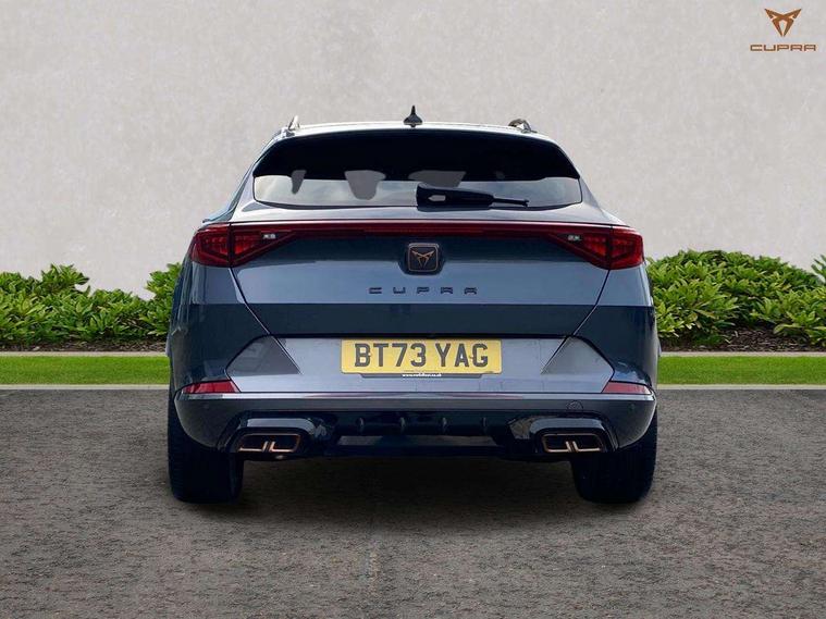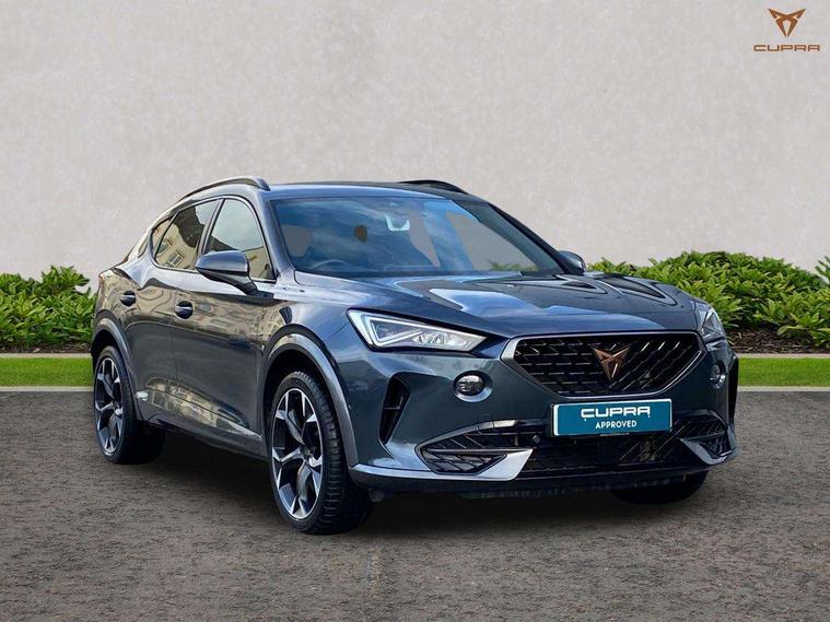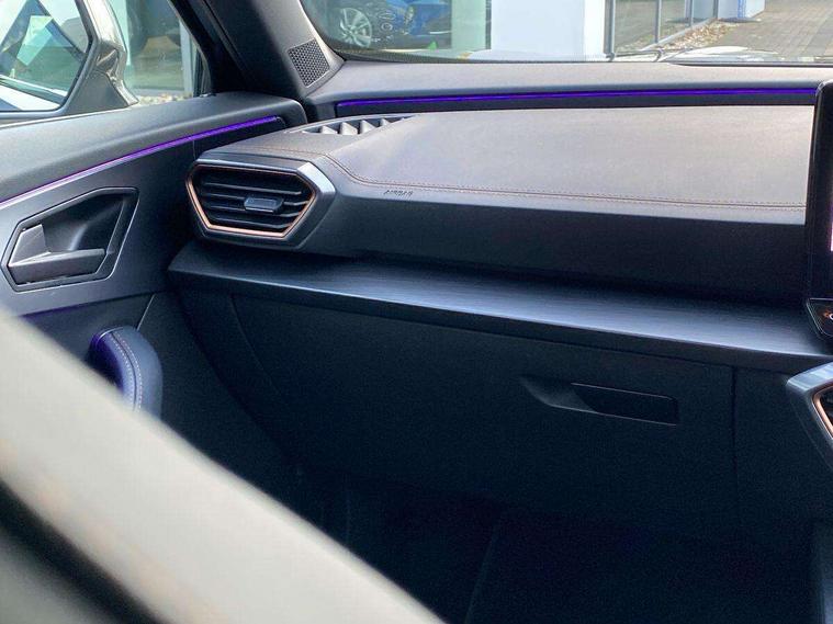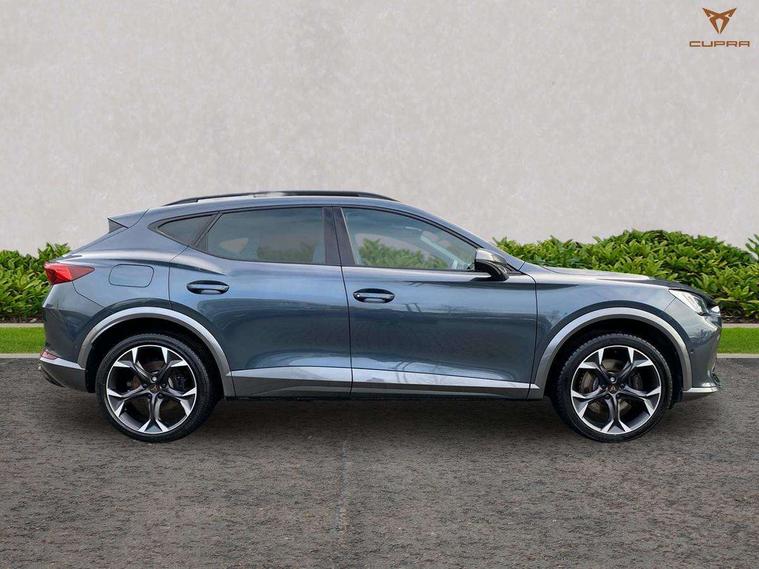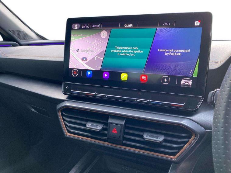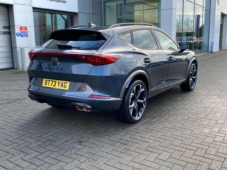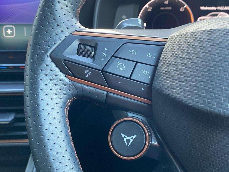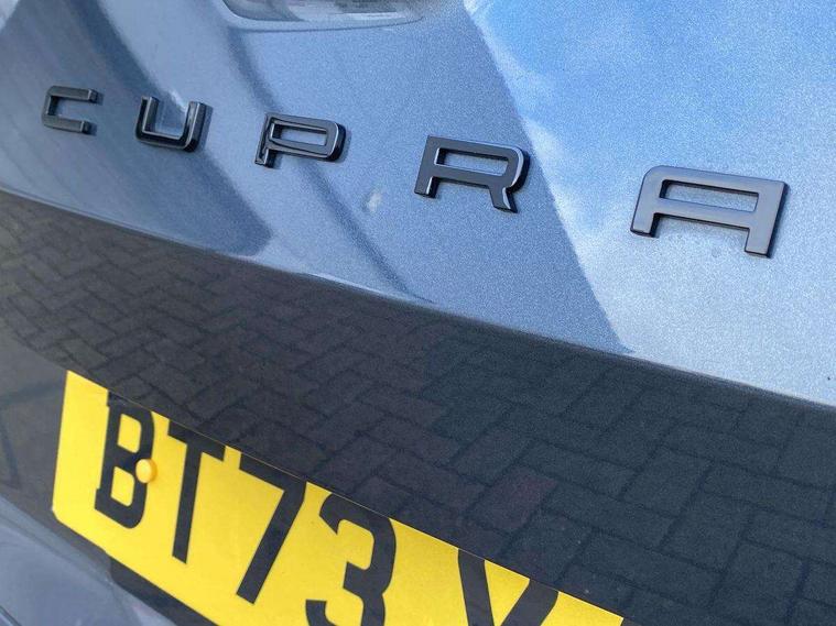 Digital cockpit and configurable dashboard, Driver alert system, Dynamic chassis control with driving profile selection (Comfort, Sport, CUPRA, Individual), Forward collision warning with automatic braking, Lane assist, Navigation system with 12'' Touchscreen Display, Park assist (inc front/rear parking sensors), Predictive adaptive cruise control with speed limiter, RPM, trip computer, outside temp gauge, instrument light brightness, low fuel warning light, lights on reminder, gearshift indicator, Service interval indicator, Speed sensitive power steering, Start/stop system with regenerative braking, Virtual pedal and electric tailgate, Voice control system, Wired Android Auto, Wireless apple carplay, Wireless phone charger, 10 amp mode 2 charging cable, 16 amp mode 3 charging cable, 3.6 kw On-board charger, Electronic locking differential and dynamic traction support, Sports suspension with front shock absoption, 2 front and 2 rear USB type C sockets, Auxiliary input socket, DAB radio, Auto dimming rear view mirror, Body colour door handles, Body coloured bumpers, Dark grey wing mirror, Daytime running light with automatic headlight control and coming home feature, Dynamic headlight range control, Electric front/rear windows, Electrically adjustable heated and folding door mirrors with memory function, Front fog lamps with cornering function, Gloss black roof rails and window surrounds, LED Headlights, LED Taillights with dynamic indicator, Rain sensing wipers, Rear diffuser with twin exhaust pipe on each side with simulated exhausts, Rear side wing doors, Rear wash/wipe, Sports bumpers, Third brake light, Tinted rear windows, Welcome lights, 12v power supply in centre console, 12V socket, 12v socket in loadspace, 2 front and 2 rear reading lights, 230V socket, 3 seat bench in 2nd row, 60/40 split rear bench seat with armrest and mechanical seat release, Black headlining, Cupra sports pedals, Dust/pollen filter, Front and rear head restraints, Front centre armrest, Height/reach adjust steering wheel, Illuminated interior front door sills, Illuminated sunvisor with mirror, Isofix, Leather heated multi-function sports steering wheel with start stop, CUPRA mode button and gear shift paddles, Luggage tie-down hooks, Single front passenger seat, Three zone climate control with control panel in rear, Wraparound lighting, Genuine Nappa leather Pack - Cupra, Safety and driving pack (XL) - Formentor, 3 point seatbelts on all rear seats, ABS, Brake control system - ESC and brake booster, Child proof door locks, Driver and front passenger airbags with front passenger airbag de-activation, Electronic parking brake, Front and rear disc brakes, Front side curtain airbags, Hill hold control, Public e-call, Seat belt reminder for front and rear seats, Tyre pressure monitoring system, Anti theft alarm system, Keyless entry and start system (KESSY), Locking wheel bolts, Copper and aluminium interior detailing, 19" 'Exclusive' machined sport matte black and silver alloy wheels, Tyre repair kit,