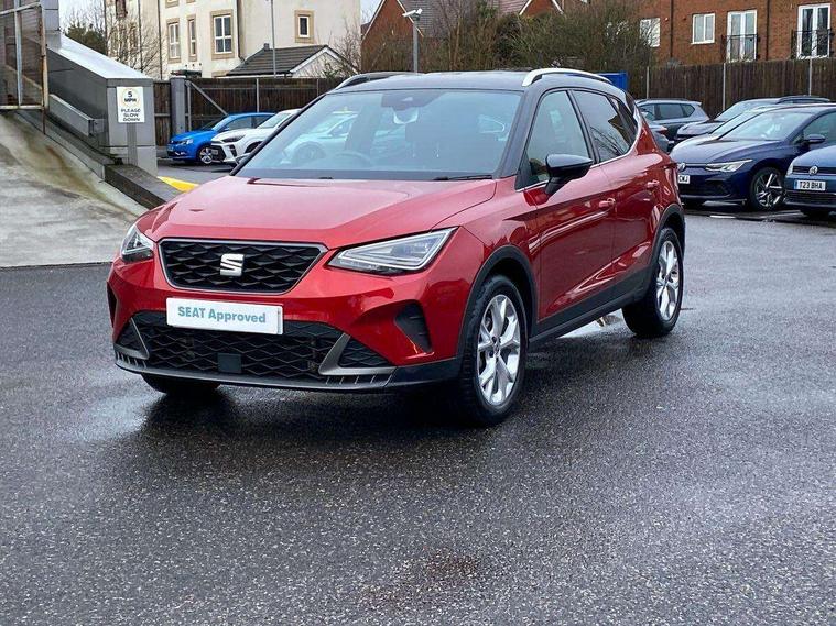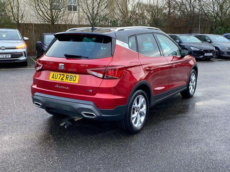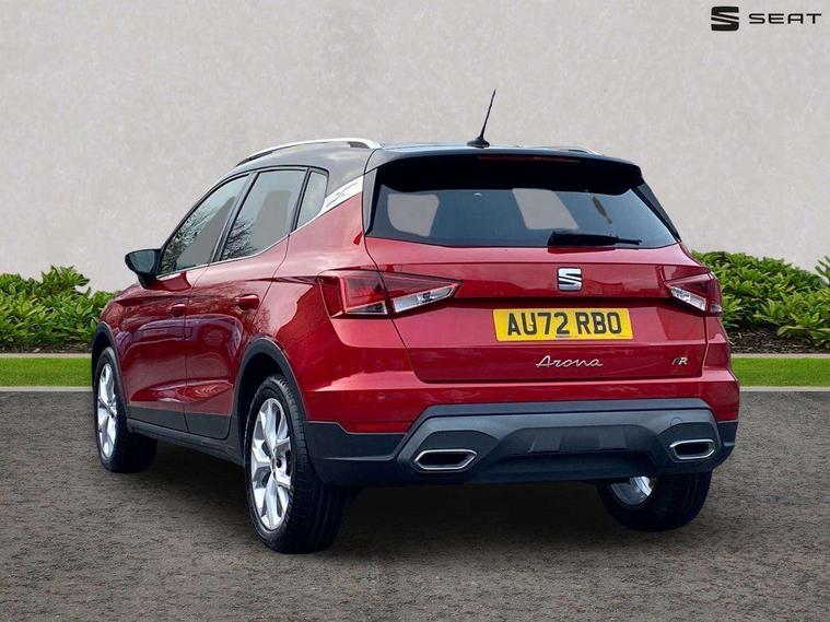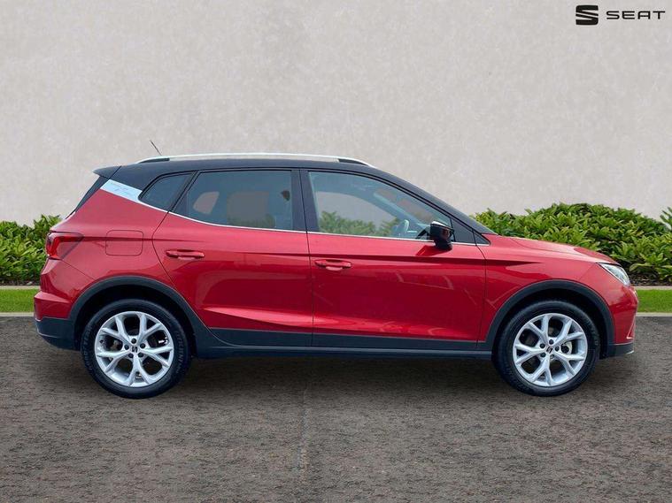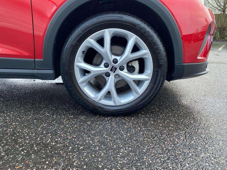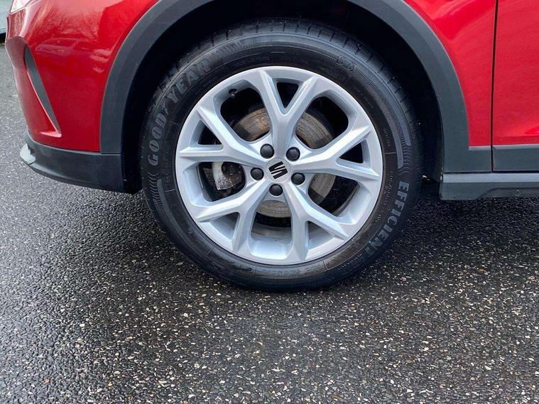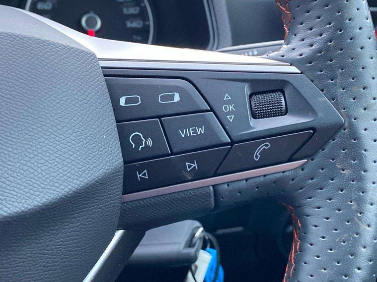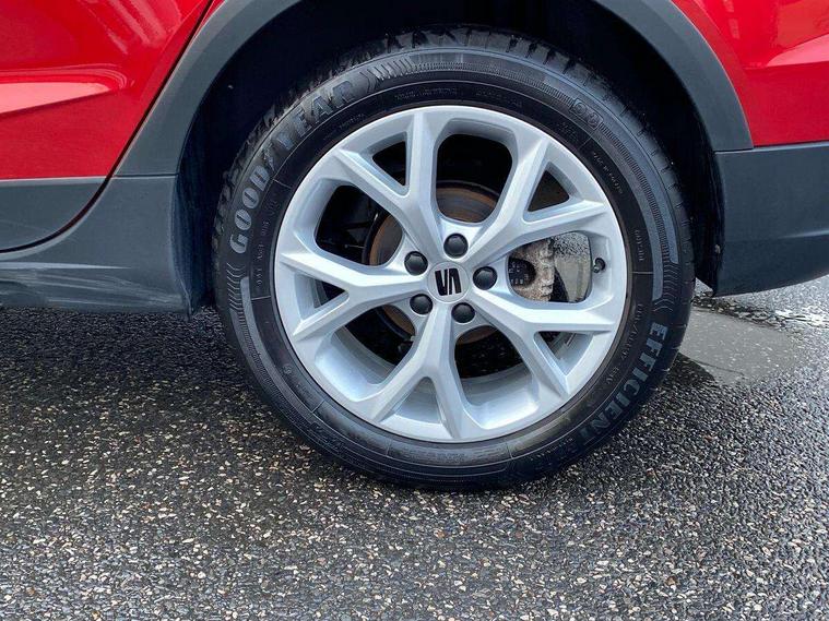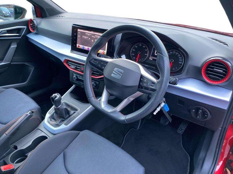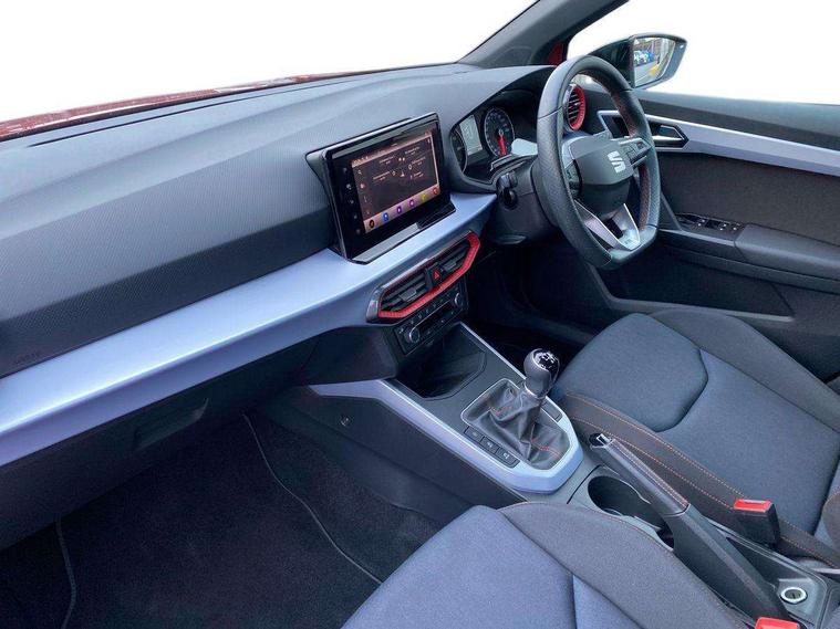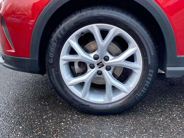 'Lights On' Reminder warning buzzer, 8" Digital cockpit, Digital clock, E-call, Electric speed sensitive power steering, Full Link Smartphone Integration with Mirror Link, Apple Car Play, Google Android Auto with USB Type C cable for Apple and Android compatibility, Lane keeping system, Low fuel warning light, Outside temperature display, Rear parking sensor, RPM counter, Seat connect with safety, service, remote and online, SEAT Drive profile - Four different models normal-sport-eco-individual, steering response, throttle response, Trip computer, Wireless phone charger, 9.2" colour touchscreen with navigation system, voice control and USB port (type c), Bluetooth interface for hands free and audio streaming, DAB digital radio and AM/FM radio, Steering wheel mounted audio controls, Anti theft roof antenna, Auto dimming interior rear view mirror, Automatic activation of hazard warning lights, Body coloured bumpers, Body coloured door handle inserts, Chrome roof rails and window surrounds, Dark tinted rear windows, Electric front/rear windows, Electrically adjustable, heated and folding door mirrors, Front fog lights with cornering function and rear fog light, FULL LED automatic headlights with dynamic headlight range control, coming and leaving home, LED daytime running lights, LED rear tail lights and licence plate lights, Protective side mouldings, Rain sensing wipers, Rear side wing doors, Rear spoiler, Rear window wash/wipe, Roof colour door mirrors, Third brake light, Twin exhaust pipe styling hidden exhaust pipe, Visible VIN plate, Windshield wiper with intermittent control and potentiometer, 2 cupholders, 3 seat bench in 2nd row, 60/40 split folding rear seat, Aircare filter, Black interior roof, Cloth upholstery, Double boot floor, Driver sunvisor with covered mirror + card holder, Dual zone climate control, Front courtesy light with 2x front and 2x rear reading lights, Front sport seats, Gear shift indicator, Height adjustable front seats, Height/reach adjustable steering column, Illuminated boot, Instrument lighting with brightness control, Interior ambient lighting, Interior light in footwell, central console and door panel, ISOFIX points in outer rear seats with top tether anchorage points, Passenger sunvisor with vanity mirror, Perforated flat bottomed leather steering wheel/gear knob/handbrake with red stitching and FR logo, Single front passenger seat, Two front and three rear height adjustable headrests, Interior chrome pack - Arona, 3 point seatbelts on all rear seats, ABS, Active front headrests, Child locks on rear doors, Driver and front passenger airbags with front passenger airbag de activation, front side and curtain airbags, Electronic stability control, Emergency Brake Assist (EBA) and front assist, Front and rear seatbelt reminder, Hill hold control, Multi-Collision braking, Tiredness recognition system, Traction control, Tyre pressure monitoring system, Alarm with back-up horn, Electronic engine immobiliser, Locking wheel bolts, Remote central locking + deadlocks, Tow away protection, Titan black dashboard, 17" Dynamic alloy wheels,