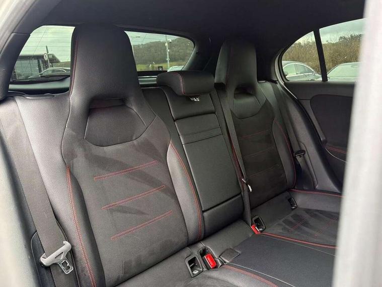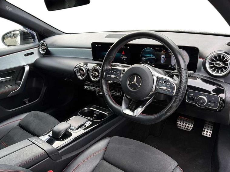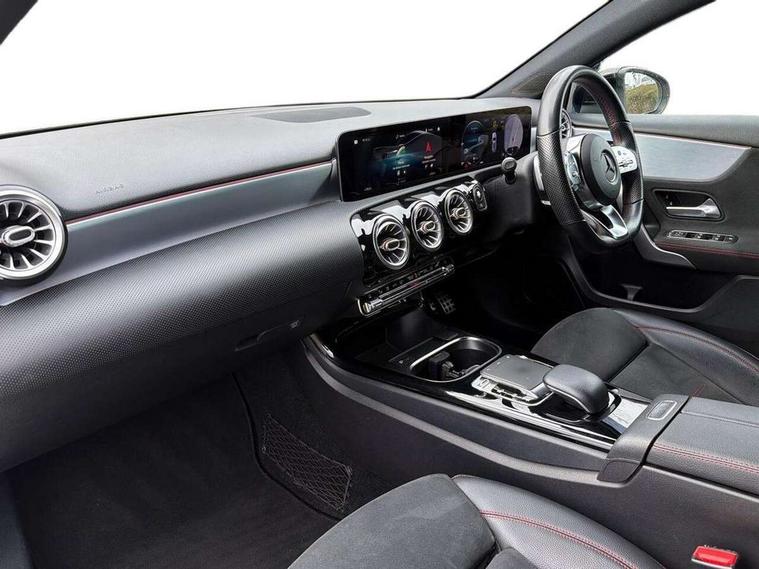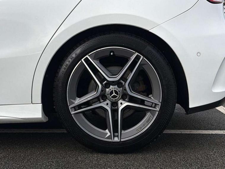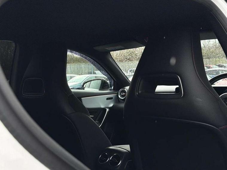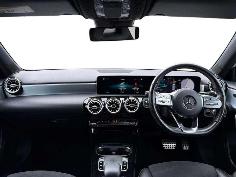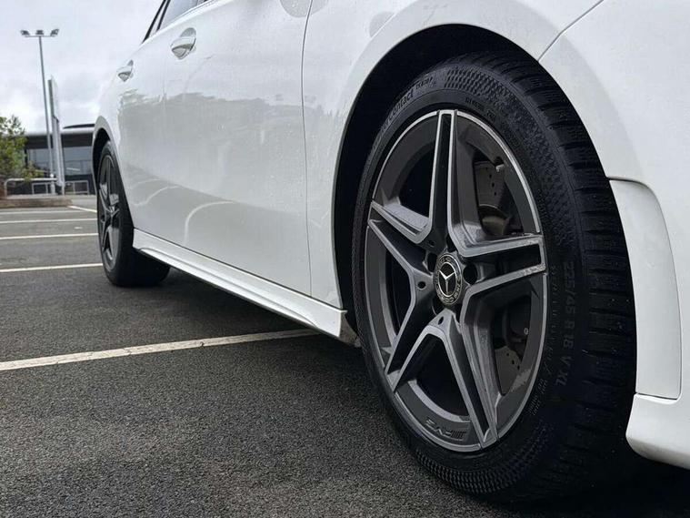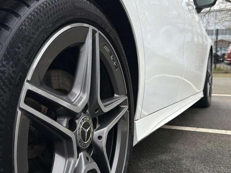 180 degree rear view camera with parking guidelines, 7" colour screen in instrument panel, 7" touchscreen media display, Active lane keep assist, Attention assist, Brake pad wear indicator warning light, Cruise control + speed limiter, Direct steering, DYNAMIC SELECT with a choice of driving modes (ECO, Comfort, Sport and Individual), Fluid level warning indicator for fuel, oil, coolant and washer fluid, Hard-disk navigation, Lamp failure indicator, Mercedes me connect including emergency call system, accident recovery, breakdown and maintenance management, Outside temperature gauge, Radio aerial integrated into roof spoiler, Service indicator (ASSYST), Speed sensitive power steering, Stop/start system, Trip computer, Voice activation, Lowered sports suspension, DAB Digital radio, Dual bluetooth interface, 2 USB ports (type C), MBUX multimedia system with DAB digital radio and touchpad including satellite navigation, Adaptive brake lights, AMG front, rear apron and side skirts, Body colour bumpers, Body colour door handles, Body colour side skirt, Body coloured door mirrors, Chrome beltline trim, Diamond radiator grille with chrome pins and silver louvre + chrome insert, Electric adjustable and heated door mirrors with integrated LED side indicators, Electric front windows, Electric rear windows, Exhaust system - Twin trapezoidal tailpipes in polished stainless steel, Headlamp assist automatic headlamp activation, Heated glass rear windscreen + timer control, LED high performance headlamps with integrated LED daytime running lights, LED tail lamp, LED third brake light, Rain sensor windscreen wipers, Rear fog lights, Rear wiper, 1/3 to 2/3 split folding rear seats, 12V socket, 3 Spoke flat bottom leather multi function steering wheel with perforated leather in grip area, Air vents surround and cruciform nozzle in silver chrome, AMG floor mats with red stitching, Artico man-made leather/Microfibre Dinamica upholstery with red contrast stitching, Auto Mercedes-Benz child seat recognition sensor, Black roof lining, Brushed stainless steel sports pedals with rubber studs, Controller on centre console with chrome surround, Cup holder and stowage compartment lighting, Exit lights, Front centre armrest with storage compartment, Front door sills with Mercedes Benz lettering, Front doors with ambient and signal light, Front footwell lights, Front reading lamps, Front seat backs luggage nets, Front seat cushion length adjustment, Front signal exit lamp, Front vanity lights, Gearshift paddles on steering wheel, Handle recess/closing light, Height/reach adjustable steering column, Illuminated glovebox, ISOFIX Child seat top tethers and anchor fixings, Load securing rings in luggage compartment, Luggage compartment cover, Manual height adjustable front seats, Oddments tray lighting, Rear head restraints, Rear Reading Lamps, Seat occupancy sensor for front passenger seat, Sports seats with integrated headrests, Storage compartment under load area floor, Sunvisors with illuminated vanity mirrors, Touchpad, Touchpad illumination, Twin front cupholders, Two zone thermotronic luxury automatic climate control, Seat comfort pack - A Class, 3 rear 3 point seatbelts, ABS with Brake Assist, Active bonnet, Active brake assist includes forward collision warning system with autonomous braking, Adaptive brake assist with hold function and hill start assist, Brake calipers with Mercedes-Benz lettering + perforated brake discs, Childproof locks manually operated for rear doors and electrically operated for rear power windows, Crash responsive emergency lighting, Driver and passenger head and side airbags, Drivers knee airbag, Dual stage driver/passenger airbags, Electronic parking brake, ESP curve dynamic assist, ESP with ASR, Front and rear seatbelt reminder, Tyre pressure monitoring system, Warning triangle and first aid kit, Window airbags, Alarm system/interior protection/immobiliser, Keyless Go, Remote central locking and crash sensor with emergency opening function, Chrome air vent surrounds, 18" AMG 5 twin spoke light alloy wheels in titanium grey with highsheen finish, Tirefit sealant kit,