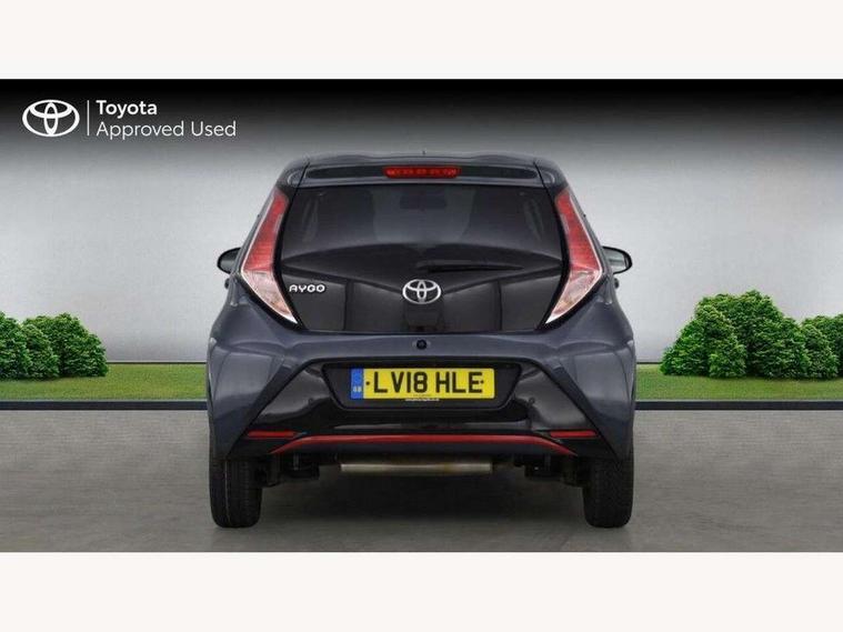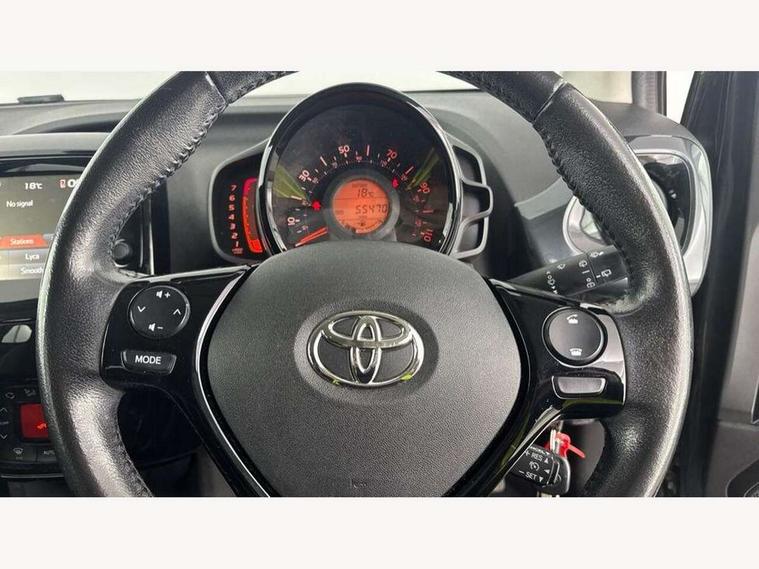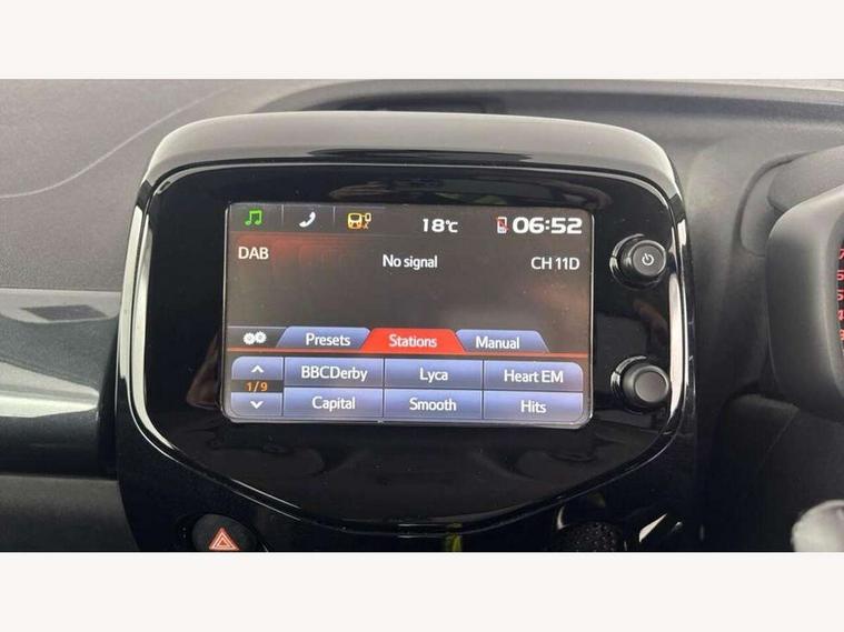 7" touch screen, Bluetooth system, Digital clock, Electric power steering, Fuel indicator with low level warning, Lights on warning, MirrorLink, Rear view camera, Speed limiter, Tachometer, Vehicle Stability Control (VSC), 4 speakers, Auxiliary input socket, DAB Digital radio, Multimedia System, Stereo radio, USB connection, 2 speed wipers/variable intermittent/mist function, Automatic headlights, Body colour bumpers, Body colour door handles, Body colour door mirrors, Electric adjustable door mirrors, Electric front windows, Front fog lights, Green tinted glass, Headlamp levelling, Heated door mirrors, Heated rear windscreen, LED daytime running lights, Privacy glass, Rear spoiler, Rear window demister, Rear wiper, Red front bumper accent, Red roof decal, Red side sills, Roof mounted aerial, 12V Accessory socket, 3 spoke leather steering wheel, 50/50 split folding rear seat, Air recirculation system, Auto air conditioning, Body colour instrument panel, Centre console storage, Chrome insert to gearknob, Chrome interior door handles, Driver and passenger sunvisors, Driver's seat height adjuster, Driver/passenger seat recline/slide adjust, Driver/passenger vanity mirrors with covers, Front and rear door pockets, Front cupholder, Front map reading lights, Front sports seats, Gleam cloth upholstery, Glossy black gear shift surround, Glovebox, Height adjustable front head restraints, Isofix system on outer rear seats, Leather gear knob, Pollen filter, Rear cupholders, Rear headrests, Steering wheel mounted radio/phone controls, Stepless tilt adjustable steering column, Storage bins on all doors, Tonneau cover, Outburst pack red pop - Aygo, ABS, Driver and passenger airbags, ESP, Fasten seatbelt reminder, Front side airbags, Height adjustable front seatbelts with pre-tensioners and load limiters, Hill start assist, Passenger airbag deactivate switch, Rear child proof door locks, Side curtain airbags, Tyre pressure warning, Engine immobiliser, Lockable fuel cap, Remote central locking, Body colour dashboard, Gloss black air vent surround, Gloss black centre console, Tyre repair kit,