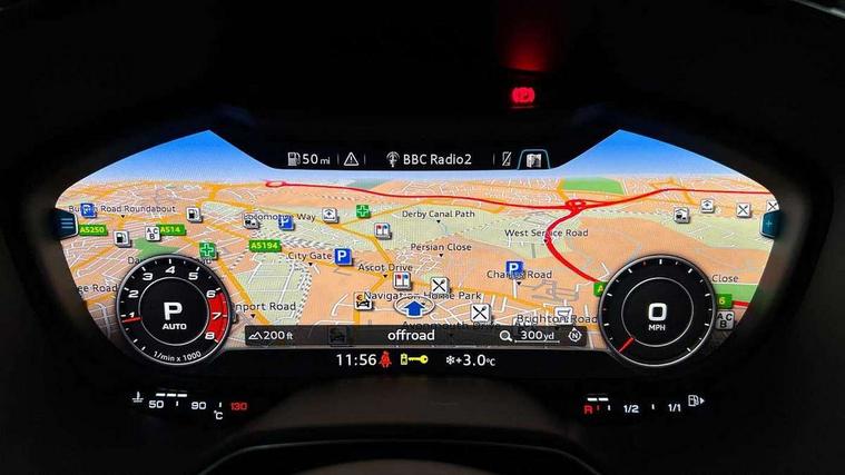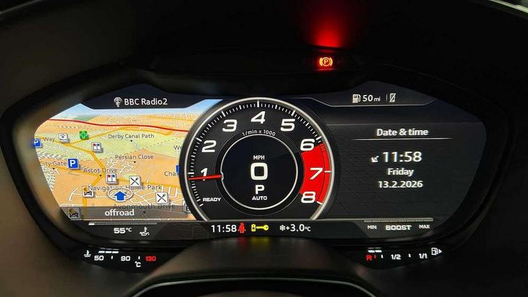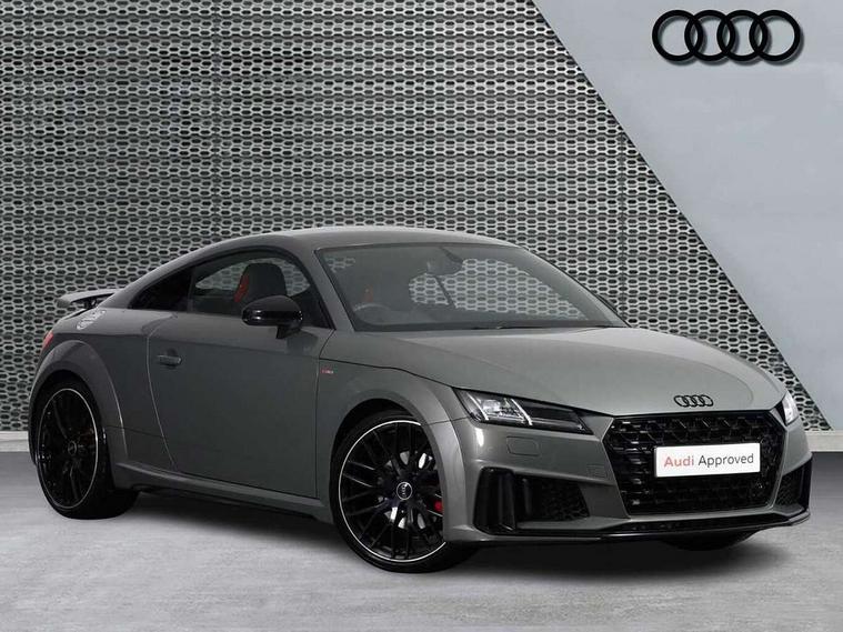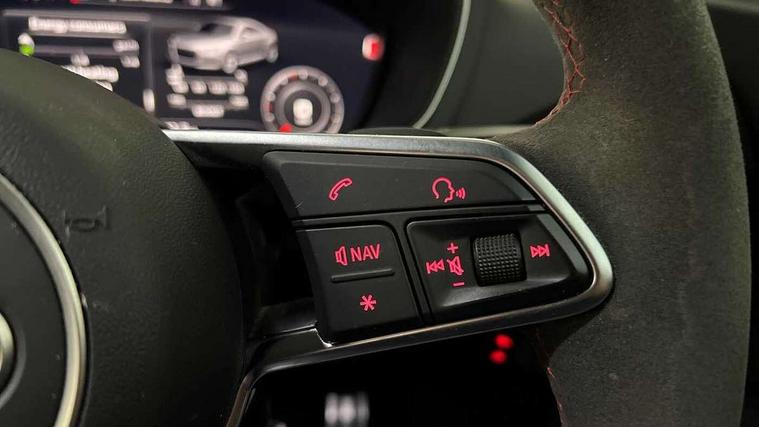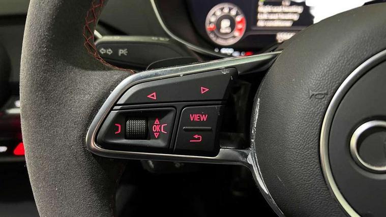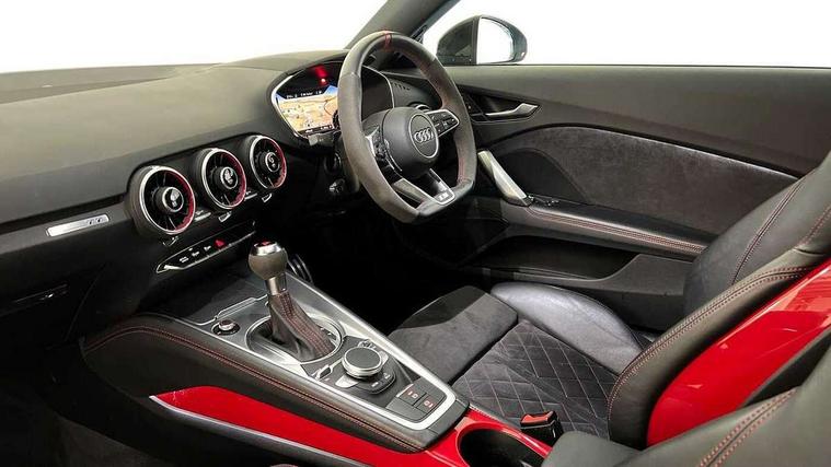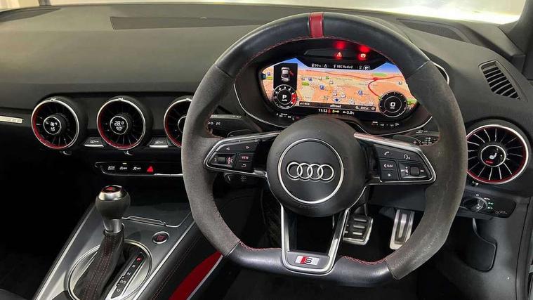 Audi drive select with 4 Pre configured modes, Audi smartphone interface, Audi virtual cockpit - 12.3" high-resolution LCD display with fully customisable instrument cluster, Cruise control + speed limiter, Emergency call service, Mobile phone preparation with bluetooth interface, Progressive power assisted steering, Rear parking sensors, Service interval indicator, Start/Stop system with energy recuperation, TP memo, Sports suspension, 8 Speakers, AM/FM radio, Bluetooth audio streaming, DAB Digital radio, Audi Beam uses LEDs to project the Audi Sport logo, Audi rings decals, Auto dimming rear view mirror, Auto headlight range control, Black chrome tailpipe, Black door mirrors, Dark privacy glass from B-pillar backwards, Electric folding door mirrors, Electric front windows, Electrically adjustable and heated door mirrors with integrated LED side indicators, Heat insulating glass in windshield, Heat reflecting windows, LED 3rd brake light, LED daytime running lights, LED headlights with LED rear lights + dynamic rear indicators, Light and rain sensors, Rear boot, 12V socket, 2 rear seats, 3 spoke flat bottomed high multi-function leather sport steering wheel with gearshift paddles, 4 way electric lumbar support for driver and front passenger, Alcantara leather with 12o'clock marker and express red contrast stitching in steering wheel, Alcantara/leather upholstery with S embossing + contrasting express red stitching on upholstery, Steering wheel and gear knob gaiter, Black headlining, Door sill trims, Extended aluminium look with stainless steel pedals, Front centre armrest, Front passenger seat, Front super sports seats, Heated front seats, Integrated head restraints, ISOFIX child seat mounting for front passenger seat with airbag deactivation, Manual adjustment of seat height, fore/aft position, seat angle, seat depth and backrest angle, Rear head restraints, Rear top tether child seat ISOFIX attachment, Red piped floor mats, Split folding rear seat, Black styling package - TT, Leather pack - TT, LED interior light pack - TT/TTS, Non smoking pack - TT/TT RS, Technology pack without Audi phone box - TT, 3 point front seat belts, ABS, ASR traction control, Curtain airbags, Driver and front passenger airbag with front passenger airbag deactivation, EDL traction control, Electromechanical parking brake, ESP, First aid kit, Front side airbags, Head airbags, Hill hold assist, Red brake callipers, Seatbelt warning, Tyre pressure loss indicator, Warning triangle, Anti theft alarm, Anti theft wheel bolts, Immobiliser, Keyless Go, Remote central locking, Matt brushed aluminium inlays, Tool kit, Tyre repair kit,