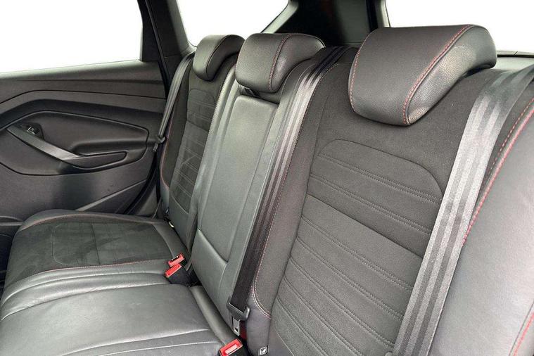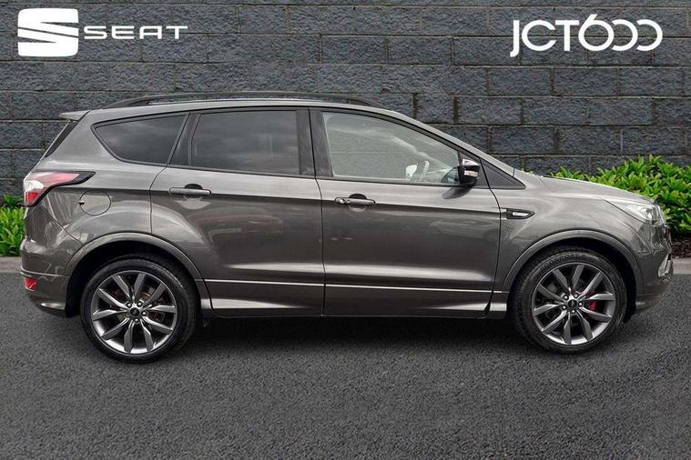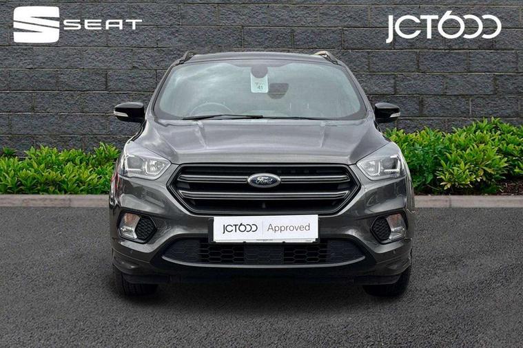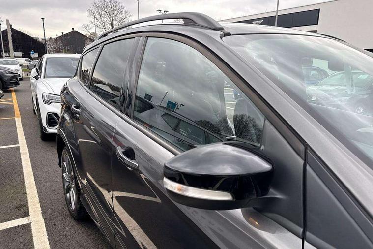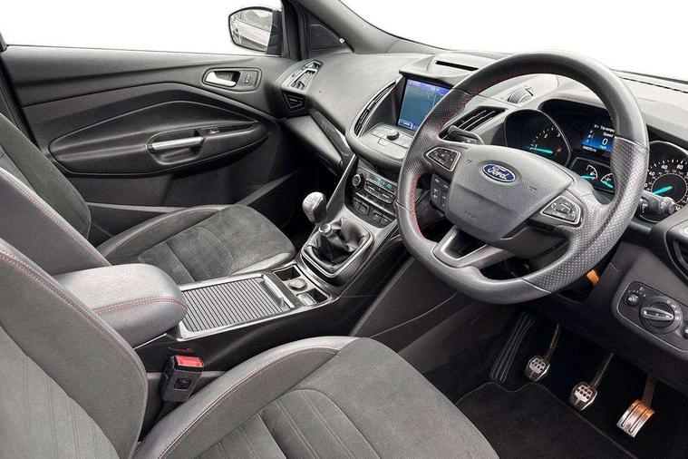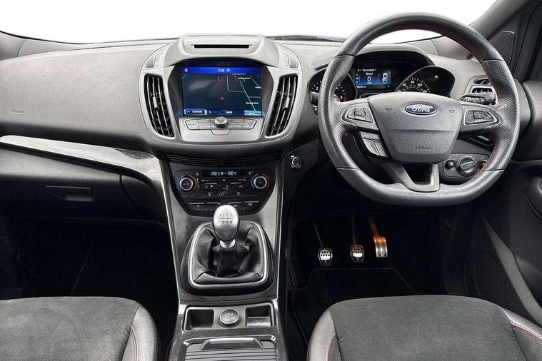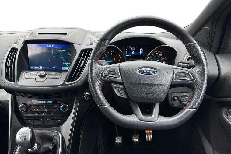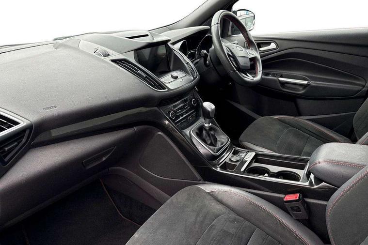 Apple car play/Android Auto, Enhanced active park assist including perpendicular parking pull out assist, flank guard and front/rear parking sensor, EPAS, Hands free telephone, Trip computer, Sports suspension, 2 USB ports, Auxiliary socket for external device, Remote audio controls on steering wheel, Auto dimming rear view mirror, Black mirror caps, Body colour bumpers, Body styling kit - Body colour front/rear/side skirts, door claddings, wheel arches, high gloss black rear mesh, silver skid plate and rear diffuser, Electrically operated and heated door mirrors with side indicators, Electrically operated front and rear windows with global closing, Front fog lights, Front scuff plate, Large rear spoiler, Power folding door mirrors, Power opening panoramic glass sunroof, Quickclear heated windscreen, Rain sensing wipers, Tailgate wash/wipe, Twin exhaust pipes, 6 way manually adjustable passenger seat with lumbar support, 60/40 split/folding rear back and cushion, Alloy Foot Pedals, Auxiliary power socket in luggage area, Centre console with stowage tray/bottle holder/CD stowage/front and rear 12V power point, Dark headliner, Driver/passenger front seatback pockets, Dual electronic automatic temperature control, Flat bottomed leather steering wheel with red stitching + gear knob, Floor mats with red stitching, Folding rear centre armrest, Footwell courtesy lights front and rear, Front head restraints, Front overhead courtesy lights with theatre style dimming and delay, Front/rear reading lights, Isofix system on outer rear seats, Multi-colour ambient interior lighting, Part leather upholstery, Reach + rake adjustable steering column, Rear head restraints, Sports style front seats, Stowage unit in upper instrument panel, Tie down hooks, Tonneau cover, Variable intensity instrument illumination, Appearance pack - Kuga/ST-Line, 3 point seatbelts on all 3 rear seats, ABS/EBD, Airbags - front driver/passenger, front & rear side, curtain, drivers knee, EBA, Electric traction assist system, Electronic Stability Programme, Front passenger airbag deactivation switch, Hill start assist, Intelligent all wheel drive system - Active Driveline, Intelligent Protection System (IPS), Red brake calipers, Tyre pressure monitoring system, Engine immobiliser, Keyless entry, Keyless start with 'Ford Power' starter button, Locking wheel nuts, MyKey system, Remote powered central double locking doors, Thatcham category 1 alarm, 19" 5x2 rock metallic alloy wheels, Mini steel spare wheel,