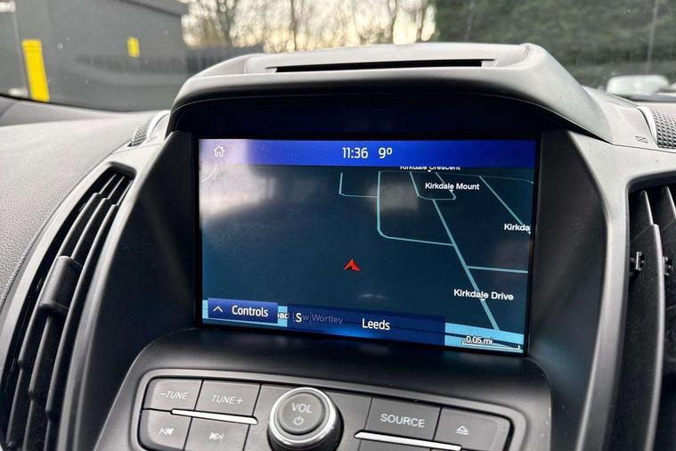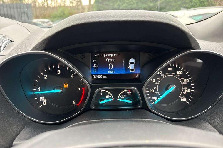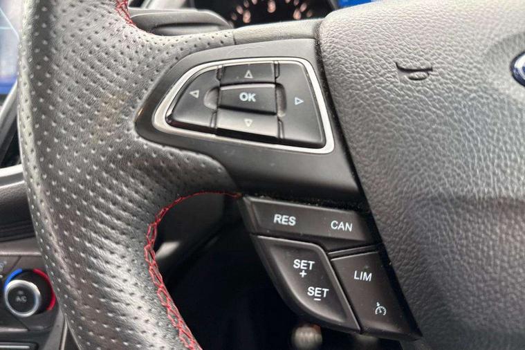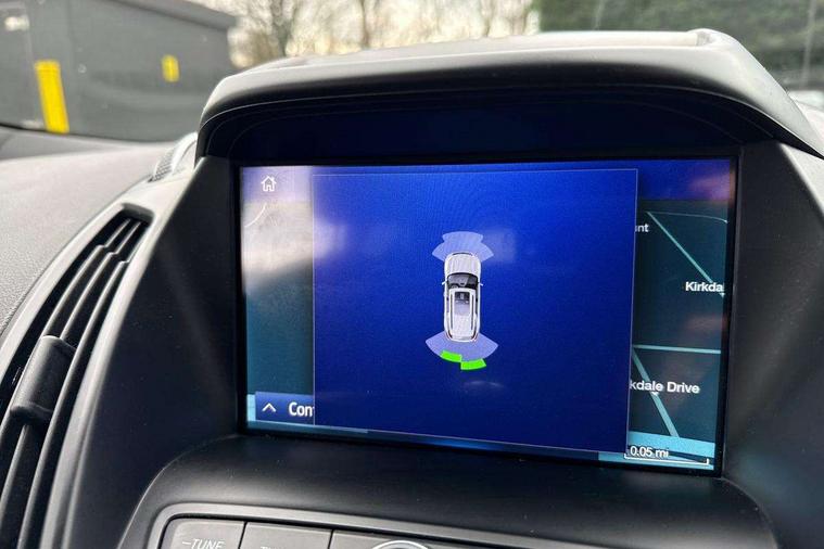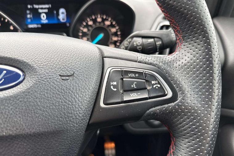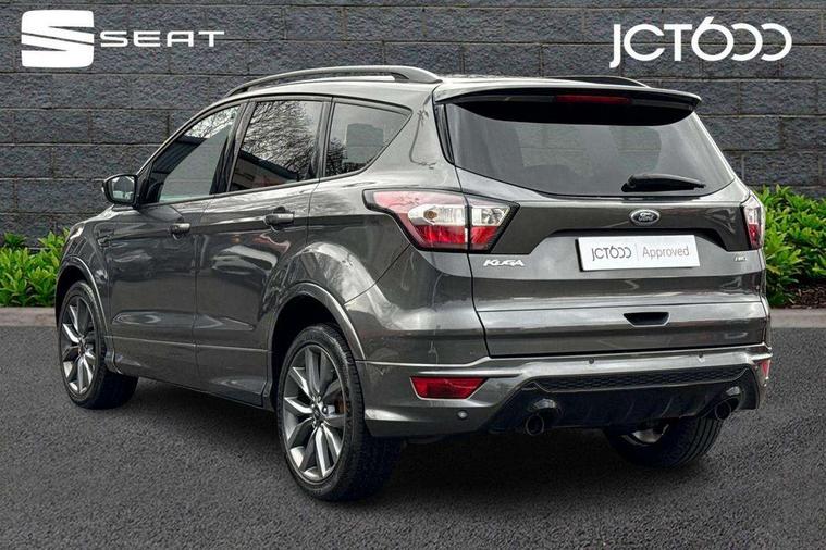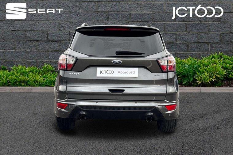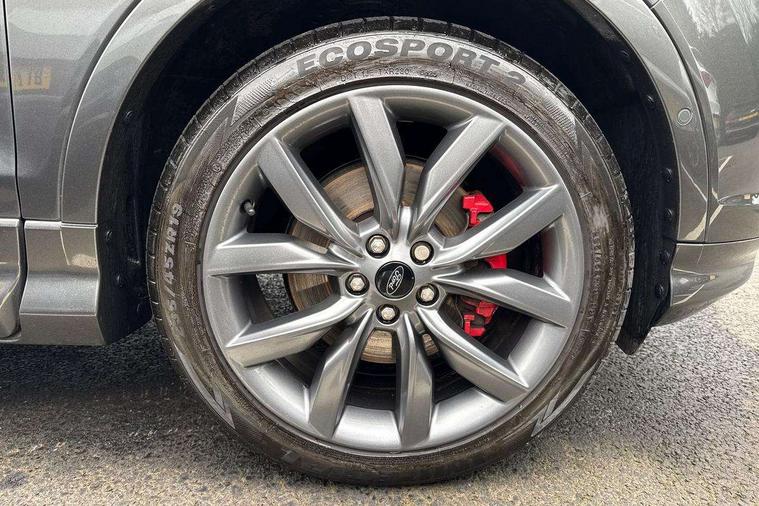 Apple car play/Android Auto, Enhanced active park assist including perpendicular parking pull out assist, flank guard and front/rear parking sensor, EPAS, Hands free telephone, Trip computer, Sports suspension, 2 USB ports, Auxiliary socket for external device, Remote audio controls on steering wheel, Auto dimming rear view mirror, Black mirror caps, Body colour bumpers, Body styling kit - Body colour front/rear/side skirts, door claddings, wheel arches, high gloss black rear mesh, silver skid plate and rear diffuser, Electrically operated and heated door mirrors with side indicators, Electrically operated front and rear windows with global closing, Front fog lights, Front scuff plate, Large rear spoiler, Power folding door mirrors, Power opening panoramic glass sunroof, Quickclear heated windscreen, Rain sensing wipers, Tailgate wash/wipe, Twin exhaust pipes, 6 way manually adjustable passenger seat with lumbar support, 60/40 split/folding rear back and cushion, Alloy Foot Pedals, Auxiliary power socket in luggage area, Centre console with stowage tray/bottle holder/CD stowage/front and rear 12V power point, Dark headliner, Driver/passenger front seatback pockets, Dual electronic automatic temperature control, Flat bottomed leather steering wheel with red stitching + gear knob, Floor mats with red stitching, Folding rear centre armrest, Footwell courtesy lights front and rear, Front head restraints, Front overhead courtesy lights with theatre style dimming and delay, Front/rear reading lights, Isofix system on outer rear seats, Multi-colour ambient interior lighting, Part leather upholstery, Reach + rake adjustable steering column, Rear head restraints, Sports style front seats, Stowage unit in upper instrument panel, Tie down hooks, Tonneau cover, Variable intensity instrument illumination, Appearance pack - Kuga/ST-Line, 3 point seatbelts on all 3 rear seats, ABS/EBD, Airbags - front driver/passenger, front & rear side, curtain, drivers knee, EBA, Electric traction assist system, Electronic Stability Programme, Front passenger airbag deactivation switch, Hill start assist, Intelligent all wheel drive system - Active Driveline, Intelligent Protection System (IPS), Red brake calipers, Tyre pressure monitoring system, Engine immobiliser, Keyless entry, Keyless start with 'Ford Power' starter button, Locking wheel nuts, MyKey system, Remote powered central double locking doors, Thatcham category 1 alarm, 19" 5x2 rock metallic alloy wheels, Mini steel spare wheel,