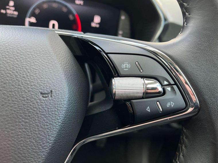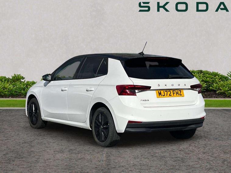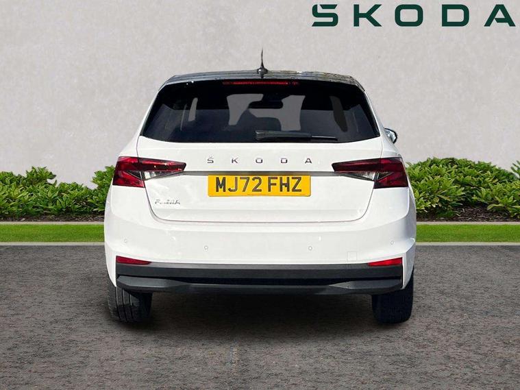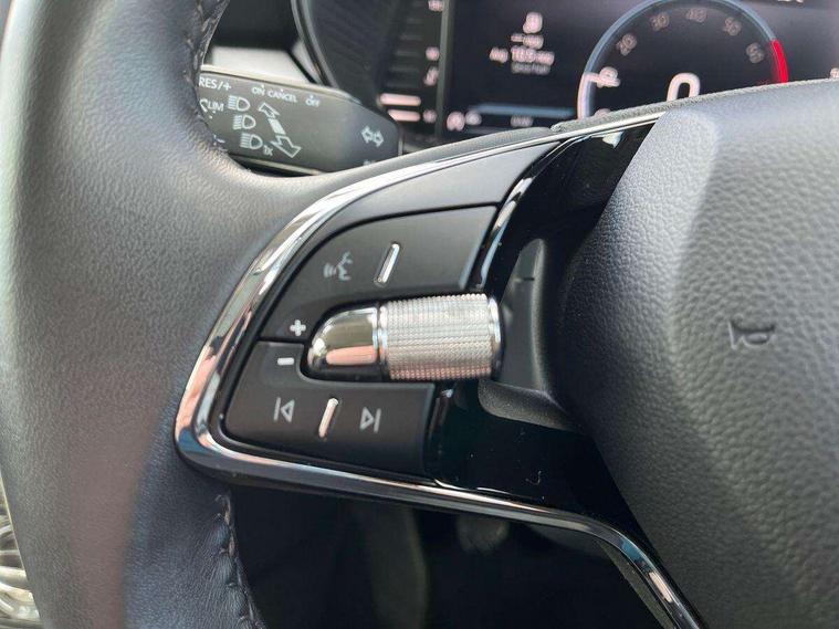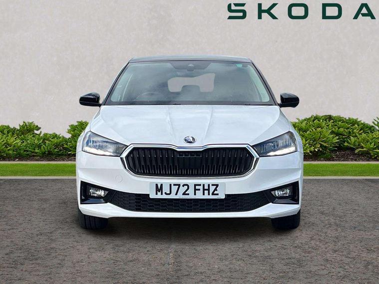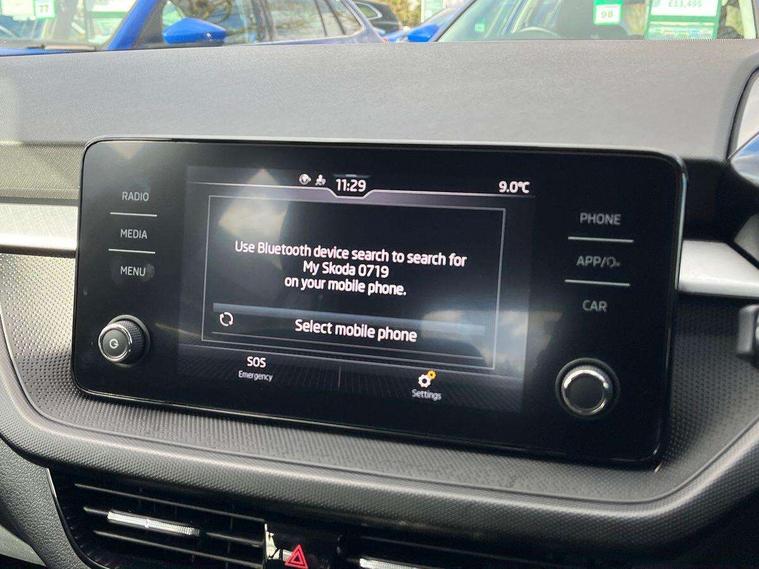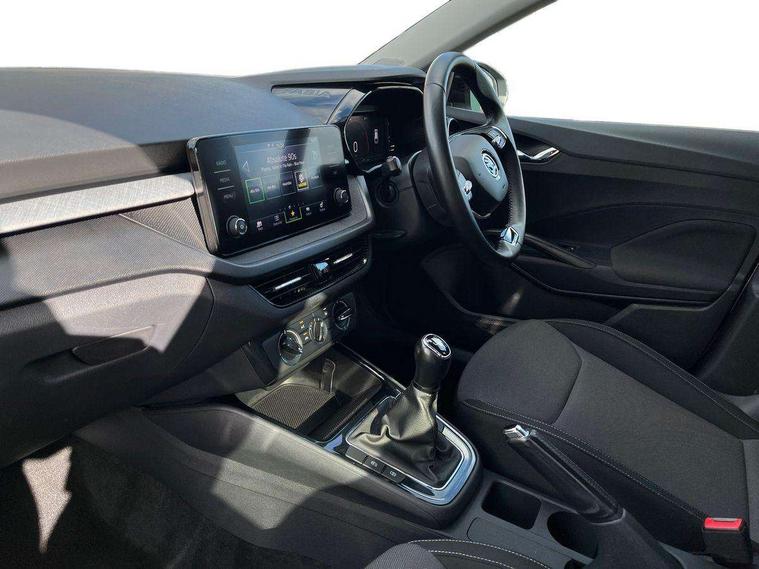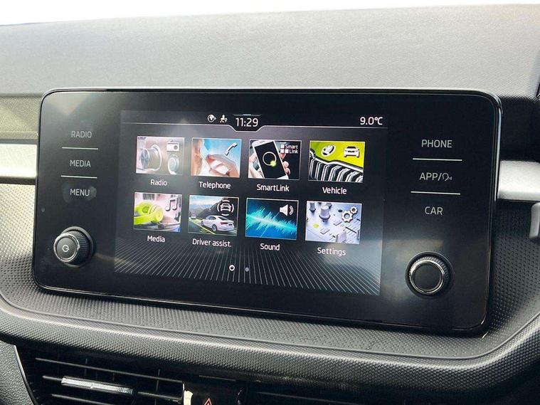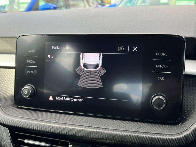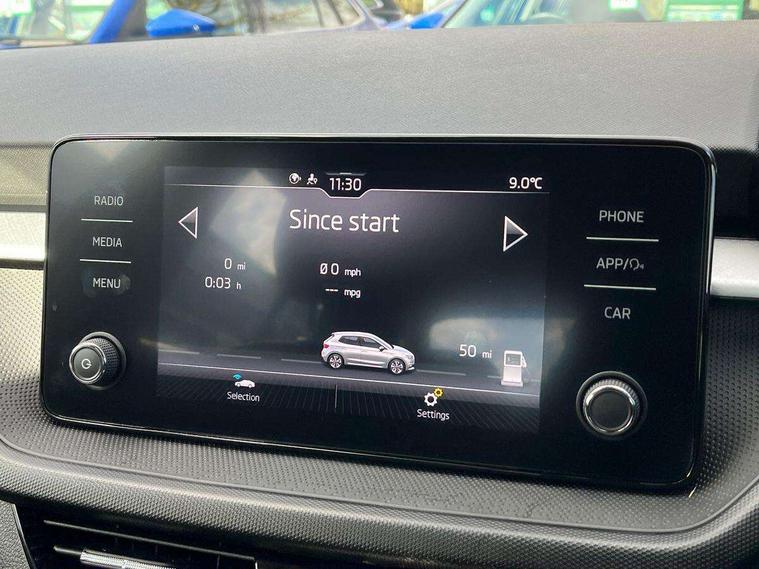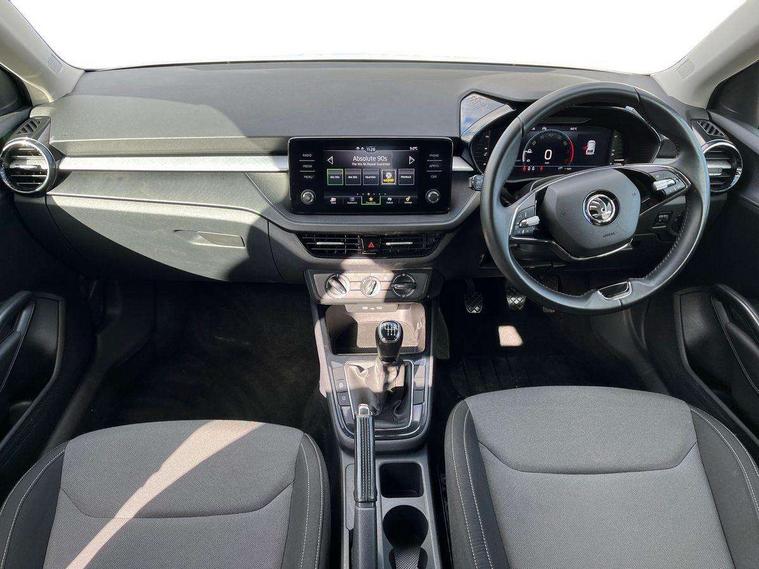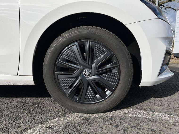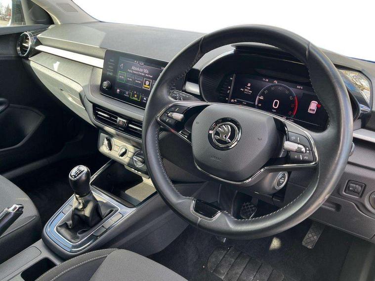 Bluetooth connection, Driver alert system - DAS, Electromechanical power steering, Exterior temperature gauge, Lane assist including road edge detection, Service interval indicator, Virtual cockpit with 10.25" colour display, 2x USB-C in the front (for data transmission and charging), 6 Speakers (4 in front and 2 in rear), Auxiliary socket for external MP3 player, Bolero radio with 8" colour display, DAB digital radio reception, Basic rear lights, Body coloured bumpers, Dimming rear view mirror with black frame, Door mirror integrated indicators, Electrically adjustable and heated door mirrors, Electrically adjustable front windows with function auto up/down, Front window wiper intermittent control, Headlight range control - Automatic, Ice scraper in fuel cap, LED daytime running lights with coming and leaving home feature, Mechanical adjustable rear windows, Privacy glass, Rear LED fog light, Rear side wing doors, Rear window wiper with washing nozzles, Roof mounted spoiler, SKODA tailgate lettering in chrome, Third brake light, 3 rear headrests, Backrest split and folding, Central console with fixed cup holder and storage box, Chrome handbrake release button, Fabric upholstery, Gearshift knob/handle in leather, Grain satin black interior door handles, Hand brake lever handle in leather, Height adjustable front headrests, Height adjustable steering wheel, ISOFIX and TopTether anchorage points to the outer rear seats, ISOFIX and TopTether on the front passenger seat, Luggage compartment lighting, Pollen filter, Rear seat bench unsplit, Single front passenger seat, Storm grey headlining, Sun visors with mirror and airbag label on passenger side, Ticket holder, Umbrella in drivers door, 3-point height adjustable front seats belts with pretensioner and force limiter, Automatic warning lights in case of crash, Driver and passengers airbag with switch off function, e-Call+, ESC including ABS, MSR, ASR, EDS, HBA and XDS, Front and rear seat belt warning, FRONT ASSIST (AEB City and AEB Inter Urban), Front side airbags, Head airbags, One tone horn, Pedestrian protection, Three rear 3-points safety seat belts with pretensioner and force limiter including stop function for outer rear seat belts, Tyre pressure monitoring system, Anti-theft alarm system including immobiliser, interior monitoring, backup horn, and towing protection, Anodized cross line upper decorative trim, Colour Edition air vents, Grain satin black central console cover, Grain satin black lower decorative trim, Satin black door and side trim panel in front, Anti-theft wheel bolts protection, Super-low rolling resistance tyres,