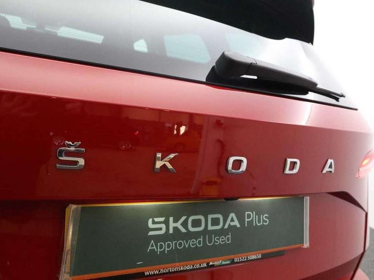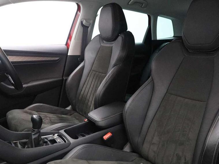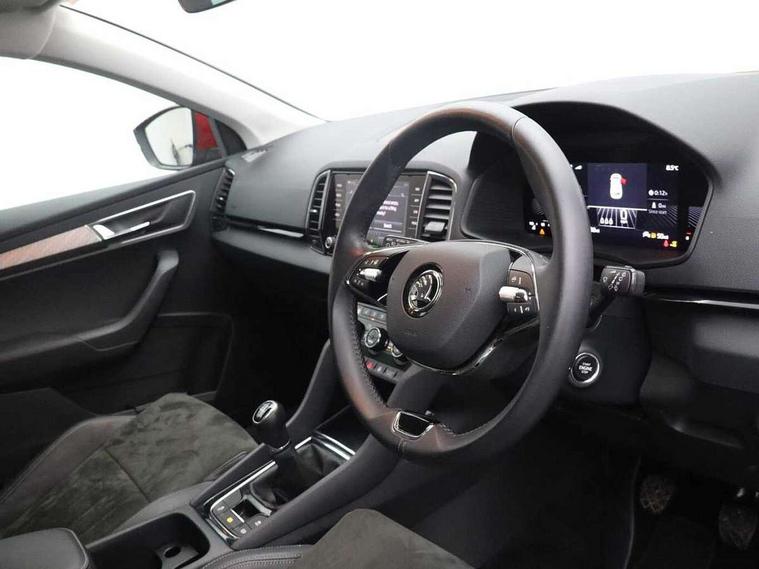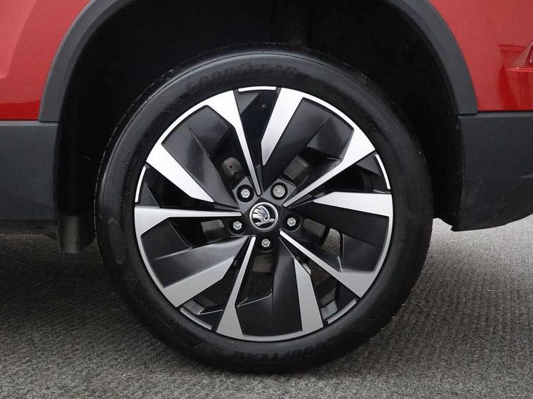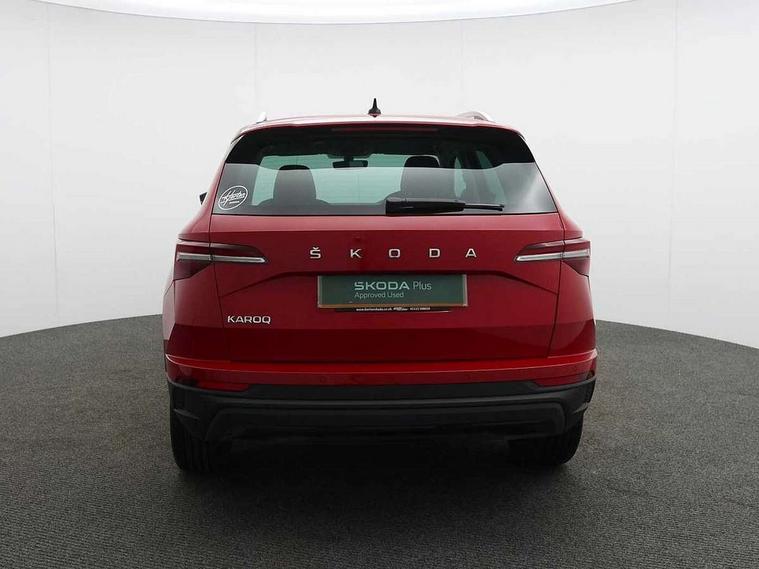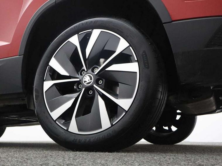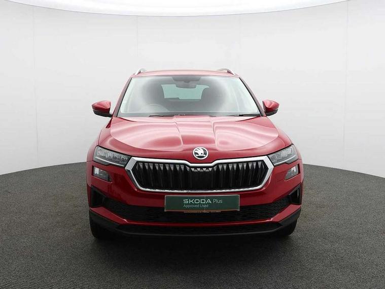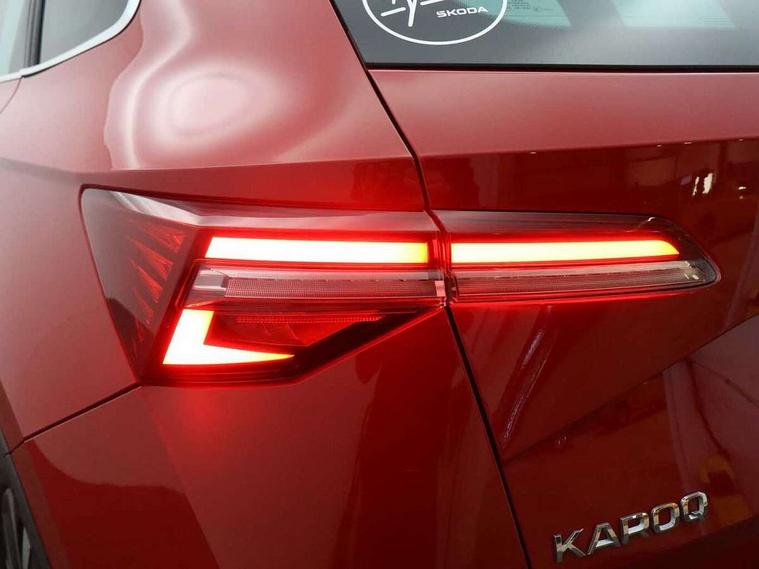 8" Digital display, Care connect, Drive mode selector, Driver fatigue sensor, Electro-mechanical PAS, Emergency services call system, Outside temperature gauge, Service interval indicator, SmartLink wireless for Apple and wired for Android, Start/stop system with regenerative braking, USB C Port x 2 in front centre console, 8 Speakers, DAB radio with Bluetooth, USB connection, Acoustic glass, Aero front windscreen wipers with intermittent function, Auto dimming rear view mirror with light and rain sensors, Black electric window control buttons, Body colour door mirrors and handles, Dynamic headlight range control with cornering light function, Electric front and rear windows with child proof lock, Heated rear windscreen, LED daytime running lights, LED rear lights with high functionality welcome effect and dynamic indicators, Light assistant (coming/leaving home/tunnel light), Plastic scuff plates, Privacy glass, Rear side wing doors, Rear spoiler, Rear window wiper with washer system and intermittent control, Safety reflectors on front doors, Third brake light, 1.5 litre bottle holders in driver and front passenger door panels, 12V socket in boot, 12v socket in front centre armrest with storage compartment and rear air vents, 2 Folding hooks and nets in boot, 2 spoke leather heated multifunction steering wheel, 2 x Tablet holder, 3 rear height adjustable headrests, 3 seat bench in 2nd row, 4 foldable roof handles with rear coat hooks, Black floor carpet, Chrome inner door handles, Decorative door sills with KAROQ badging, Double sided boot floor, Foldable hooks in the boot, Front head restraints, Height adjustable front three point seats belts with tensioners, Height/reach adjust steering wheel, Ice scraper, Illuminated glovebox, Illuminated luggage compartment, Isofix child seat preparation for front passenger seat, Isofix child seat preparation outer rear, Manual lumbar support for front seats, Pen holder, Pollen filter, Rear boot cover, Rear reading lights, Rubbish bin door, Safety vest holder, Single front passenger seat, Storage box in upper central dashboard closed, Sunvisors with illuminated vanity mirrors, Textile floor mats, Ticket holder, VarioFlex seats with standard rear seat release, Chrome roof rails + chrome pack - Karoq, Parking pack - Karoq, Automatic door unlocking in case of crash, Automatic fuel cut off in case of crash, Child locks on rear doors, Driver airbag, Electronic parking brake with auto hold function, Emergency rear braking signal, ESC including ABS, MSR, ASR, EDS, HBA, DSR, RBS, MKB and traction control, Front side airbags, Hill hold control, Knee airbags, Passenger airbag with switch-off function, Pedestrian monitor, Seatbelt reminder signalisation and pretensioner for all seats, Three point seatbelts rear, Two tone horn, Tyre pressure display, Tyre pressure monitor, Alarm with interior monitoring, back up horn and tilt sensor with safe function, Electronic engine immobiliser, Keyless entry and start/stop, Remote central locking with 2 remote folding keys, Chrome framed air vents, 18" Procyon silver alloy wheels with anthracite aero inserts, Anti-theft wheel bolts protection, Storage on wheel cover, Tool kit,