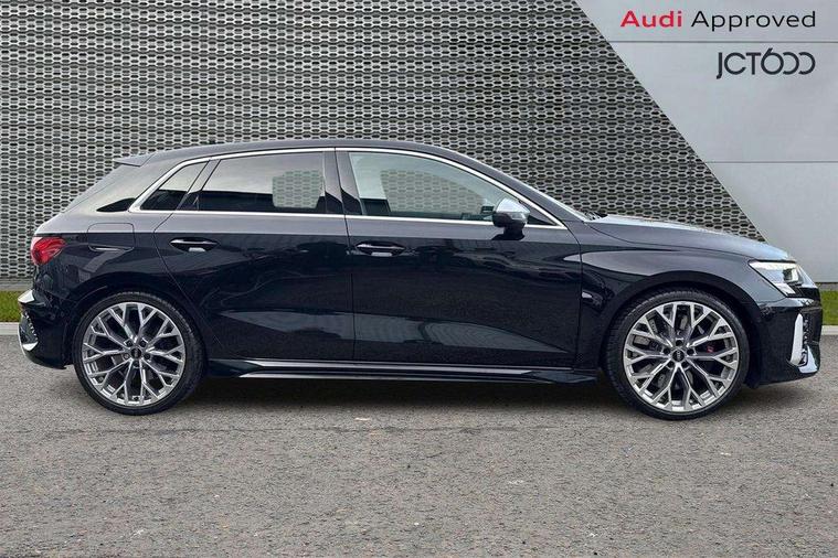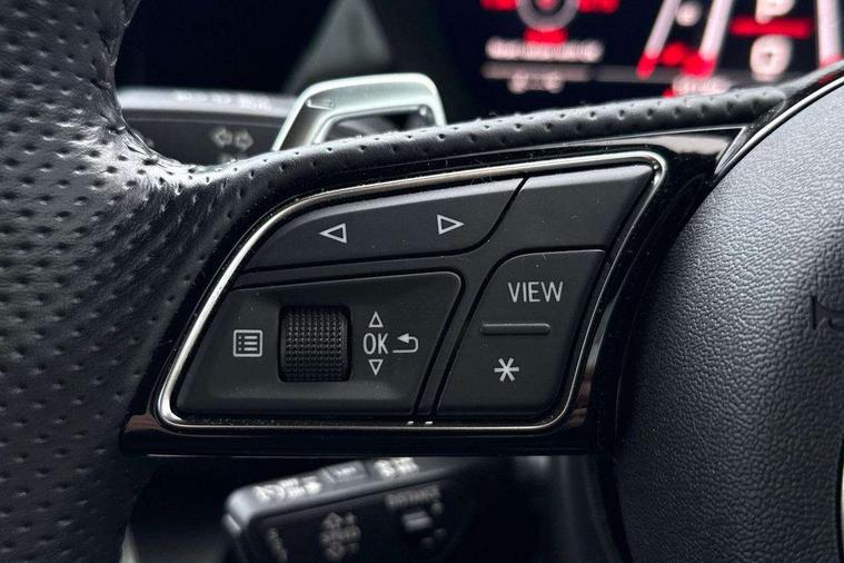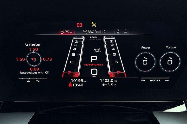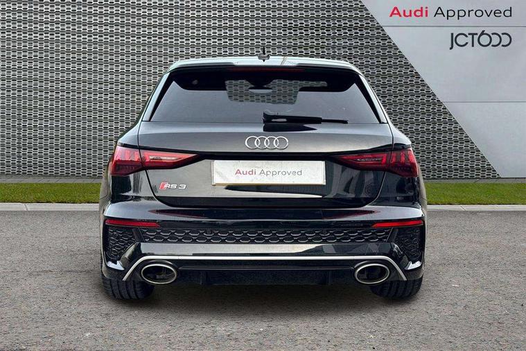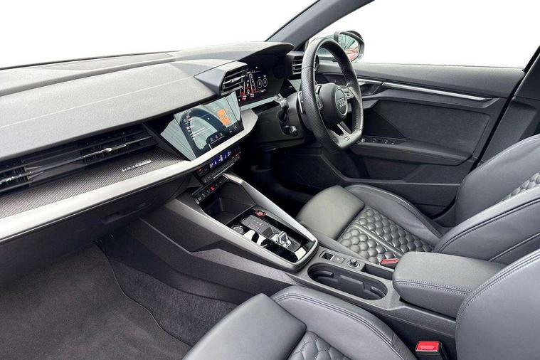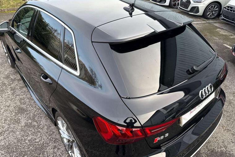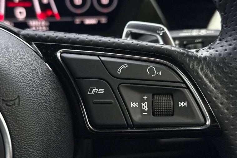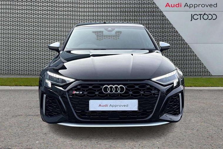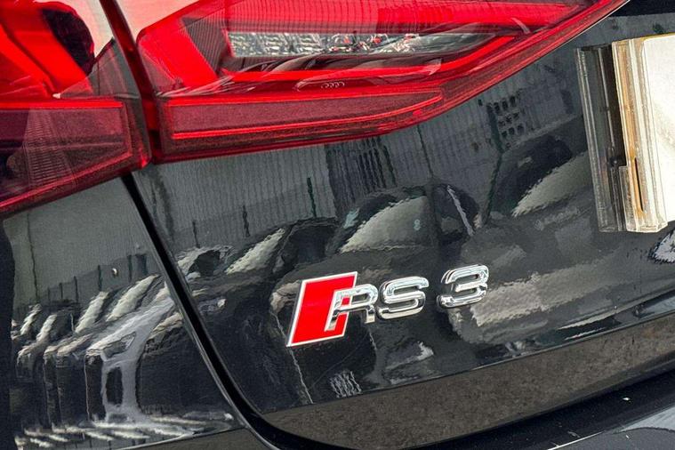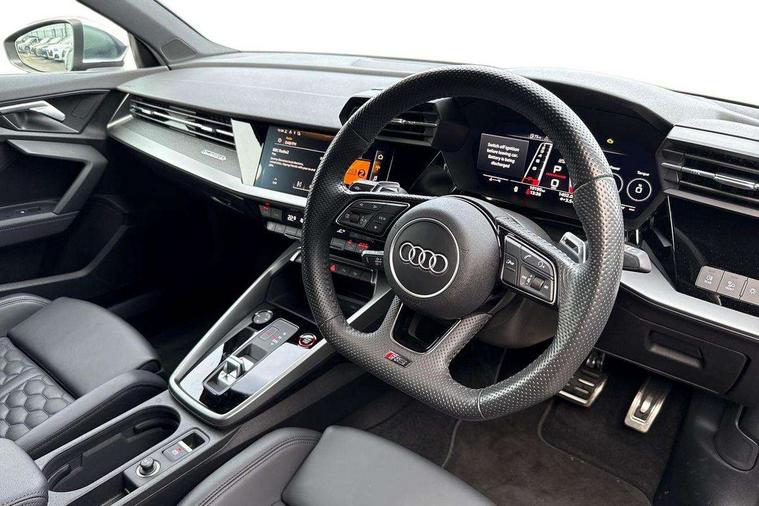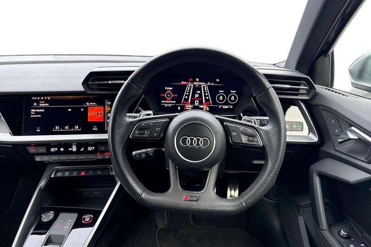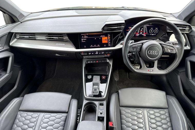 Audi connect emergency call and service, Audi smartphone interface, Audi virtual cockpit with RS specific display 12.3" full colour digital instrument cluster, Automatic start/stop system with recuperation, Bluetooth interface, Collision avoidance assistant, Lane departure warning system, Legal emergency call, Manual boot opening, Parking assist with parking system plus, Progressive power assisted steering, Quattro permanent four wheel drive, Rear suspension, Audi sound system impressive sound with 10 loudspeakers including centre speaker and subwoofer, 6-channel amplifier with a total output of 180 watts, DAB Digital radio, 3rd brake light, Acoustic glass windscreen, Audi beam uses LEDs to project the Audi sport logo onto the ground as you exit your RS 3, Auto dimming rear view mirror, Black side skirts, Body colour roof, Door mirrors - electrically adjustable, heated, folding and auto dimming on both sides, Headlight washers, LED headlights with LED rear lights + dynamic rear indicators, Light and rain sensors, Matt aluminium door mirrors, Matt aluminium window trims, Privacy glass - dark tinted rear and rear side windows from B-pillar backwards, Rear window wiper and washer system, 40/20/40 split folding rear seat bench, Black cloth headlining, Dual zone electronic climate control, Front and rear headrests, Front centre armrest, Front sports seats RS embossed logo, Front/rear floor mats, Heated front seats, Honeycomb stitching and RS embossing, Illuminated door sill trims inlays in aluminium with RS 3 logo, Manually adjustable front seats, RS emblems, Stainless steel pedals and front footrest in black, Aluminium interior elements pack - RS3, Ambient lighting pack - RS3, MMI navigation plus with MMI touch - RS3, RS bodystyling - RS3, Storage Pack - RS3, 3x3 point rear seat belts, ABS/EBD, ASR, Audi pre sense front, Driver/Front Passenger airbags, EDL, ESC - Electronic Stability Control + traction control, Front passenger airbag deactivation, Front side airbags with head airbags and interaction airbag, Hill hold assist, Seat belt reminder with passenger presence detection in rear, Tyre pressure loss indicator, Warning triangle and first aid kit, Anti theft alarm, Anti-theft wheel bolts, Electronically operated child lock, Remote control central locking, Carbon inlays, accent surfaces in the dashboard and centre console in platinum grey silk effect paint finish, 19" 10 Y spoke platinum grey, gloss turned finish alloy wheels, Tool kit, Tyre repair kit,