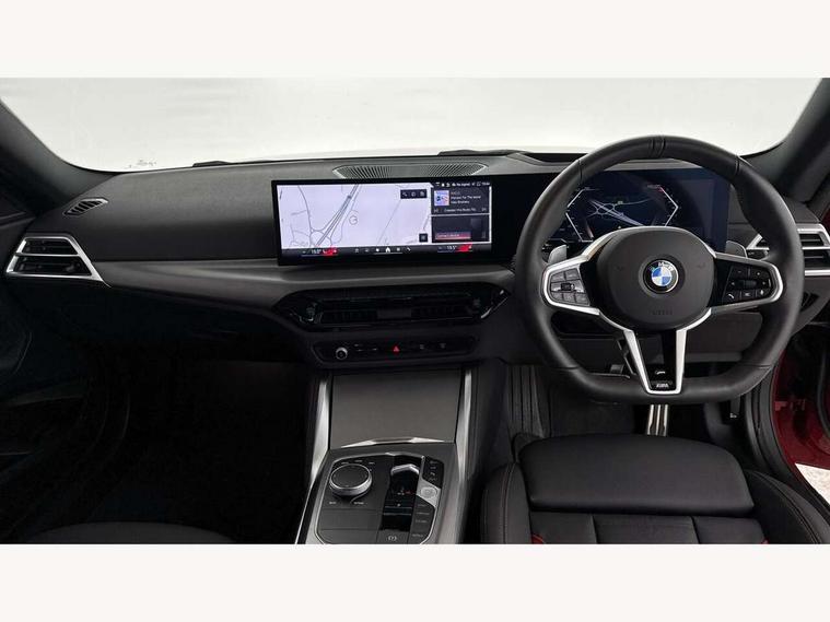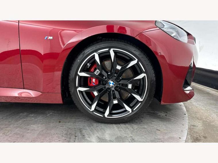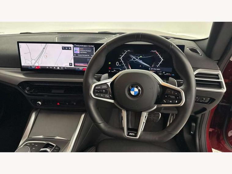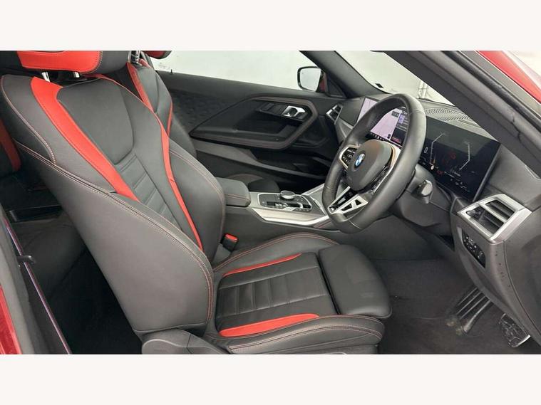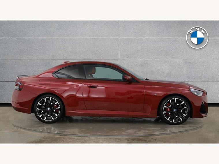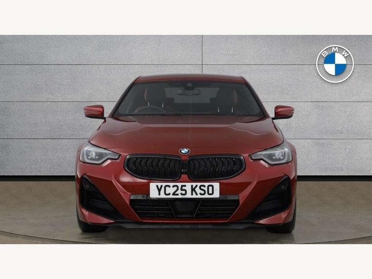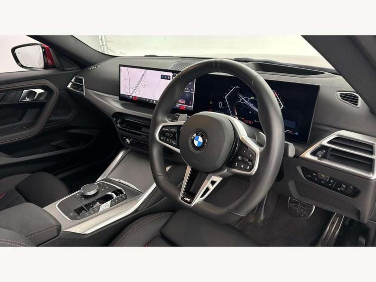 2 USB connections for charging and transferring data, Active guard plus, Attentiveness assist, Bluetooth with USB, BMW ConnectedDrive online services, BMW Intelligent Personal Assistant, BMW Live cockpit plus, BMW operating system 8 with variable, configurable widgets display information in real time, BMW Teleservices, Check Control warning system for monitoring of lights and door/luggage compartment open warning, Control Infotainment, Direct selection buttons, Drive off assistant, Eco pro mode, Electric power steering, eSim with 5G connectivity, Front and rear parking sensors, iDrive controller with turn and press function, Integrated owners handbook, Intelligent functions, Oil sensor for level and grade, Optimum shift indicator, Personal Profile, Smartphone integration, Touch operation on control display, Variable sport steering, Widescreen multi-media display, WiFi interface for wireless connection of mobile terminal devices, Aluminium lightweight construction, Balancer shaft, BMW TwinPower Turbo four-cylinder petrol engine, Double VANOS, Drive performance control with ECO PRO comfort + sport mode, Electronic differential lock, High precision injection, M sport suspension, Petrol Particulate Filter, Steptronic transmission with gearshift paddles, Twin scroll turbocharger with Valvetronic, DAB tuner, Acoustic windscreen wipers for reduced driving noise, Automatic windscreen wipers and automatic headlight, Body colour door handles flush with door surface, Body colour door mirrors, Body colour front and rear bumpers, Daytime running lights, Electric windows - front and rear, with open/close fingertip control and trap release, Exhaust tailpipes x2 - 90mm in left and right, Fading support, Front and rear bumper system with replaceable deformation elements, Front door sill finishers in black plastic with BMW designation, Front windscreen wipers with integrated washer jets, Green tinted heat protection glazing, High beam assistant, High gloss black sill, bumper trim sides and diffuser insert, High level third brake light, Indicators integrated int mirror housing, Interior rear-view mirror with automatic anti-dazzle function, LED registration plate light, LED technology rear tail lights, brake lights and turn indicators, Lightweight engineering, M high gloss shadowline, One piece kidney grille with hight gloss chrome surround, Rear boot, Rear fog lights, Reversing light in rear light cluster, Shark fin antenna, Single part LED rear lights with smoked glass components, Trailer stabilisation logic, Visible VIN plate, 12V power socket in front centre console with blanking plug, 2 cupholders in front centre console, 2 zone automatic air conditioning, Ambient lighting, Compartment in front of cupholder, Conditioned based service, English handbook, Folding rear seat head rests, Front and rear side armrests integrated into door trim, Front armrest, Front door pockets, Front head restraints, Heated front seats, Illuminated glove compartment with separate small compartment, M headliner Anthracite, M sport leather steering wheel, Manually adjustment steering wheel column, Rear seat backrest with manual 40:20:40 split folding, Rear seat centre foldable armrest with integrated cup holder, Single front passenger seat, Storage compartment between rear seats, Storage tray and compartment with cover in centre console, Sun visors with vanity mirrors and insert tab, Through loading system with 40/20/40 split folding 2 rear seat in 2nd row, Velour floor mats, Additional storage compartment pack without USB - 2 Series Coupe, Connected pack professional - 2 Series Coupe, 2 tone horn, Anti lock braking system (ABS) with cornering brake control, Automatic Stability Control (ASC), BMW emergency call, Brake drying, Child seat ISOFIX attachment for the two outer rear seats, Crash sensor activating of airbags, Unlocking doors, hazard warning lights, interior light, safety battery terminal, Deactivation of fuel pump in the event of a crash, Driver and front passenger airbags, Driver and front passenger side airbags, integrated in the door side seat backrest bolsters for all seat variants, Dynamic brake control, Dynamic stability control + (DSC+), Dynamic Traction Control - DTC, Electrically operated hand brake including automatic hold function and automatic release when driving off, Front and rear disc brakes, Front centre airbag between driver and front passenger seats, Front passenger airbag deactivation, Head airbags for all 4 outer seats, PC iBrake (Post crash approach control warning with light braking function), Seat belt security check for driver and front passenger, Seatbelt warning, Side impact protection, Three point seat belts on 4 seats including front belt stopper, pyrotechnic belt tensioners and belt force limiters, Tyre pressure monitoring system, Warning triangle and first aid kit, Alarm system (Thatcham 1) with remote control and electronic engine immobiliser, Central locking switch for all doors, fuel filler cap and luggage compartment, Deadlocking function system to all doors, Drive away locking system on all doors and luggage compartment, Locking wheel bolts, Start/Stop button (illuminated) in centre console with keyless engine start and Auto Start-Stop deactivation button, Two remote control key with integrated key - one button for open and close doors/fuel flap/tailgate and separate button for unlock luggage compartment, Electrically powered 12V compressor, Reduced rolling resistance tyres, Tyre repair kit,